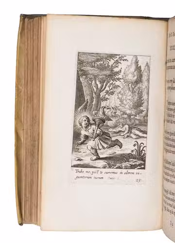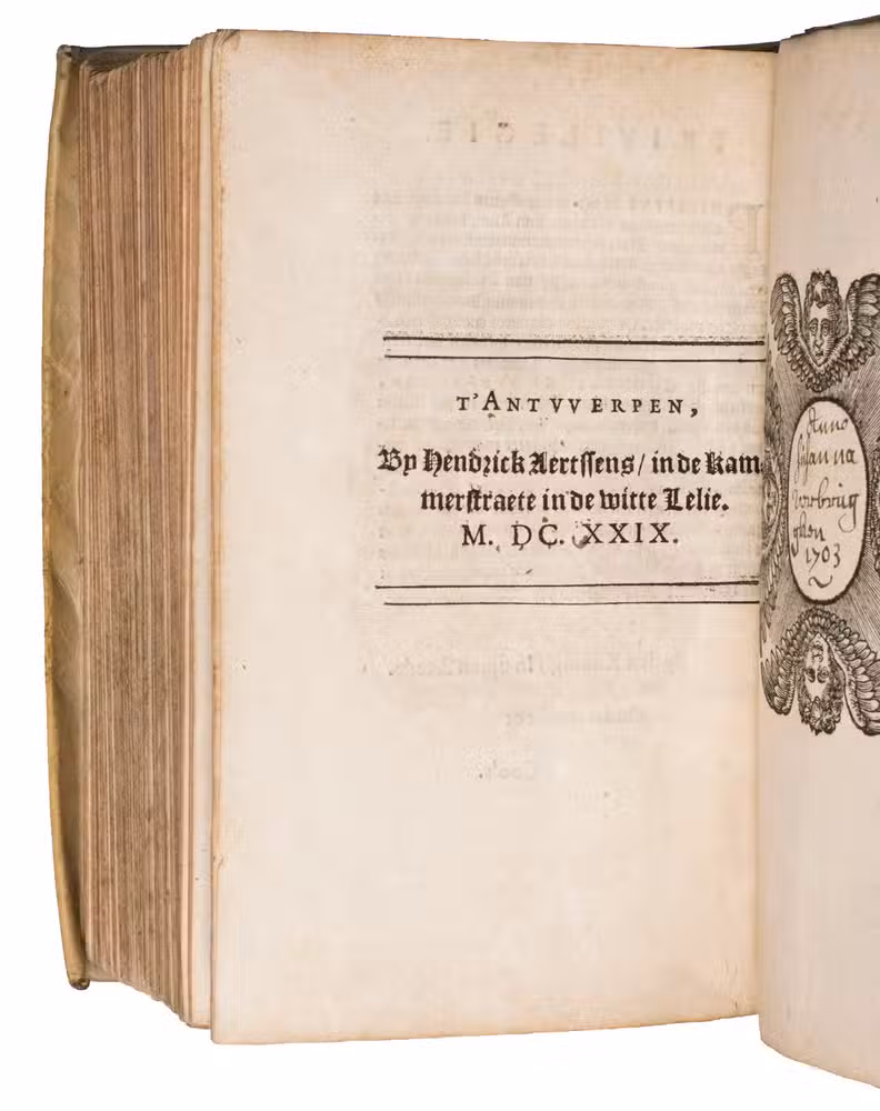 (Colophon:) Antwerp, Hendrick Aertssens, 1629. 8vo. With an engraved title page, a full-page engraved coat of arms, a full-page ornamental woodcut, 45 full-page engraved emblematical plates by Boëtius à Bolswert, and a woodcut printer's device on the final page. Contemporary overlapping vellum. [16], "604" [=602], [6] pp.