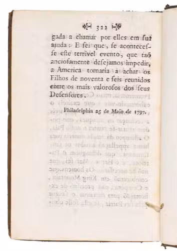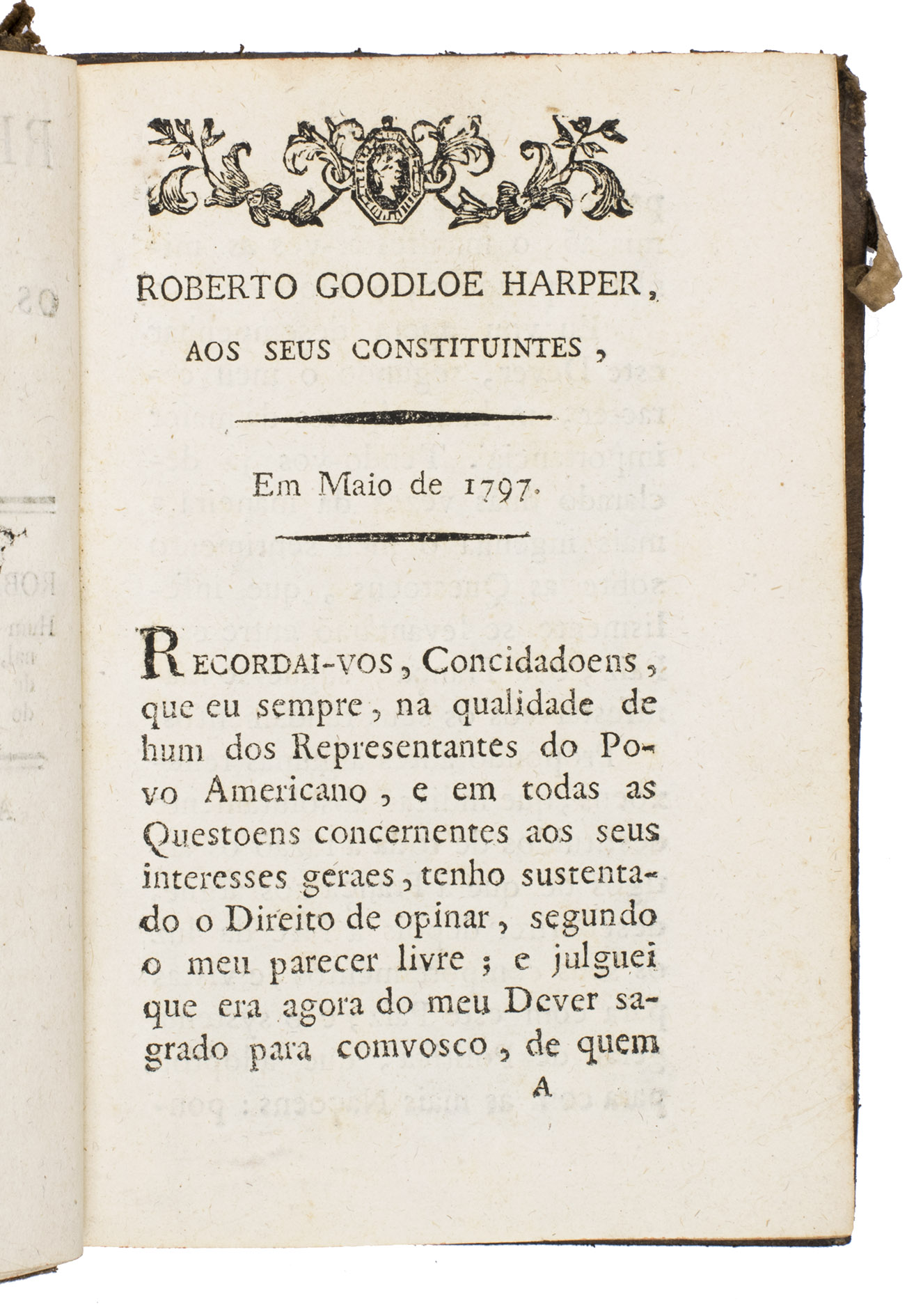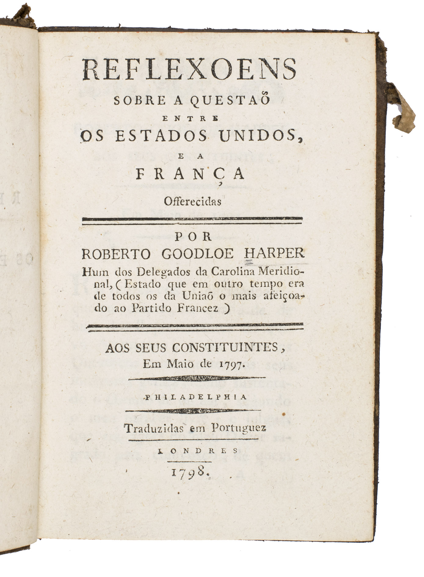 Influential and impassioned defense of Jay's Treaty by Robert Goodloe Harper (1765-1825), a lawyer and politician. The work is also of maritime interest, because of the exhaustive treatment of French, British and American positions and policies on impressment, privateering, and neutral ships and cargoes. First published in Philadelphia as Observations on the dispute between the United States and France it turned out to be an extremely popular work, which had already gone through 19 editions in 1799. The present edition is one of three published translations into Portuguese. Harper, who used to be extremely pro-French when he lived in South Carolina, had changed position when he moved to Philadelphia.