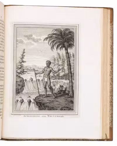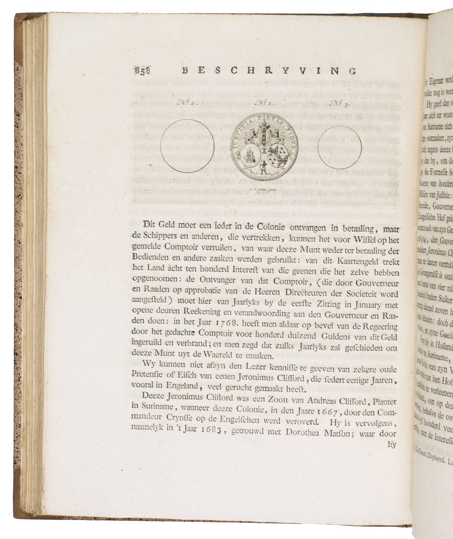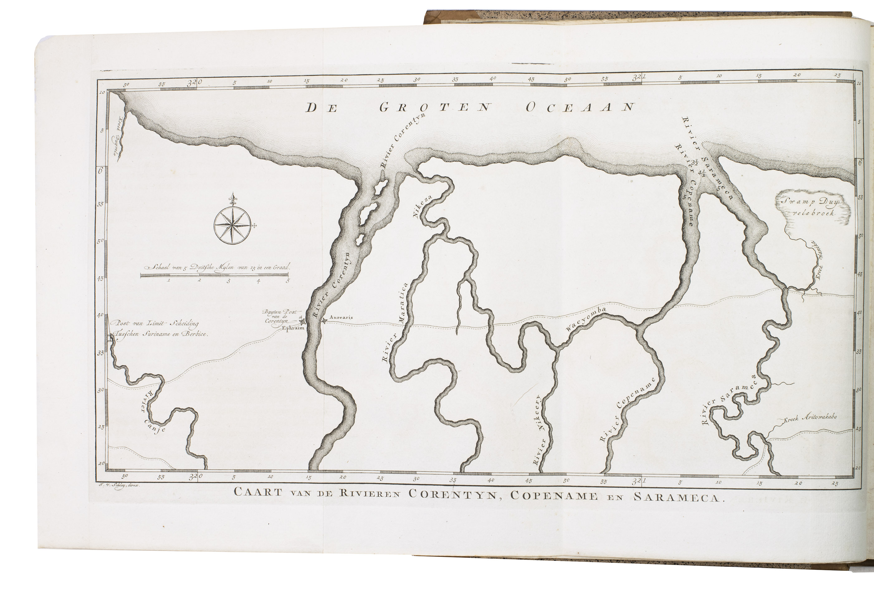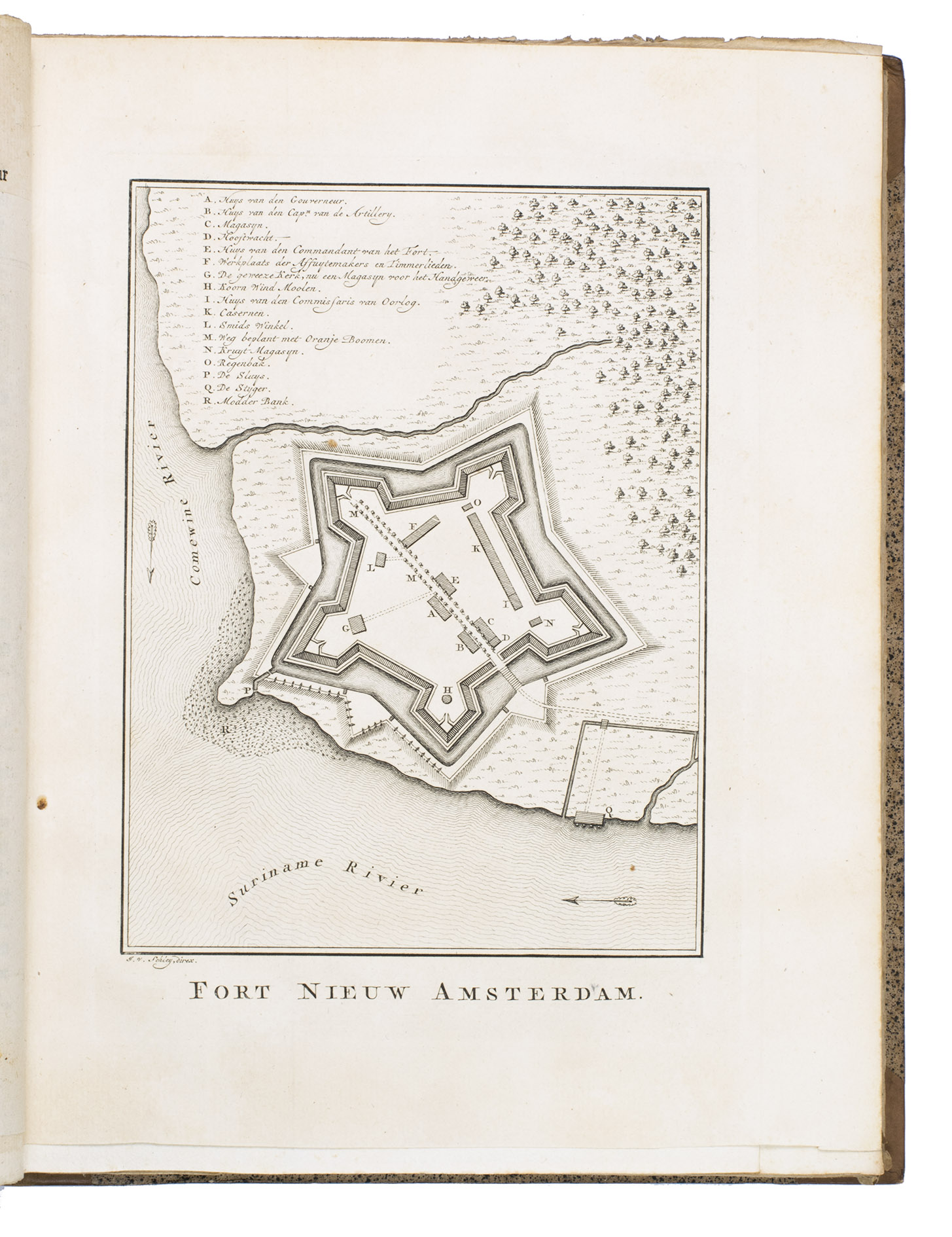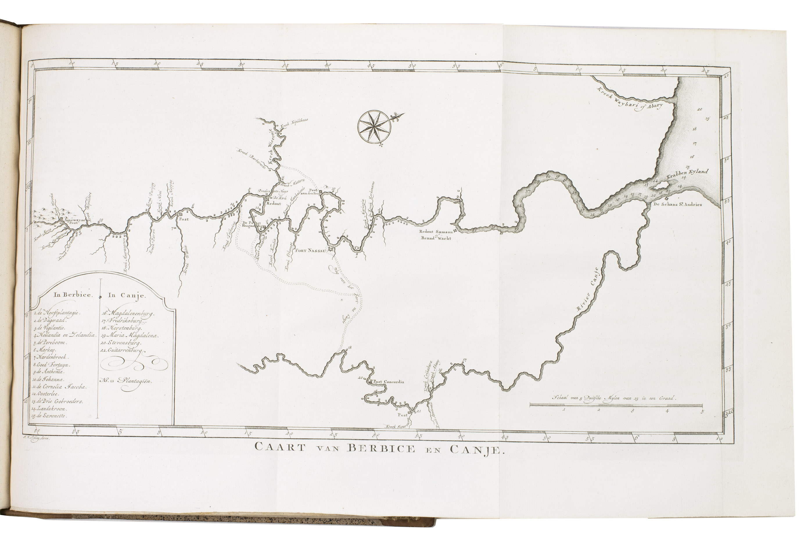 Untrimmed large-paper copy of the first and only edition of the classic work on "Guiana", the North coast of South America, covering primarily modern Guyana, Surinam, parts of French Guyana and northern Brazil. The book contains very interesting and thoroughly accounts of the geography and history of the regions, customs and habits of the natives, flora and fauna; discoveries of the Spanish, French, Portuguese and Dutch voyagers and their settlements and colonization, the commerce of the Dutch West India Company, and the Company of Berbice, the Surinam Society and the slave trade. Warden (Bibliotheca Americana) calls it "by far the best work ever published on the countries described". Several hundred pages provide transcriptions of numerous original documents of the 17th and 18th centuries, including a 1662 land grant proclaimed by Charles II on behalf of English settlers establishing there in 1650, with parallel English and Dutch texts. There are five maps, four plans of forts and towns, three views, and two representations of native men. All are finely engraved by Jacob van der Schley. The engraving in the text shows one coin and two blank circles.