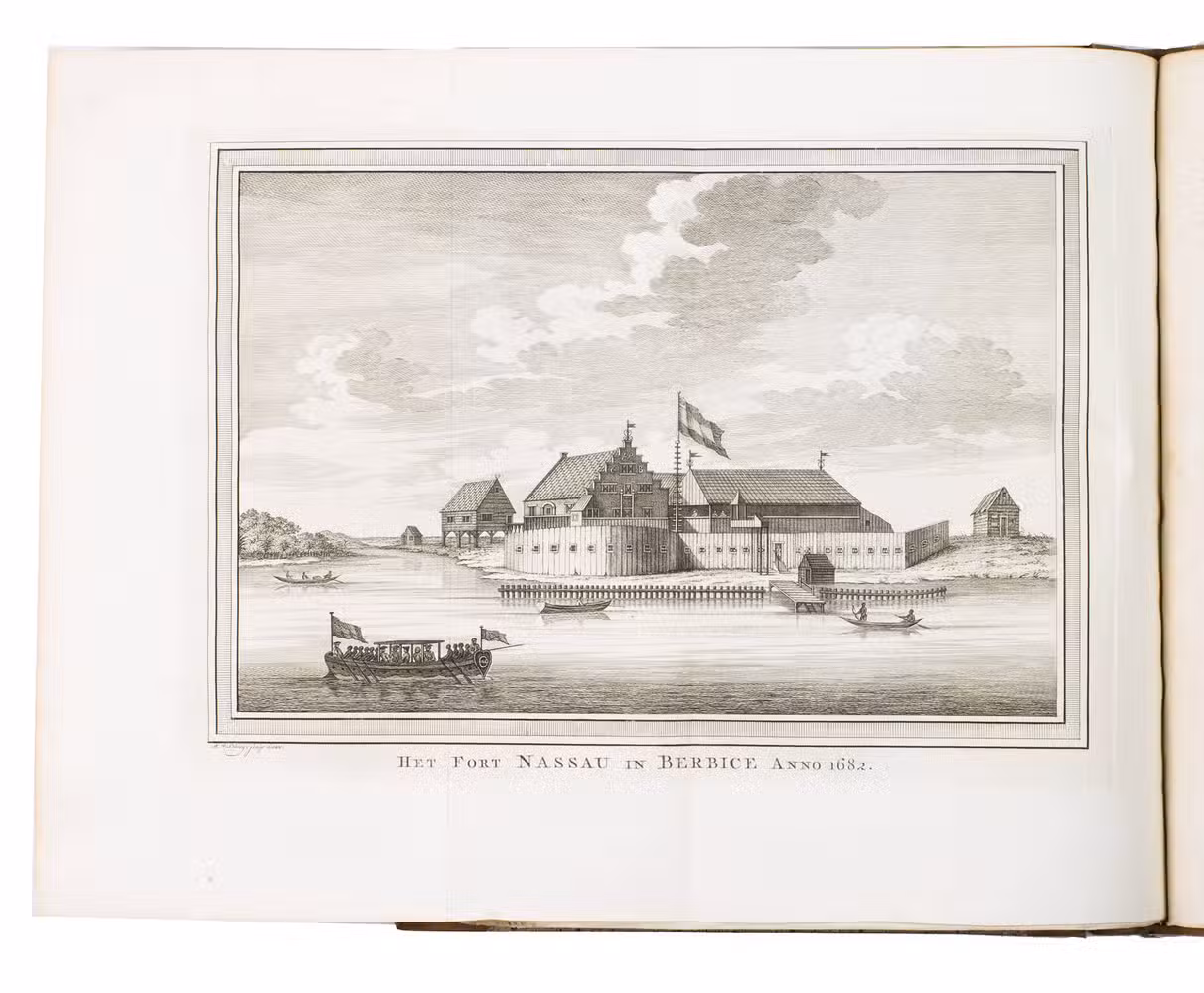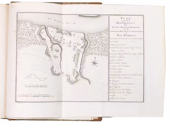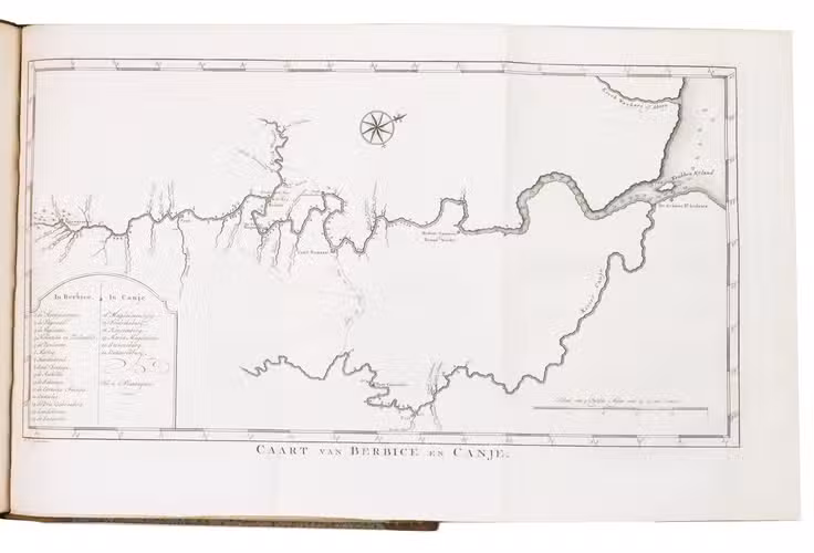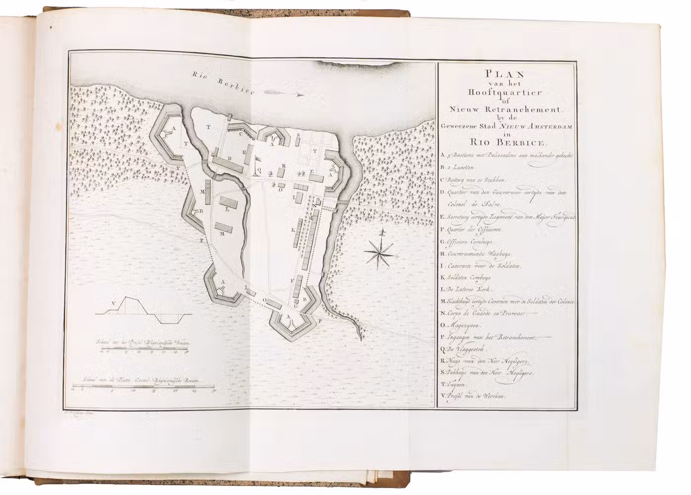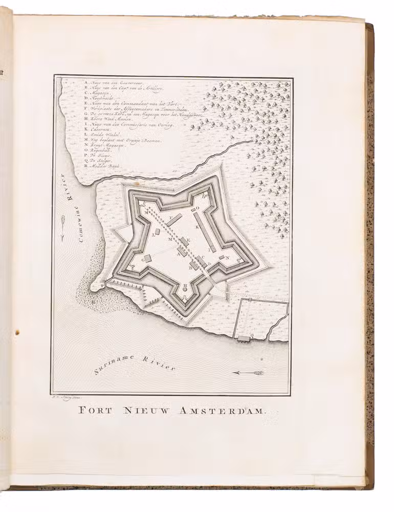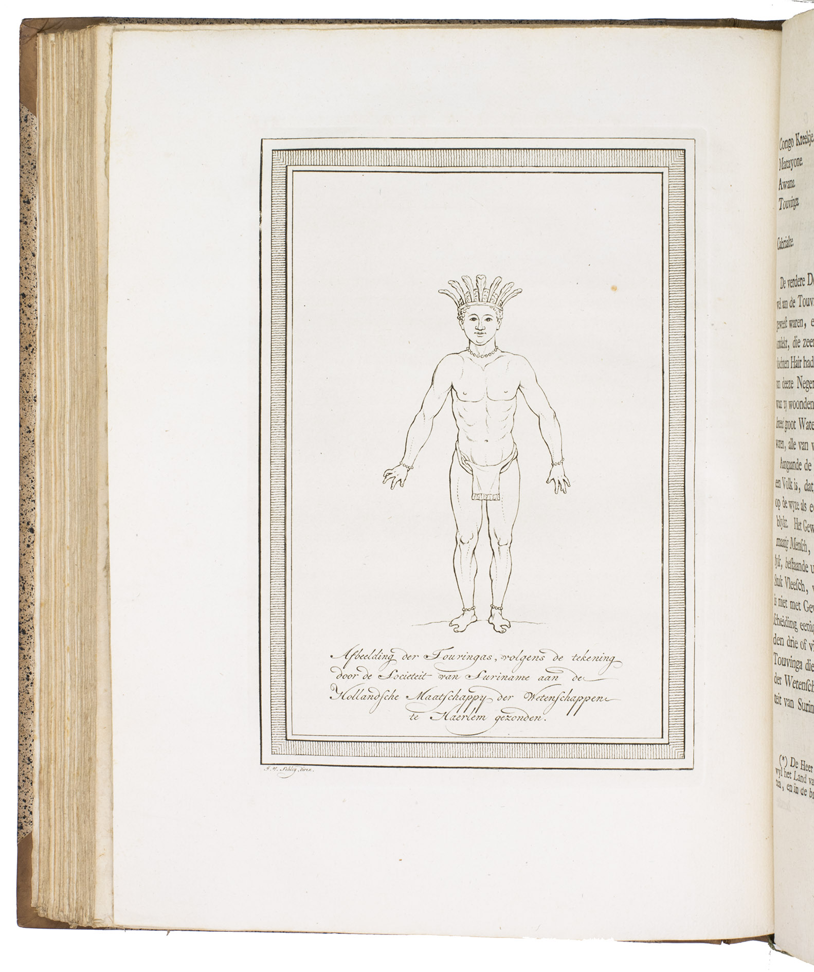 Untrimmed large-paper copy of the first and only edition of the classic work on "Guiana", the North coast of South America, covering primarily modern Guyana, Surinam, parts of French Guyana and northern Brazil. The book contains very interesting and thoroughly accounts of the geography and history of the regions, customs and habits of the natives, flora and fauna; discoveries of the Spanish, French, Portuguese and Dutch voyagers and their settlements and colonization, the commerce of the Dutch West India Company, and the Company of Berbice, the Surinam Society and the slave trade. Warden (Bibliotheca Americana) calls it "by far the best work ever published on the countries described". Several hundred pages provide transcriptions of numerous original documents of the 17th and 18th centuries, including a 1662 land grant proclaimed by Charles II on behalf of English settlers establishing there in 1650, with parallel English and Dutch texts. There are five maps, four plans of forts and towns, three views, and two representations of native men. All are finely engraved by Jacob van der Schley. The engraving in the text shows one coin and two blank circles.