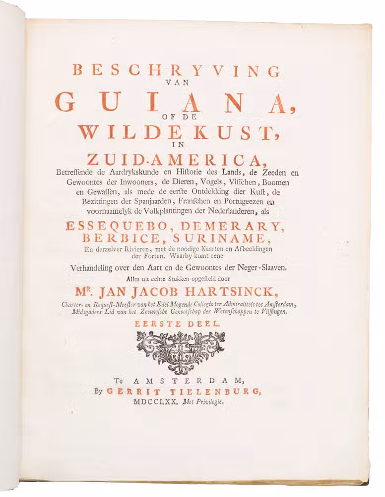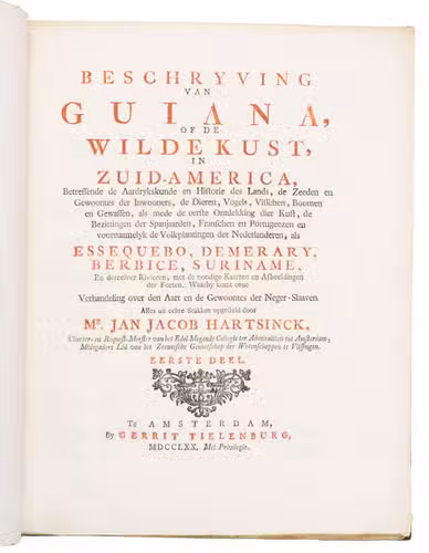 J.J. Hartsinck (1716-1779) was an official of the admiralty in Amsterdam and a member of the Zeeland Academy of sciences; later he became a director of the Dutch West India Company. He had ready access to many documents which are now lost, and he also made extensive use of the papers of his father, who had been director of the Surinam Society for 25 years, and of oral and manuscript accounts by several local officials. For these reasons, his book will always remain an essential primary source for the history of the regions.