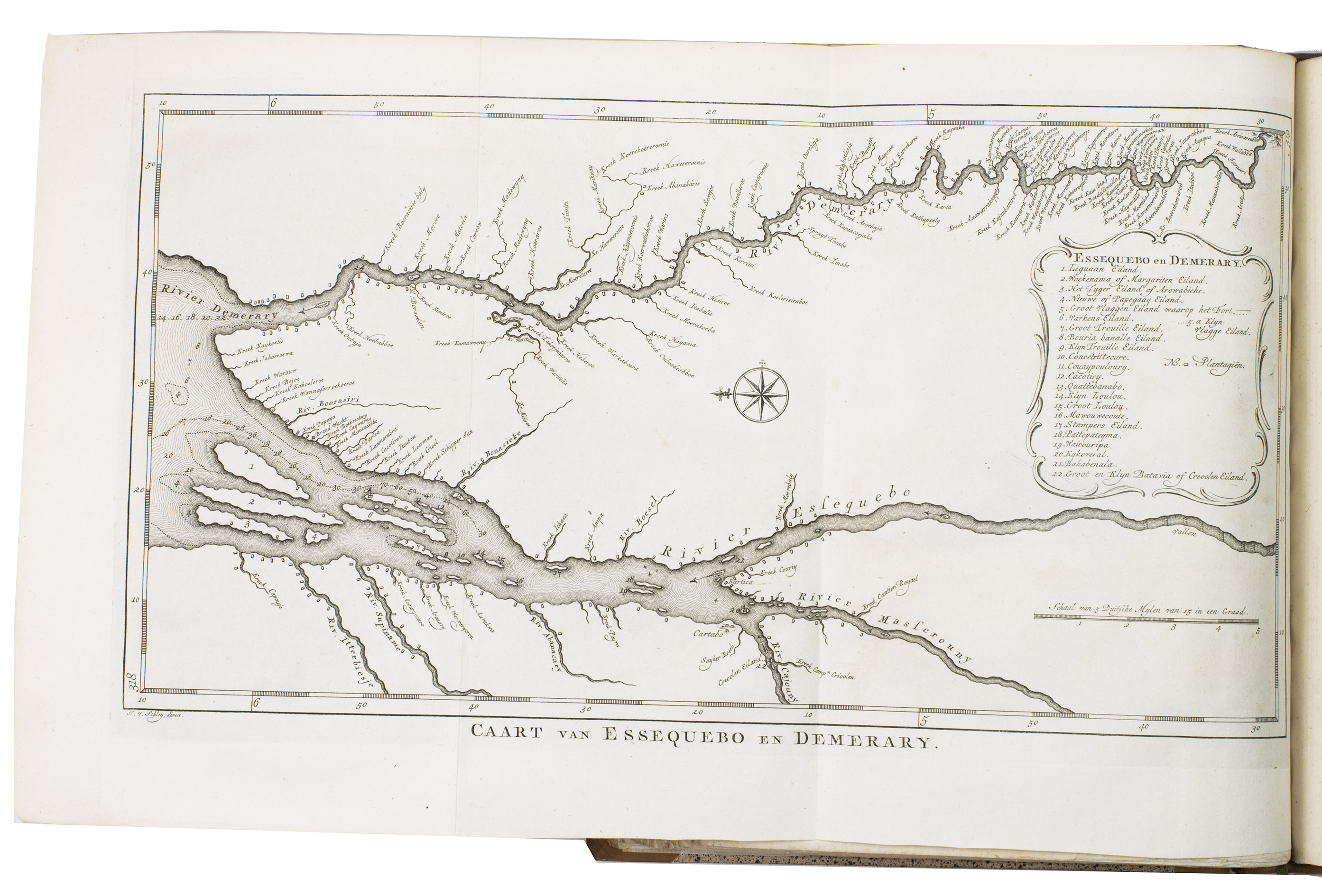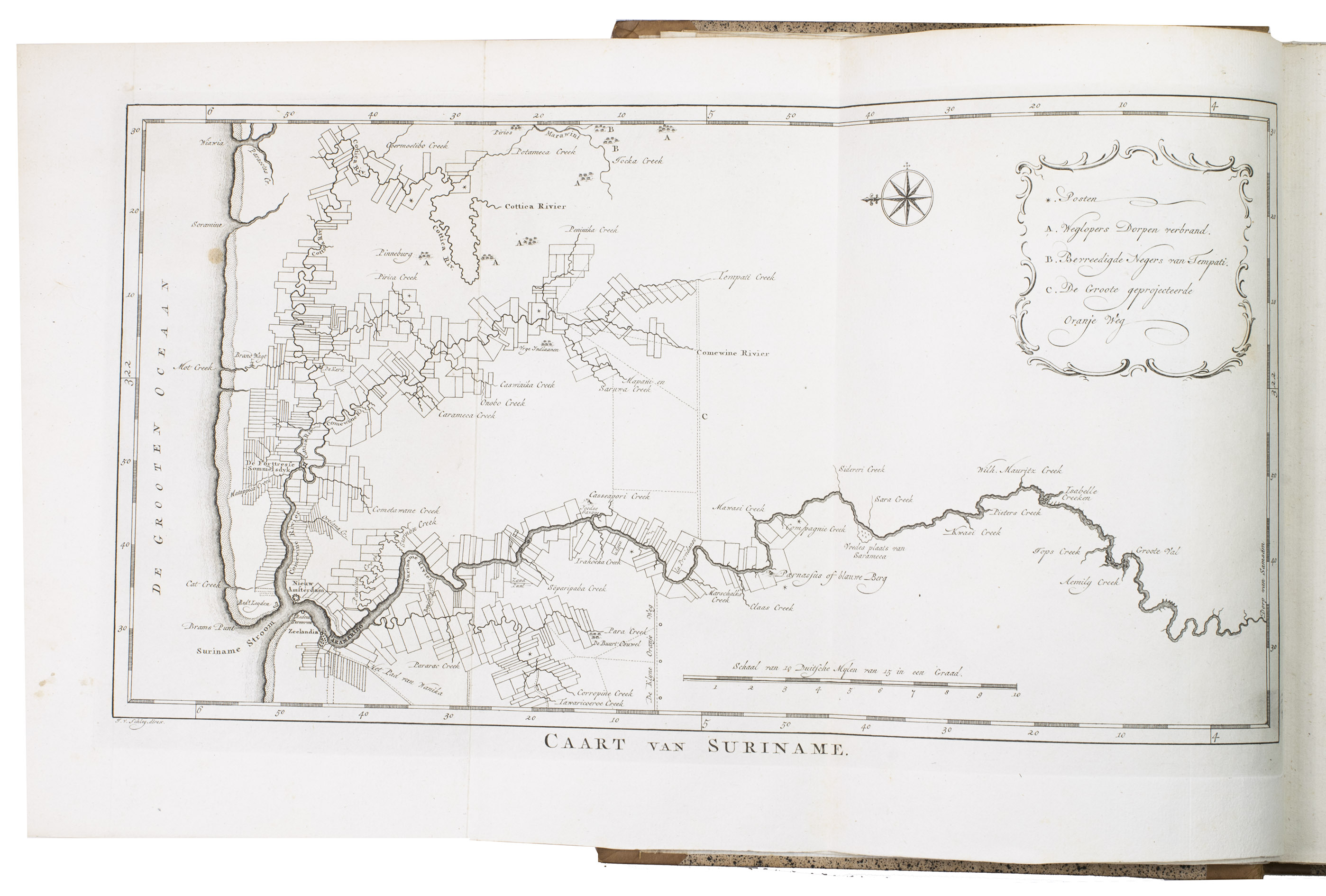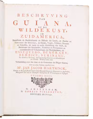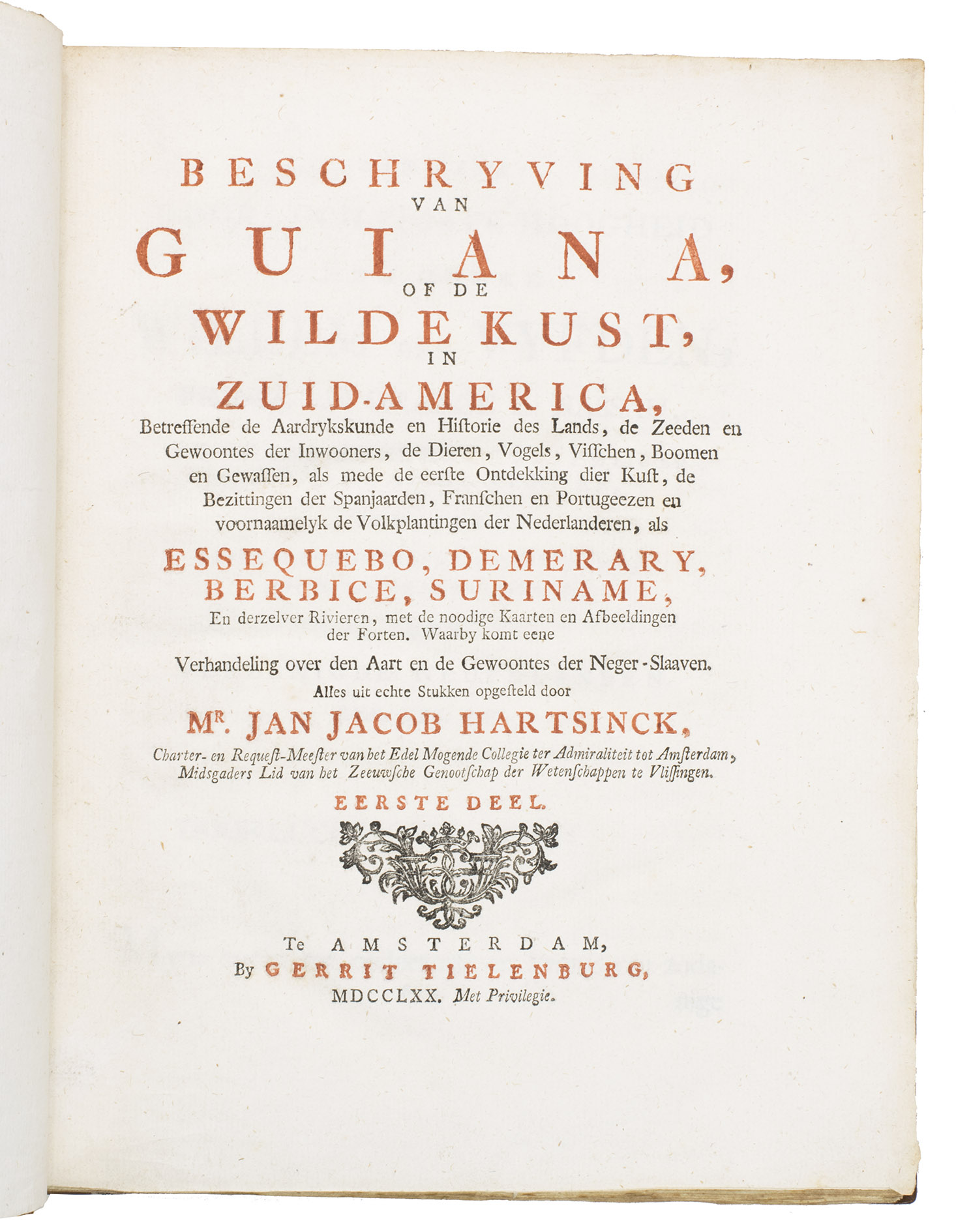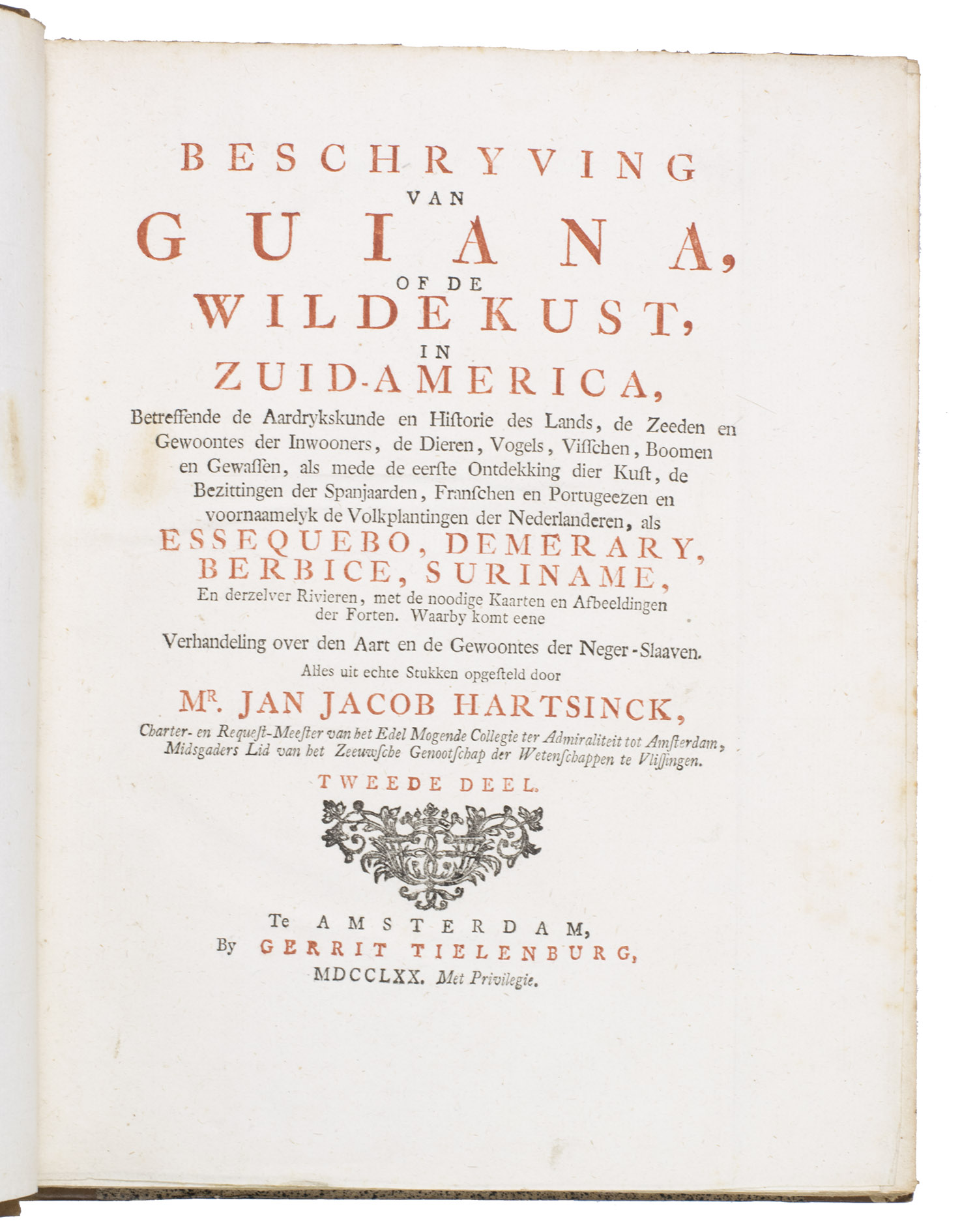 This copy has always been in the same family, never removed from the library and is untouched by the trade. Fine and clean copy as it was in 1770, only slightly browned in the first half of the first volume. An uncut large paper copy in very good condition. JCB (1700-1800) 1742; JFB H-41; Sabin 30712; STCN 204348471 (13 copies, incl. 5 incomplete); Suriname-catalogus 2560; Tiele 457; not in Borba de Moraes; Church; Eberstadt; Streeter.