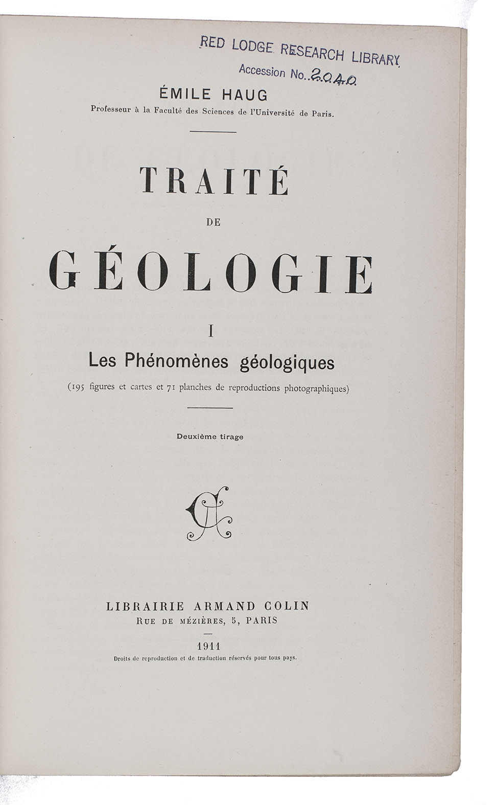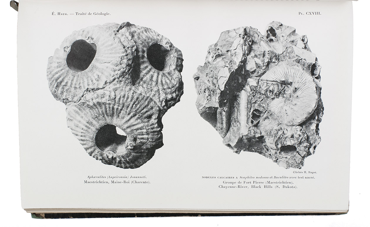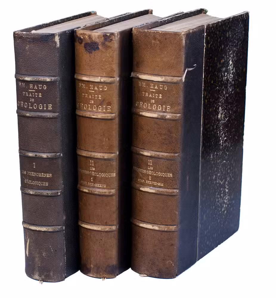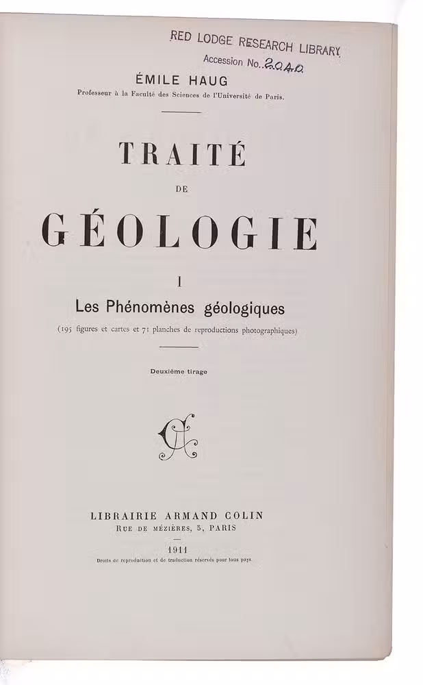 Much cited work on geology, with volumes 2 and 3 in the first printing, dated "1908-1911" on the title-pages, and volume 3 in the second printing, dated 1911 (the first printing of volume 1 appeared in 1907). Written by the French geologist and palaeontologist Émile Haug (1861-1927), best known for his contributions to the theory of geosynclines (crustal warps), which can be found in the present work and remained the accepted view for sixty years. Haug's work stands on the border between geology and geography. Robert Dietz challenged his theory of geosynclines ca. 1970 in the light of plate tectonics and new empirical data. As a result many now use the term geoclines instead of geosynclines.