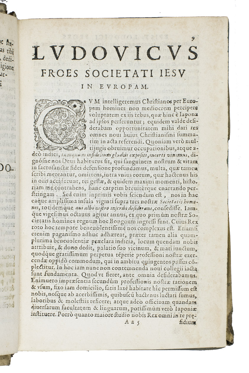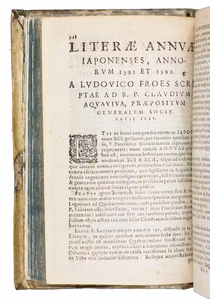 Browned throughout, especially the title page, and somewhat soiled in the margins. Endpapers at the back with a large water stain and some holes. Lacking 3S4 (blank) and 3T1-3T2, the latter two present in facsimile. A fair copy. Alden & Landis 605/57; Alt-Japan Katalog 646; Cordier, Japonica, cols. 246-248; De Backer & Sommervogel IV, p. 165, Hay 12; Laures 271; Medina, Bibl. Hispano-Americana II, 498; Palau 112581; Sabin 31016; Streit V, 58; STCV 6619980; Takahashi 1-71; Ternaux-Compans 931.
