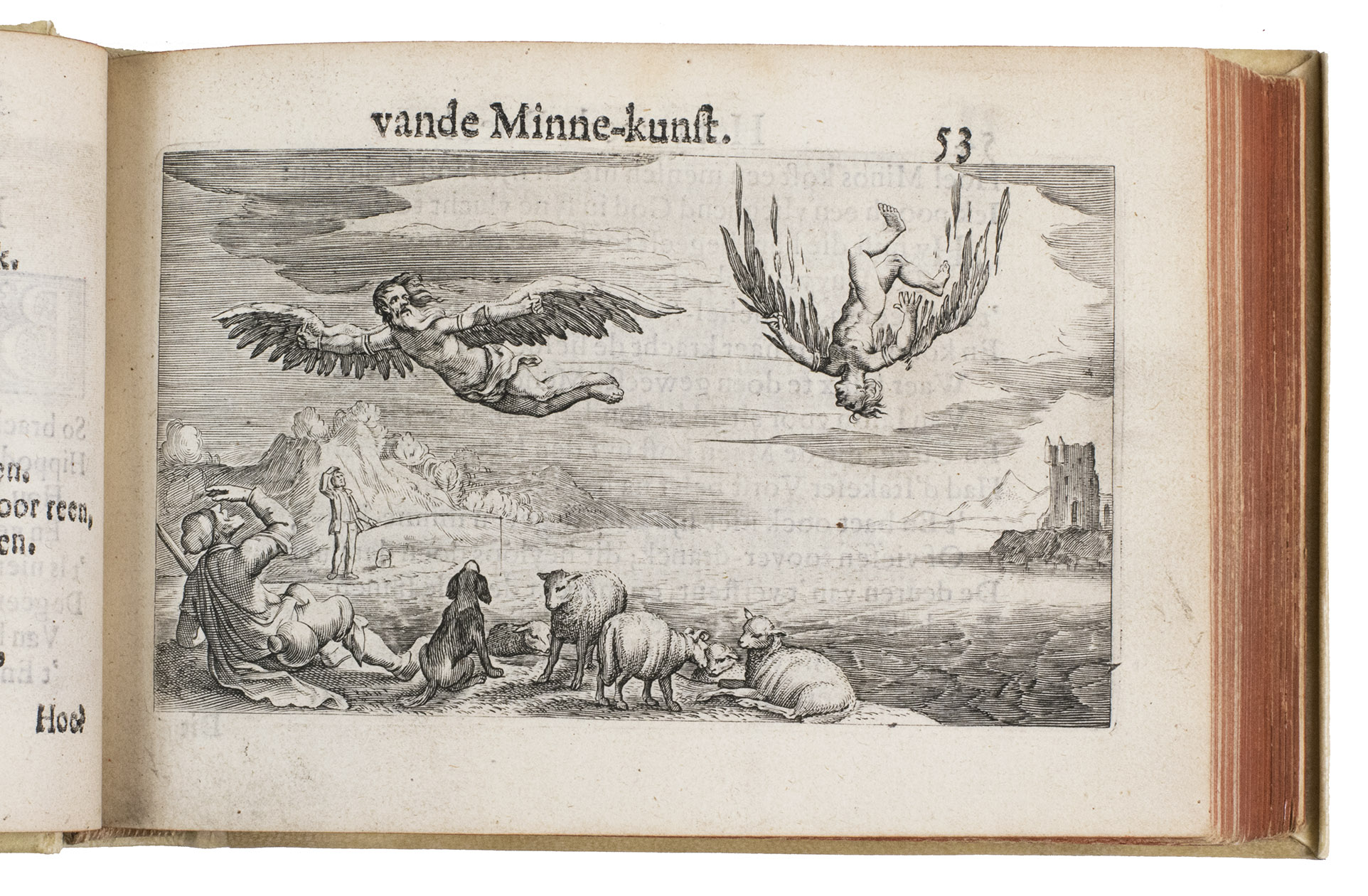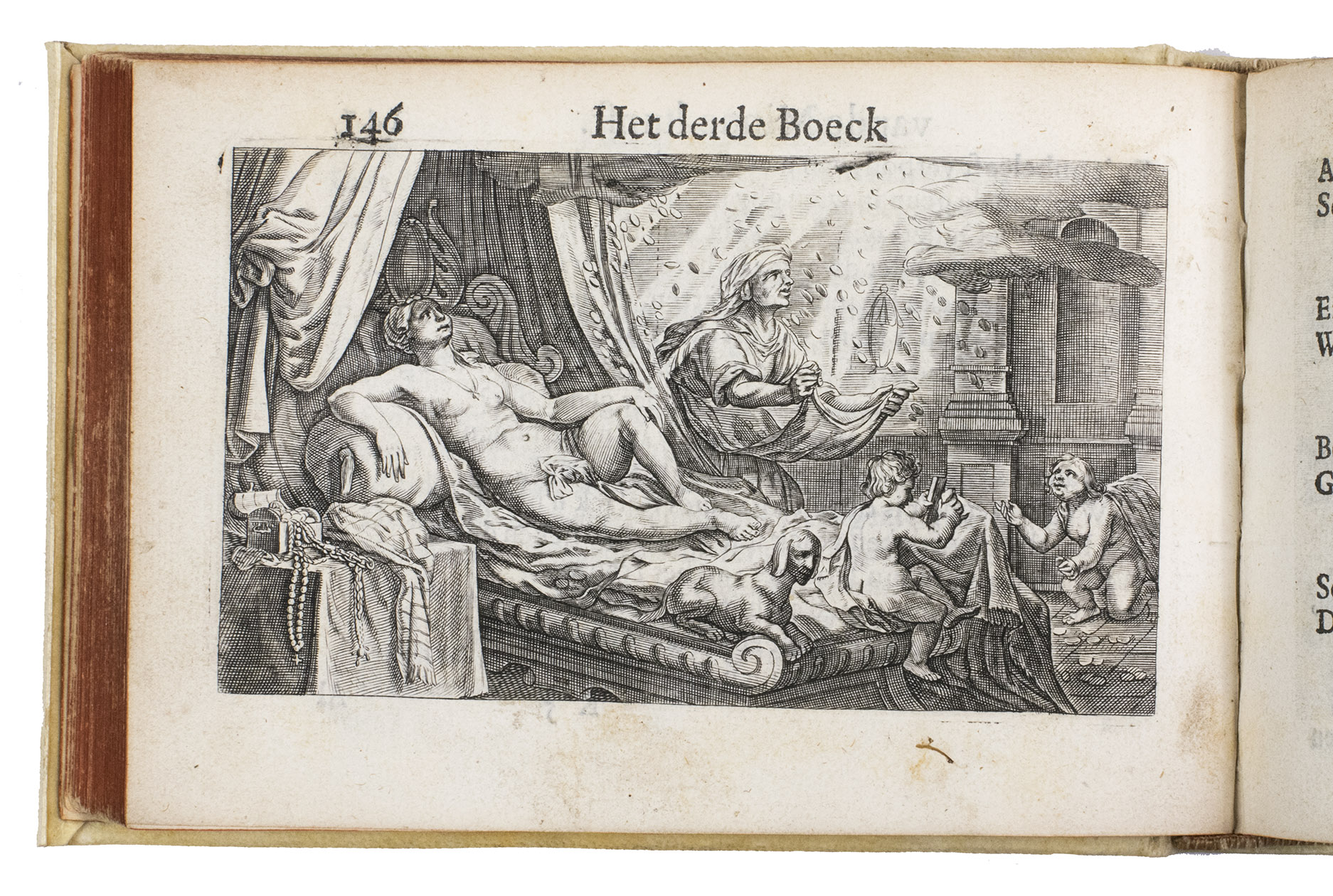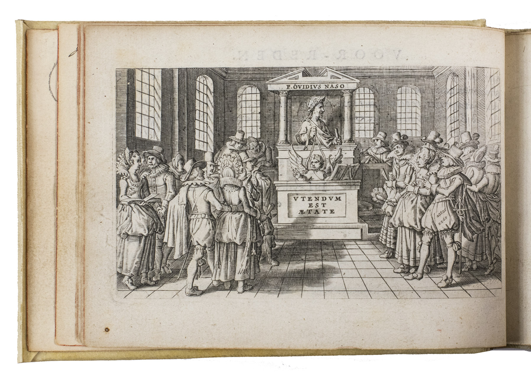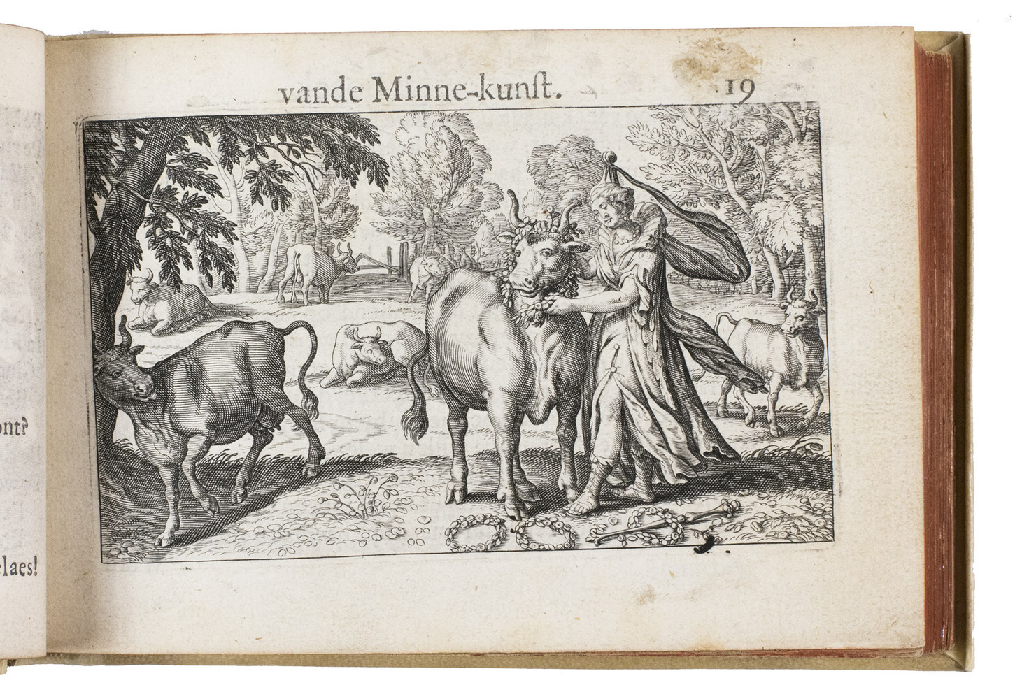 The first contains a poetic adaptation of Ovid's Ars Amatoria, beautifully illustrated with 12 plates, including the frontispiece with the motto "sine Cerere et Baccho friget Venus", by one of the gifted artists of the Golden Age of Dutch book illustration, Pieter Serwouters (1586-1657).