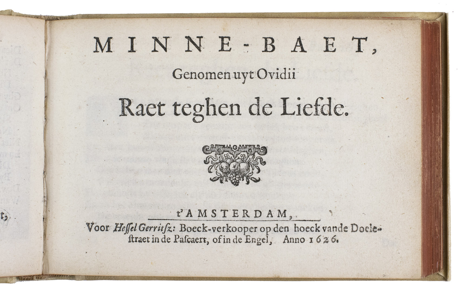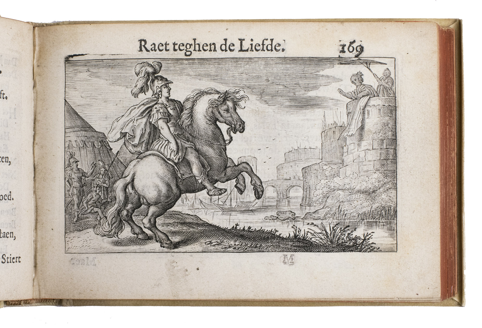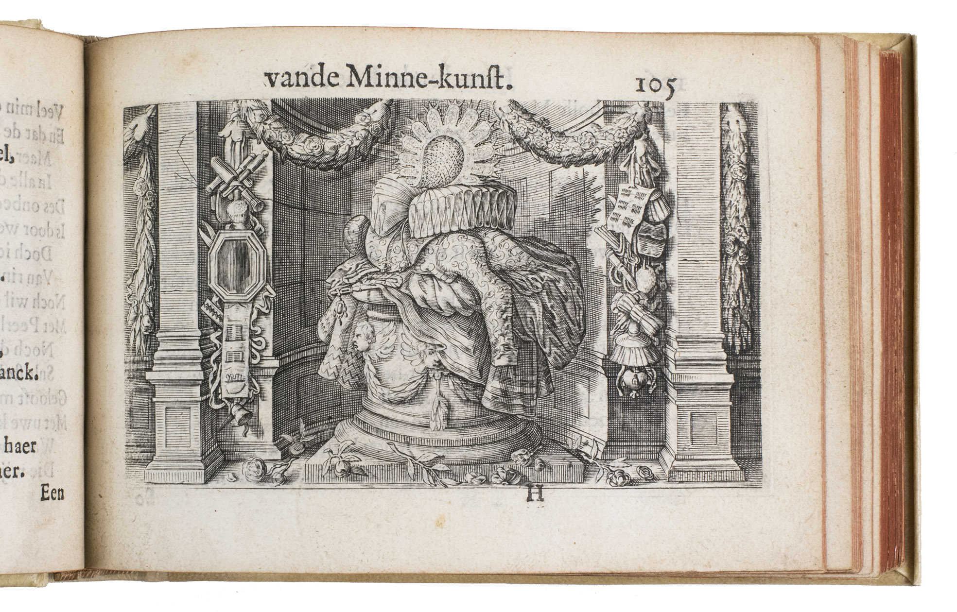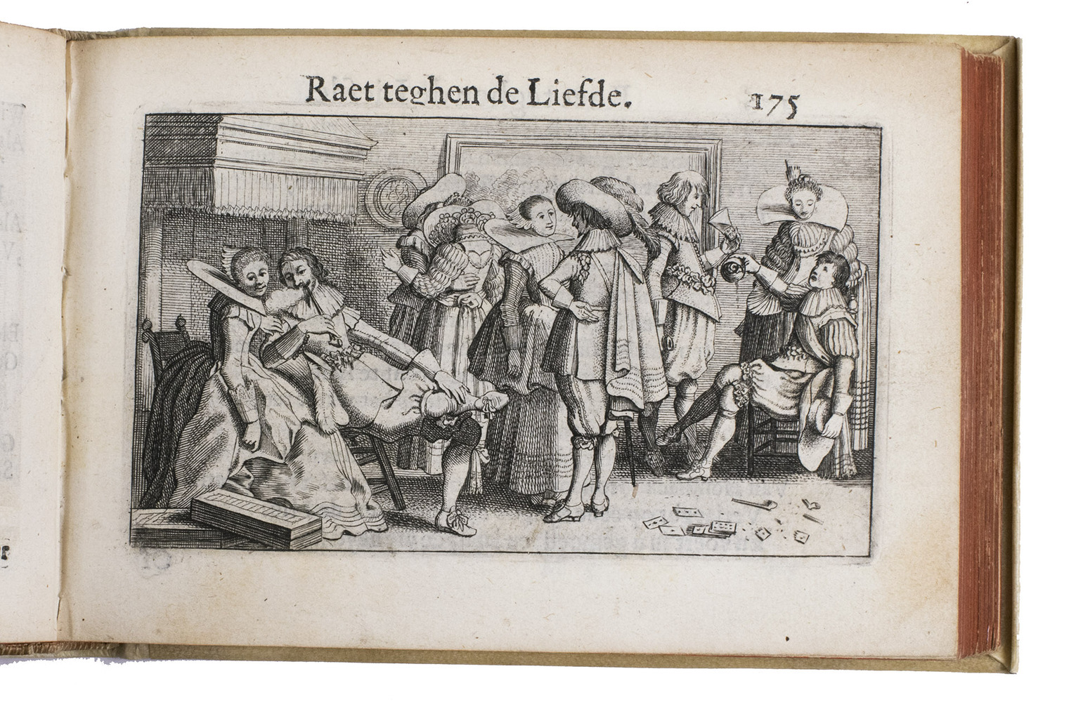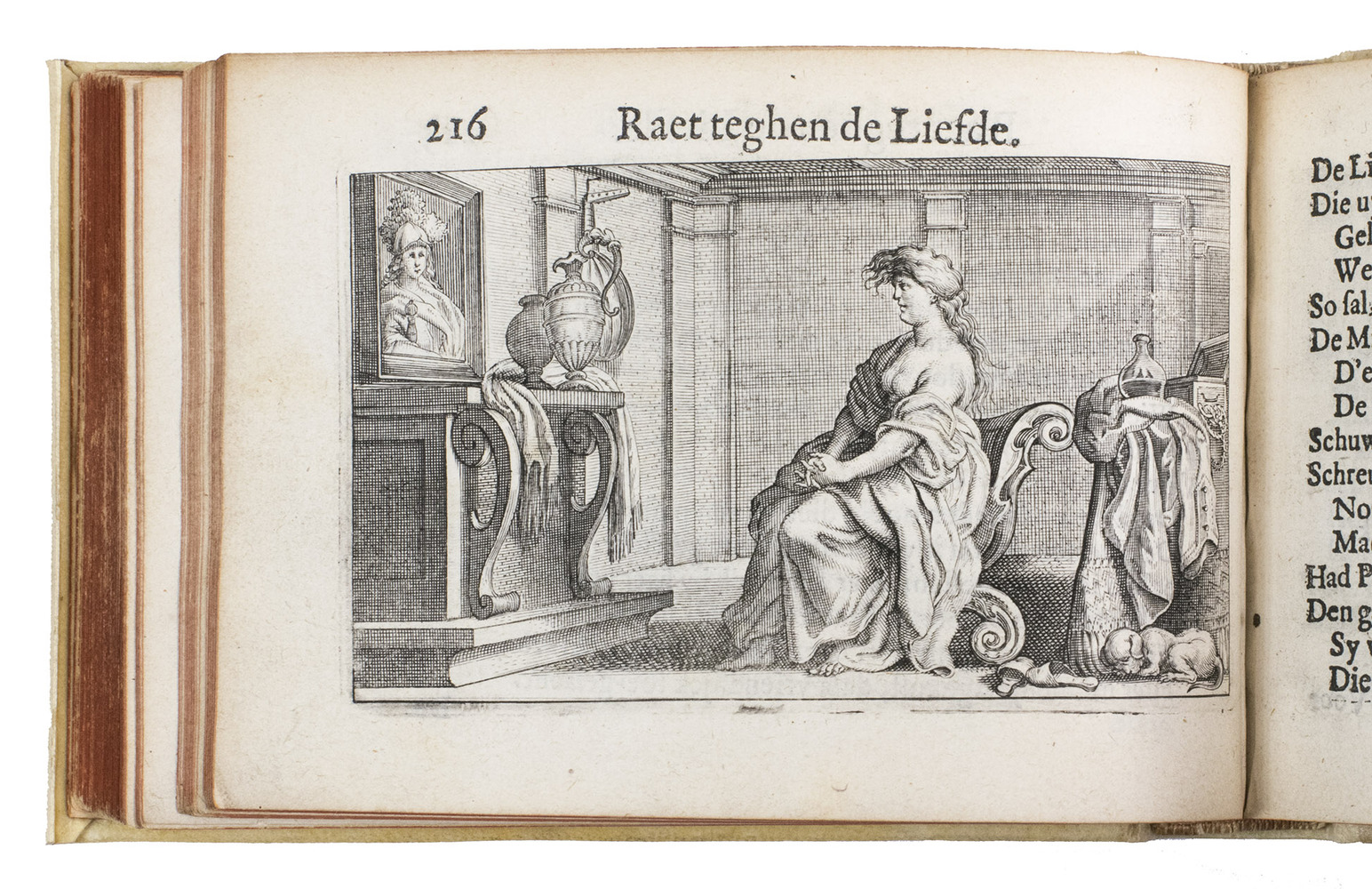 The first contains a poetic adaptation of Ovid's Ars Amatoria, beautifully illustrated with 12 plates, including the frontispiece with the motto "sine Cerere et Baccho friget Venus", by one of the gifted artists of the Golden Age of Dutch book illustration, Pieter Serwouters (1586-1657).
