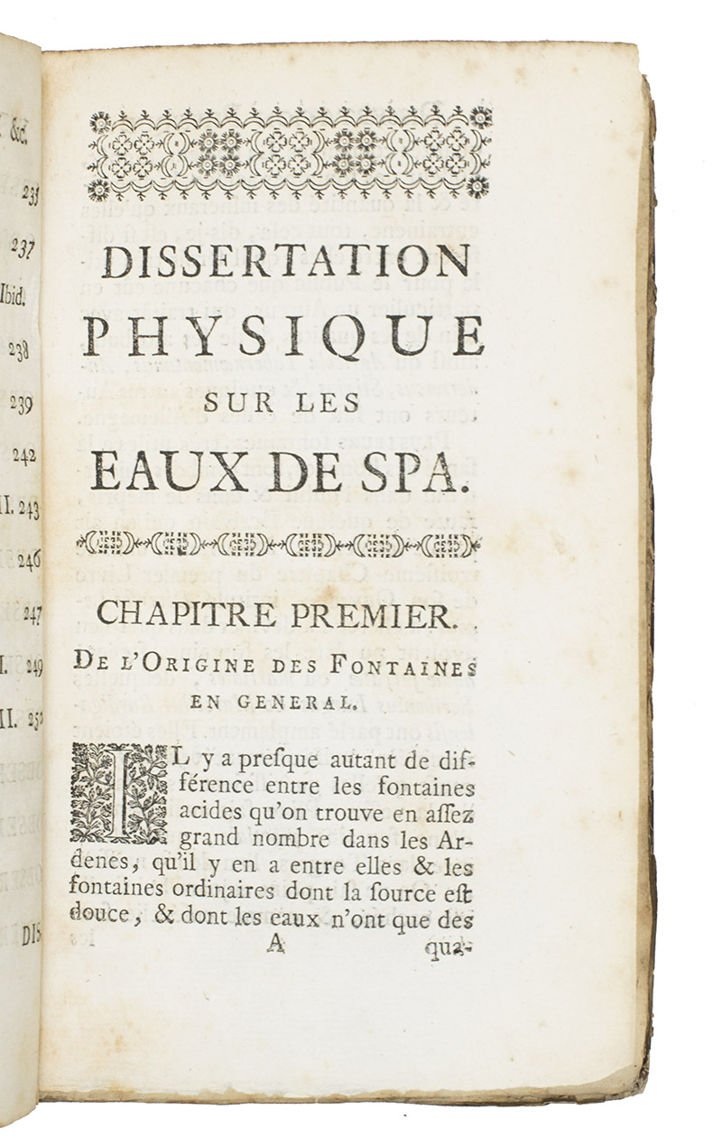 Henri de Heers (1570-1636) was a physician from Liege who first published his Spadacrene, hoc est Fons Spadanus in Latin in 1614. After many editions in both Latin and French, another physician from Liege, Werner Chouet edited a corrected and enlarged French edition in 1739 in The Hague (our copy). Chouet was an expert who had written a study on the waters of Spa and other places himself: La connoisance des eaux minerals dAix-la-Chapelle, de Chaud-Fontaine, & de Spa (1714). To the present edition of Heers book he added not only his own remarks and commentaries, but also the Latin annotations Heers had entered in his first Latin edition.