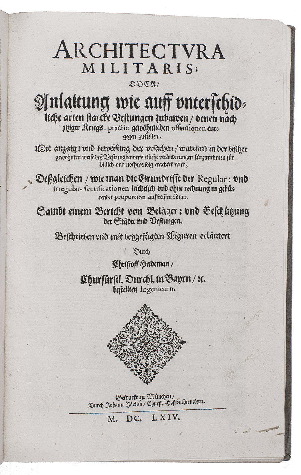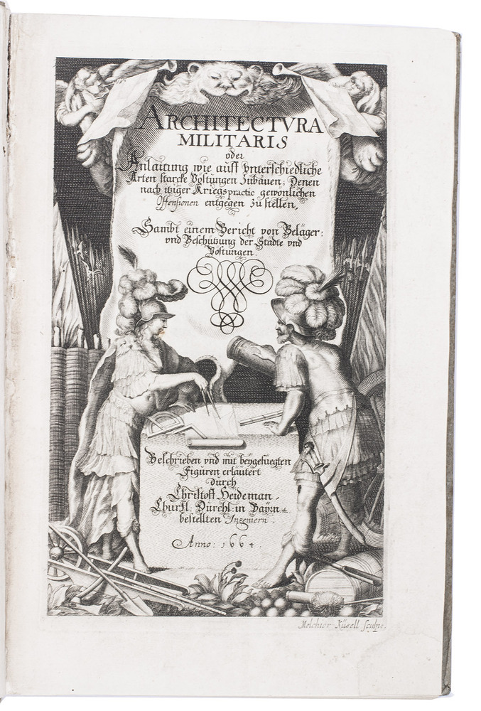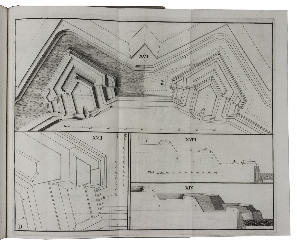 First edition of an important German work on fortification, with 27 folding plates. It forms a complete handbook in three parts, the first covering fortifications of both regular and irregular form, the second covering siege techniques and the third the defence of cities and fortifications. Christoph Heidemann (d. 1684) was military engineer to the Elector of Bavaria. He was a follower of Daniel Specklin (1536-1589), but introduced many improvements in technique and equipment. Like Antoine de Ville (1596-1656), he strongly recommends the construction of orillons at the corners of fortifications to cover the flanks, an idea the Dutch school had rejected. The 168 fine-line engravings include many fortification plans, sections, elevations and views, mostly with scales, but also illustrations of building techniques and equipment, palisades, tunnels, facilities for supplying water, etc. The last plate is signed by Stenglin, perhaps indicating that he engraved them all.