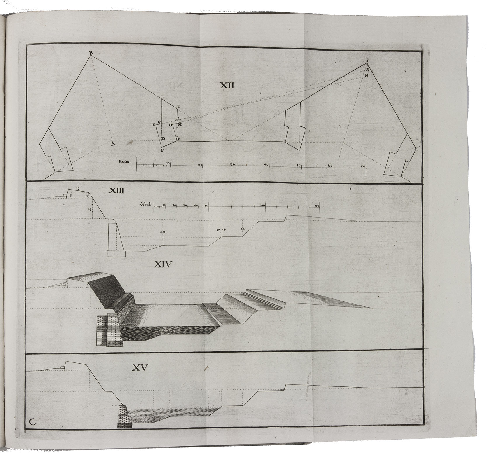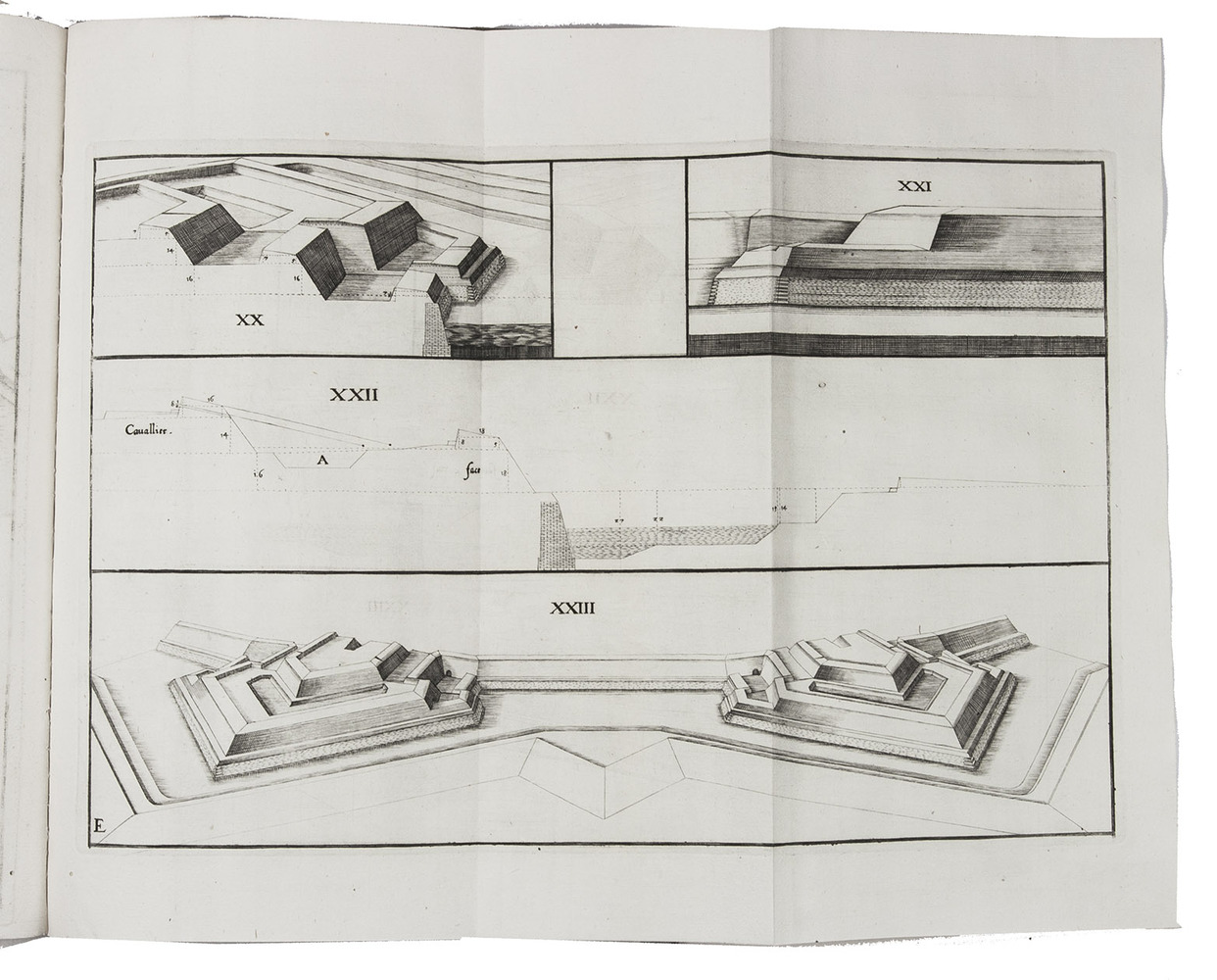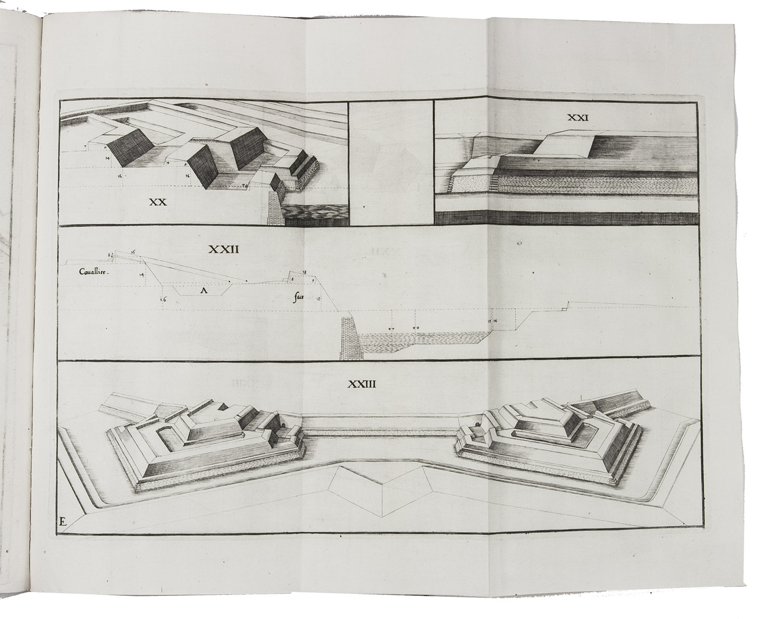 First edition of an important German work on fortification, with 27 folding plates. It forms a complete handbook in three parts, the first covering fortifications of both regular and irregular form, the second covering siege techniques and the third the defence of cities and fortifications. Christoph Heidemann (d. 1684) was military engineer to the Elector of Bavaria. He was a follower of Daniel Specklin (1536-1589), but introduced many improvements in technique and equipment. Like Antoine de Ville (1596-1656), he strongly recommends the construction of orillons at the corners of fortifications to cover the flanks, an idea the Dutch school had rejected. The 168 fine-line engravings include many fortification plans, sections, elevations and views, mostly with scales, but also illustrations of building techniques and equipment, palisades, tunnels, facilities for supplying water, etc. The last plate is signed by Stenglin, perhaps indicating that he engraved them all.