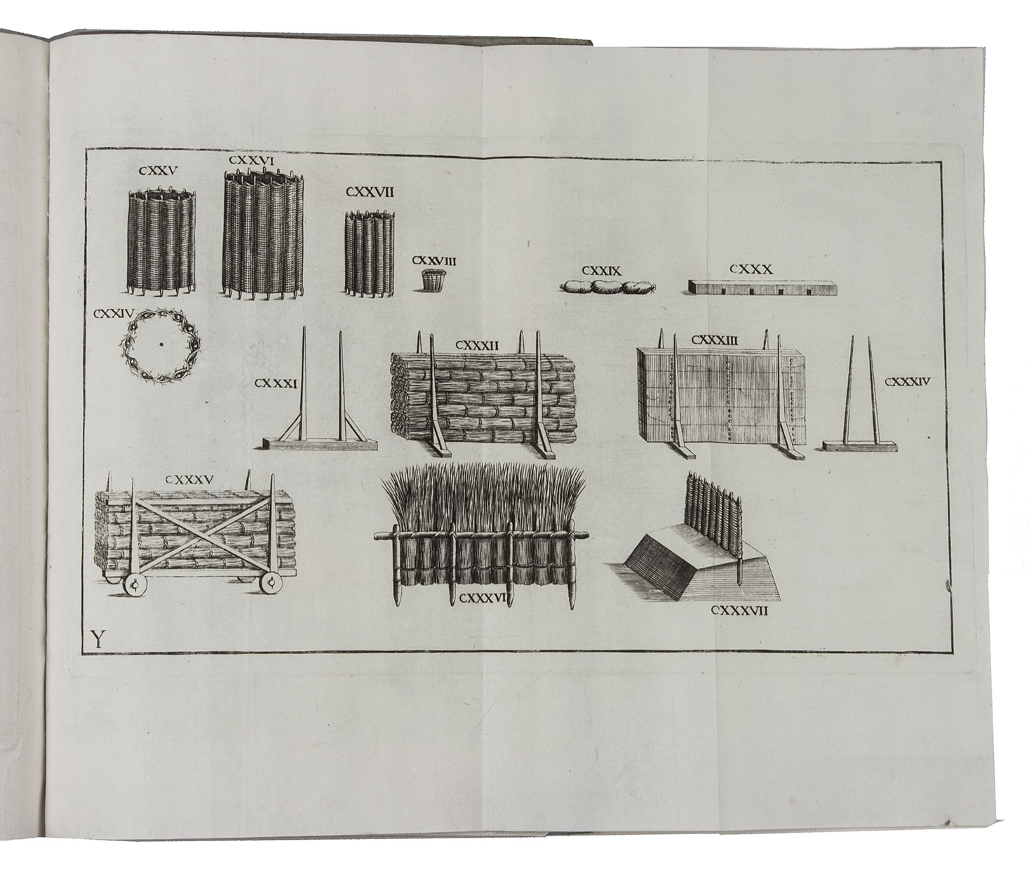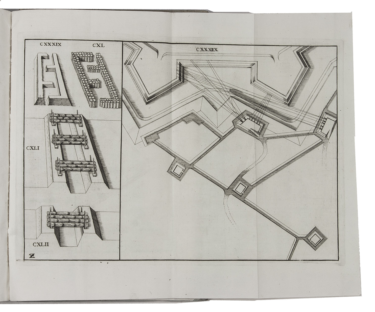 With some worm holes in the gutter and a stain at the foot of the gutter, both mostly confined to the margins but with two small holes in the background of the engraved title-page, an occasional hole affecting a letter of the text, and with a marginal chip in the last text leaf, but otherwise in very good condition. Lacking the blank leaves at the end of parts 1 and 2. Binding slightly rubbed, but otherwise good. An important handbook of fortification, with extensive and very detailed illustrations. Berlin Kat. 3531; Jähns, p. 1343; VD17, 23:294435N; not in Sloos.