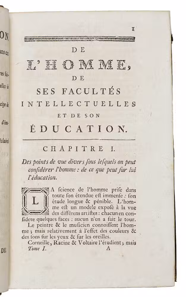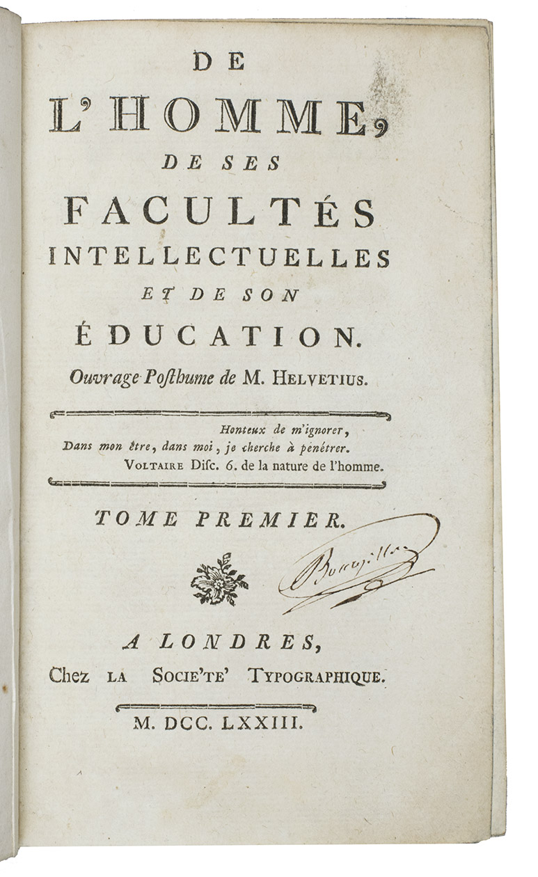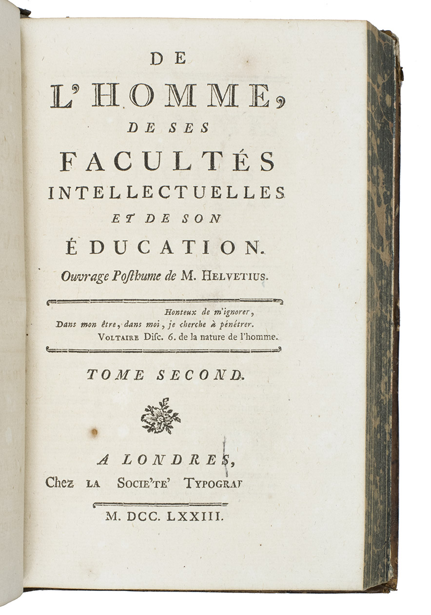 Third (or second?) edition of one of the key works of the Radical Enlightenment, published in the same year as the first edition. The author had evoked huge outcry with the publication of De L'esprit (1758), a carefully argued essay on the mind, in which he roundly rejected metaphysics and the idea of Truth, replacing Christian morals by purely utilitarian ethics and stressing the importance of education as the key to moral behaviour. In De l'homme, Helvétius expanded and clarified his views, provoking even Diderot to write a Réfutation. The present edition was most likely printed in France, and, as Smith argues, it was probably this edition that the Paris Parliament condemned on 10 January 1774.