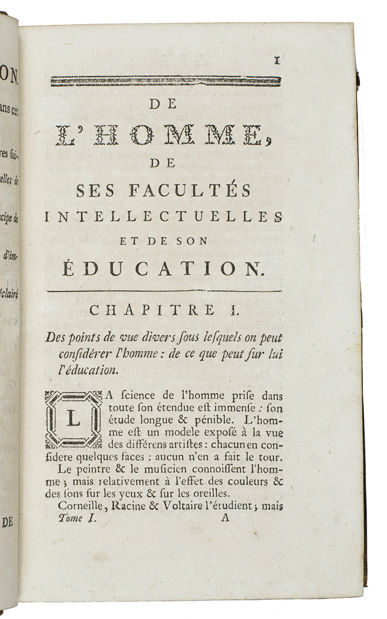 Binding slightly rubbed; top of spine slightly worn. Fine copy. Smith, Bibliography H.3; cf. Cioranescu 33651 (other edition); for Helvétius's philosophy: Blom, A Wicked Company, pp. 126-129.