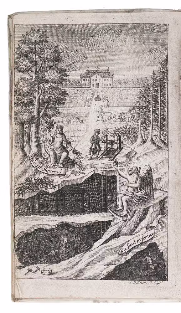 Leipzig, Johann Christian Martini, 1722. 8vo. With engraved frontispiece showing a mining operation, and 9 engraved plates. 18th-century vellum. [10], 671, [17] pp.