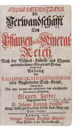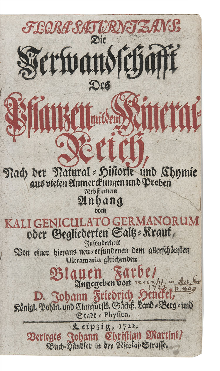 First edition of a study of the relation between plants and minerals, generally recognized as Henckel's first major work. He "described in his many books ... the best early accounts of arsenic, zinc, and a variety of pyrites" (Hoover). Henckel compares the formation of minerals to the growth of plants, used chemical techniques, recognizes the alkali content of plants, already present to some extent in living specimens but increased by burning, and finally describes a method for making blue glass. The illustrations include both living and fossil plants, as well as a shell.