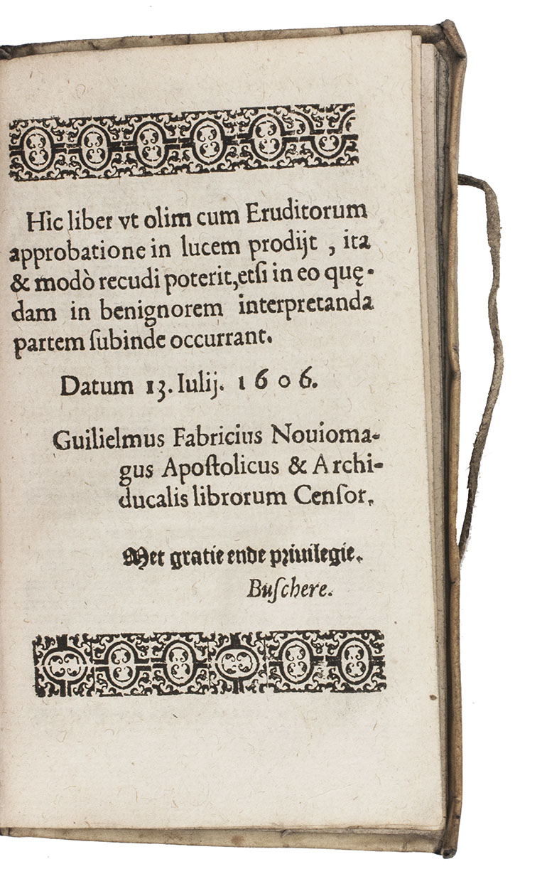 Antwerp, Hieronymus Verdussen, 1607. 8vo. With a woodcut roundel portrait of Jesus on the title-page (signed "A"), a woodcut tailpiece, and decorations built up from cast arabesque fleurons. Contemporary overlapping vellum, leather thong ties. [162], [2 blank] ll.
