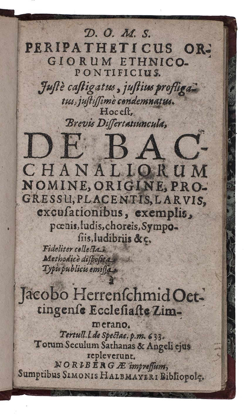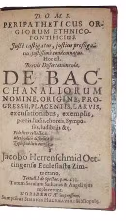 Peripatheticus orgiorum ethnico-pontificius. Justè castigatus, justius profligatus, justissimè condemnatus. Hoc est, brevis dissertatiuncula De Bachanaliorum nomine, origine, progressu, placentis, larvis, excusationibus, exemplis, poenis, ludis, choreis, symposiis, ludibriis, &c.