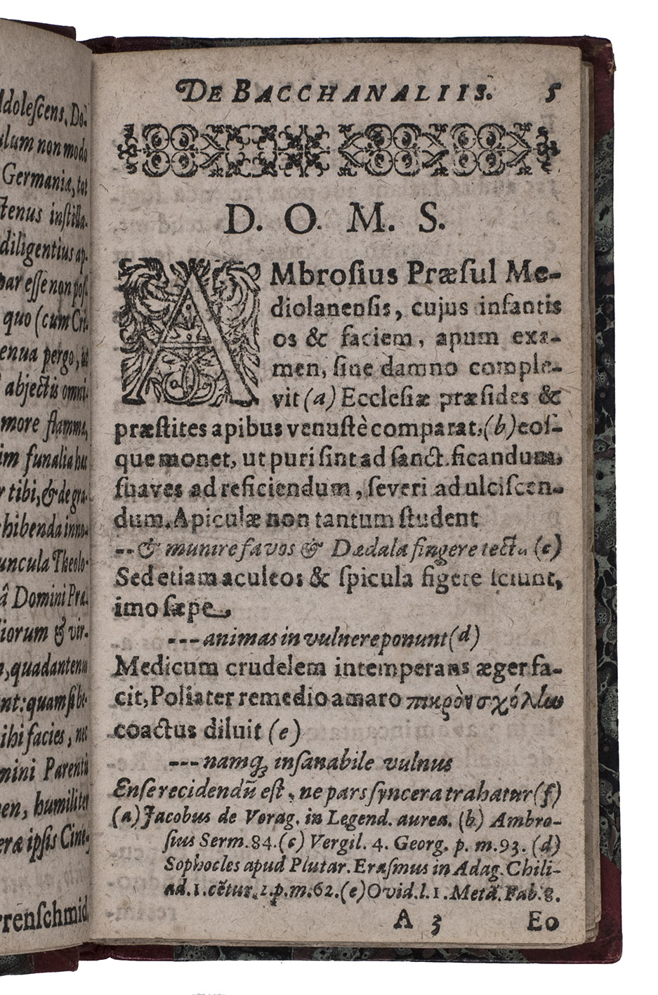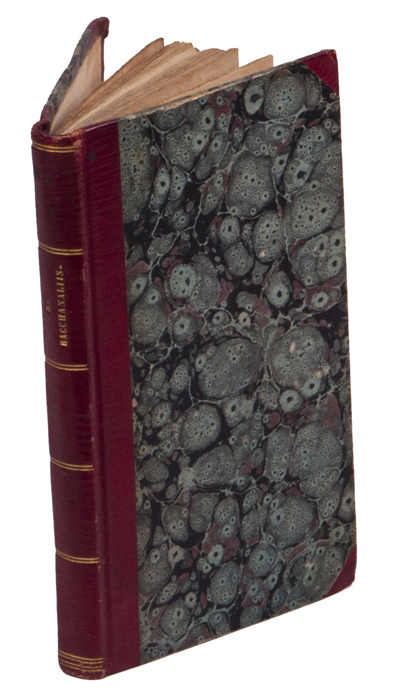 Rare Latin treatise on the Greek Bacchanals with extensive source references. At some points a German translation of a word or sentence is included. At the end is added: "Dissertatiunculae Mantissa. Tentamen-juvenile este quod Autor In Principali-Salana A.D. M.D.C.I. Sub Decanatu D. Petri Piscatoris.. Sub censura D. Thomae Sagittarii", on Bacchus in verse.