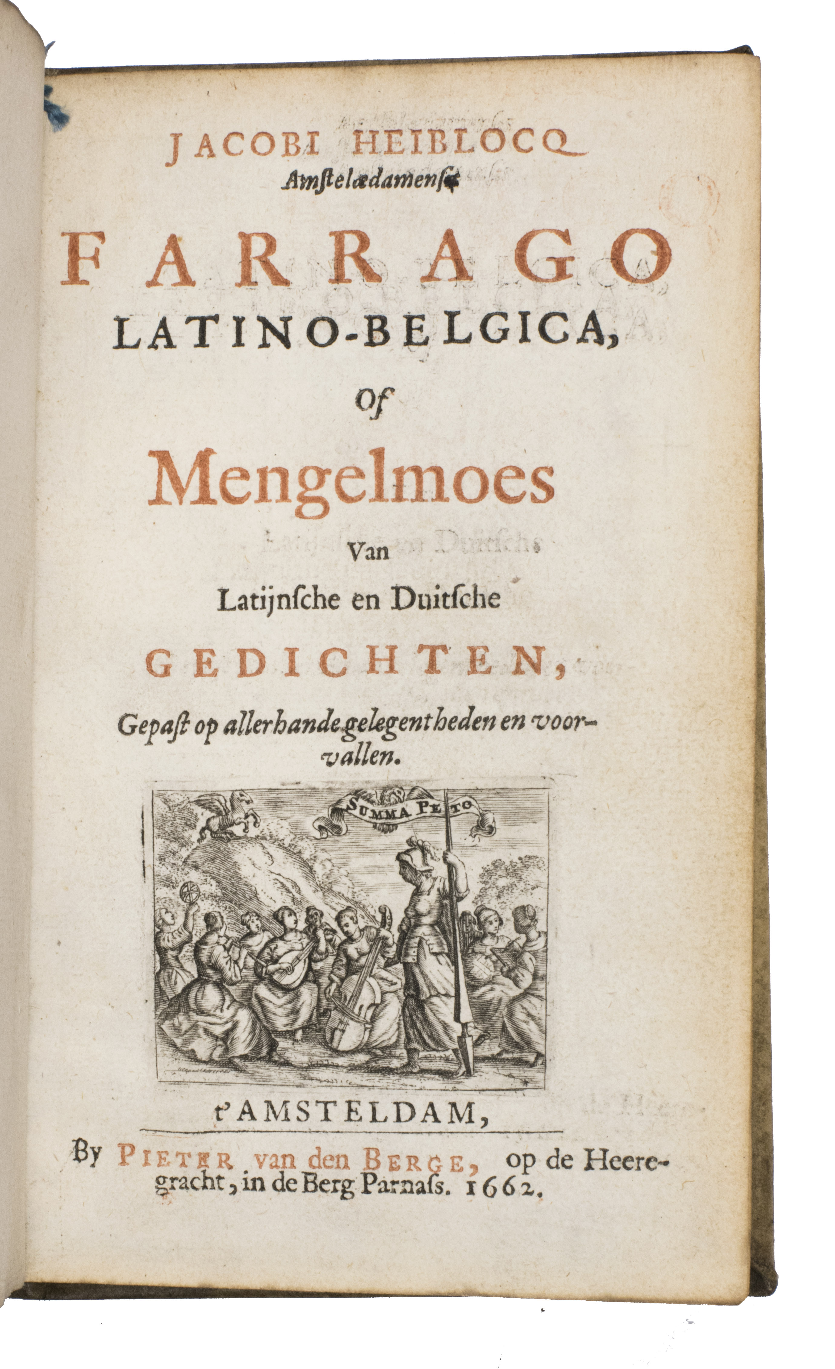 First and only edition of an illustrated collection of occasional poetry in Dutch and Latin by the Amsterdam schoolteacher Jacobus Heiblocq (1623-1690). He was well acquainted with the most famous poets of his time, as illustrated by their laudatory poems published here. Heyblocq's poems were written for important occasions, such as weddings, funerals, birthdays, and births. The work has been illustrated with three engravings, all depicting the block of a pile driver. This is a reference to the author, as this block is known as a "heiblok" in Dutch.