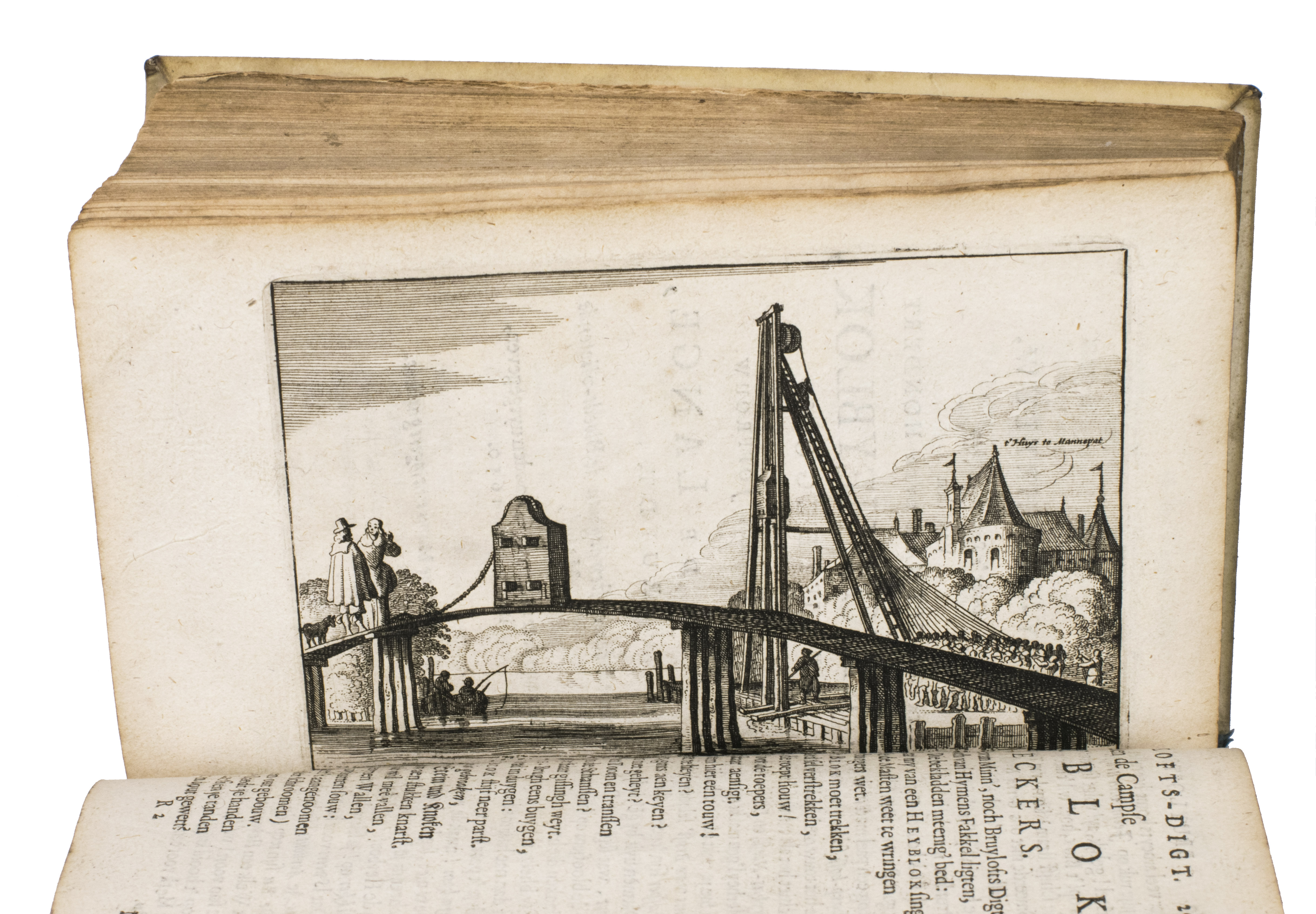 Amsterdam, Pieter van den Berge, 1662 (engraved title: 1663). 8vo. With the title printed in red and black with an engraved printer's device, an engraved title, a full-page engraved view of 't Huys Mannepat, an engraved illustration in the text, several decorated woodcut initials, and woodcut head- and tailpieces. Contemporary vellum. [24], 267, [1] pp.