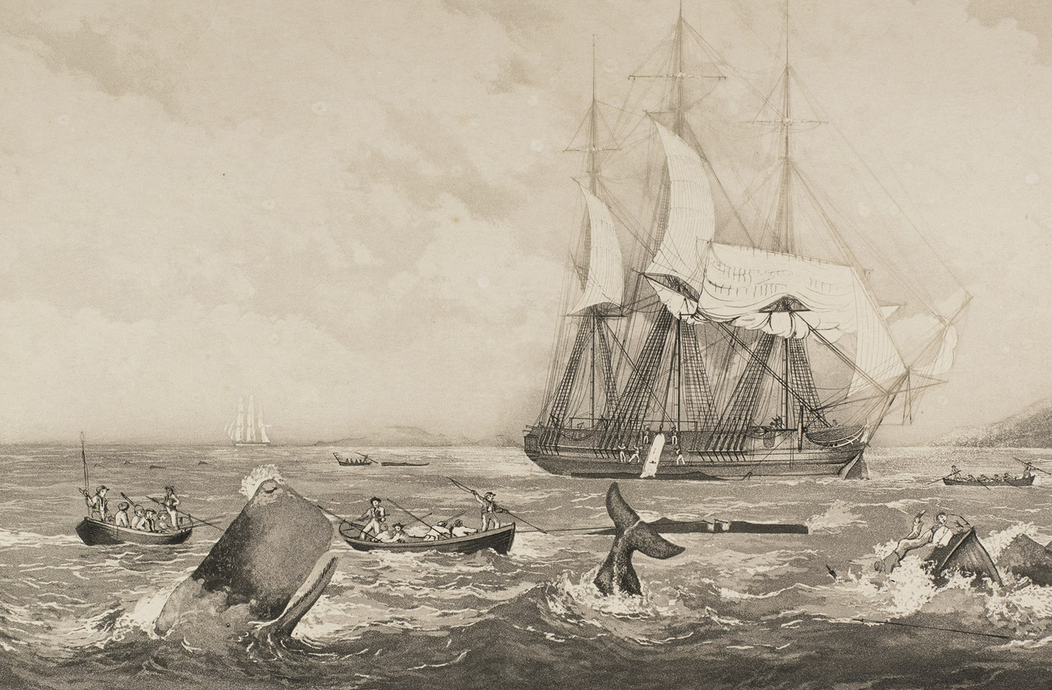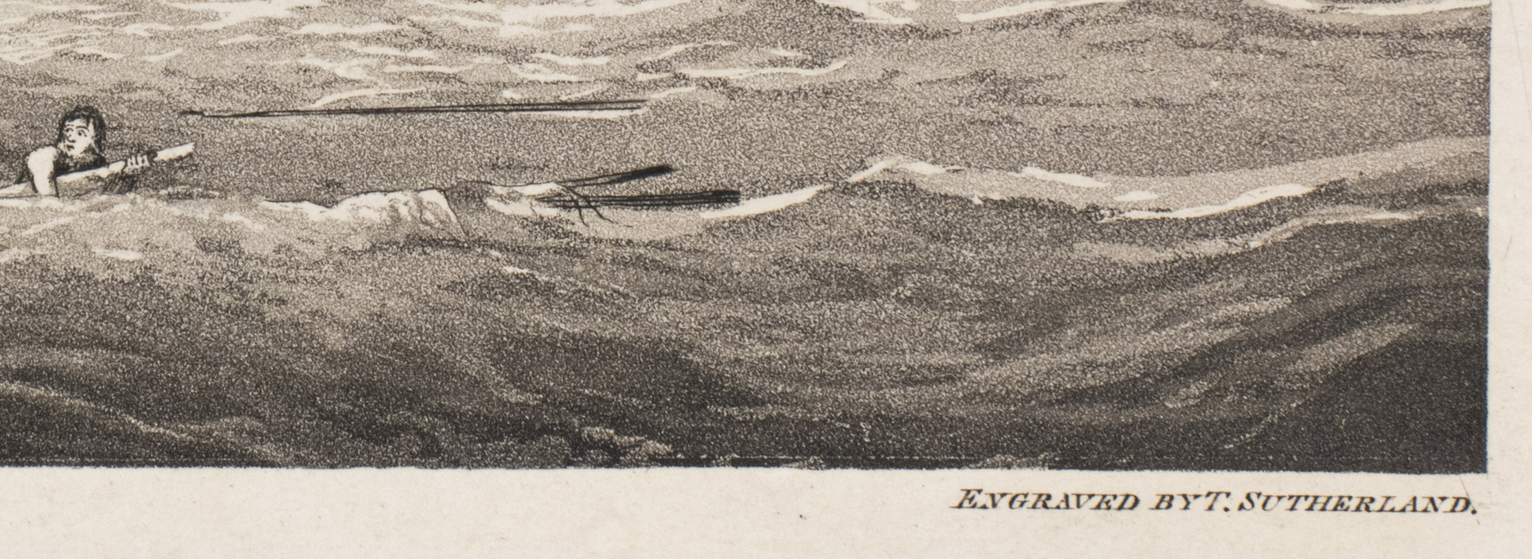 Second issue(?) of a striking aquatint by Thomas Sutherland after a painting by the celebrated marine painter William John Huggins (1781-1845), original a sailor by trade. The spectacular scene shows the British whalers Amelia Wilson and Castor off Buru, Indonesia, with a dying sperm whale smashing a whale boat, crew "cutting in" blubber alongside one of the ships, and several whale boats giving chase.