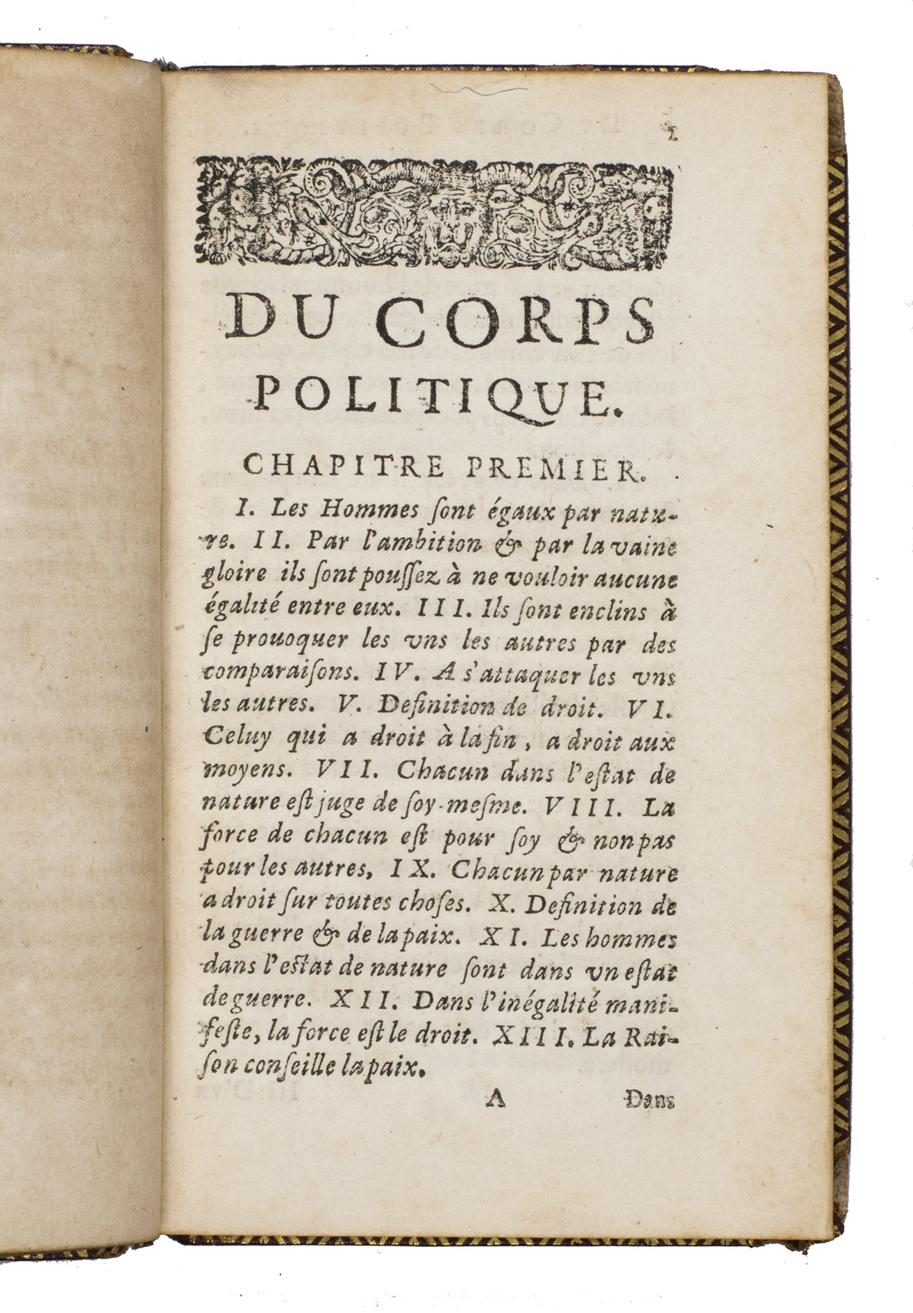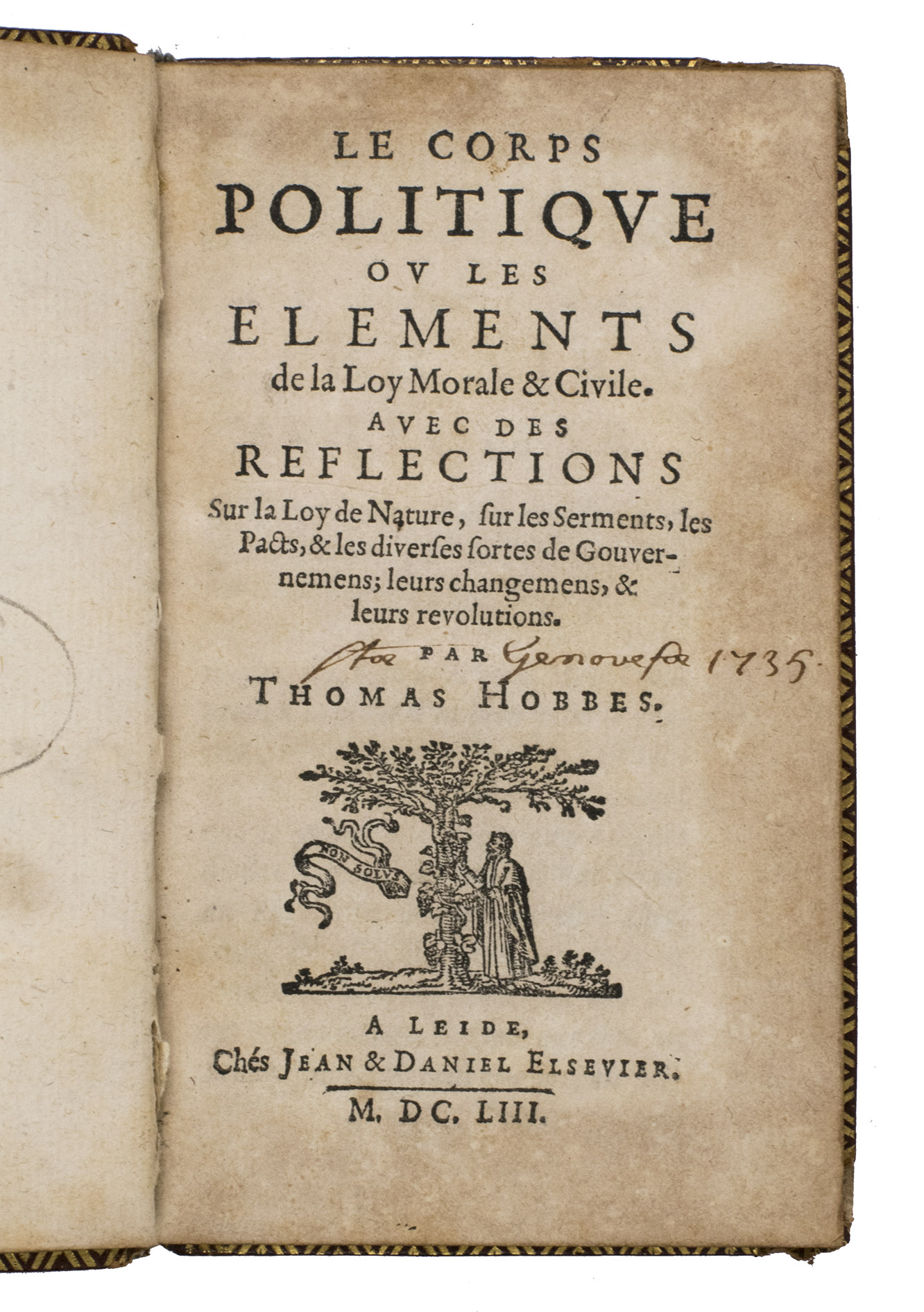 First Elzevier edition of the French translation by Samuel de Sorbière (1615-1670) of Thomas Hobbess (1588-1679) De corpore politico, or the elements of law, moral & politick (1650). Hobbes, among the first major philosophers to write in English, here develops one of the earliest systematic accounts of political society. First conceived as part of The elements of law (1640), alongside Human Nature, this work emerges directly from the intellectual and political upheavals of the 17th century. It offers a penetrating analysis of human nature, famously describing the condition of mankind as a state of conflict: "a war of every man against every man", driven by fear, competition, and self-interest.