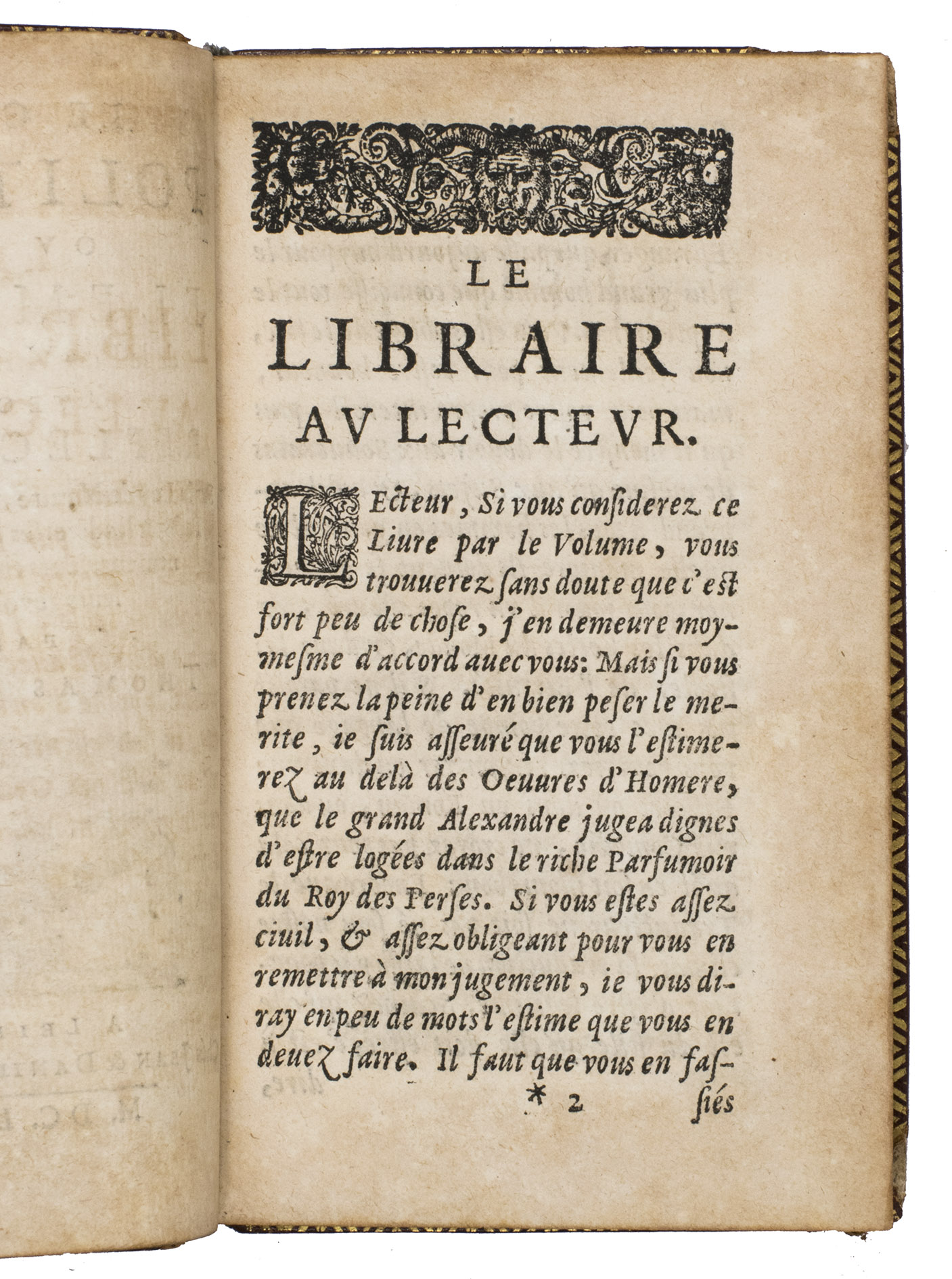 Leiden, Jean & Daniel Elsevier, 1653. 12mo. With Elzeviers woodcut device on the title page, several decorated woodcut initials, and head- and tailpieces. Early to mid-18th-century gold-tooled red morocco. [1], [1 blank], [4], [2 blank], 231, [1 blank] pp.