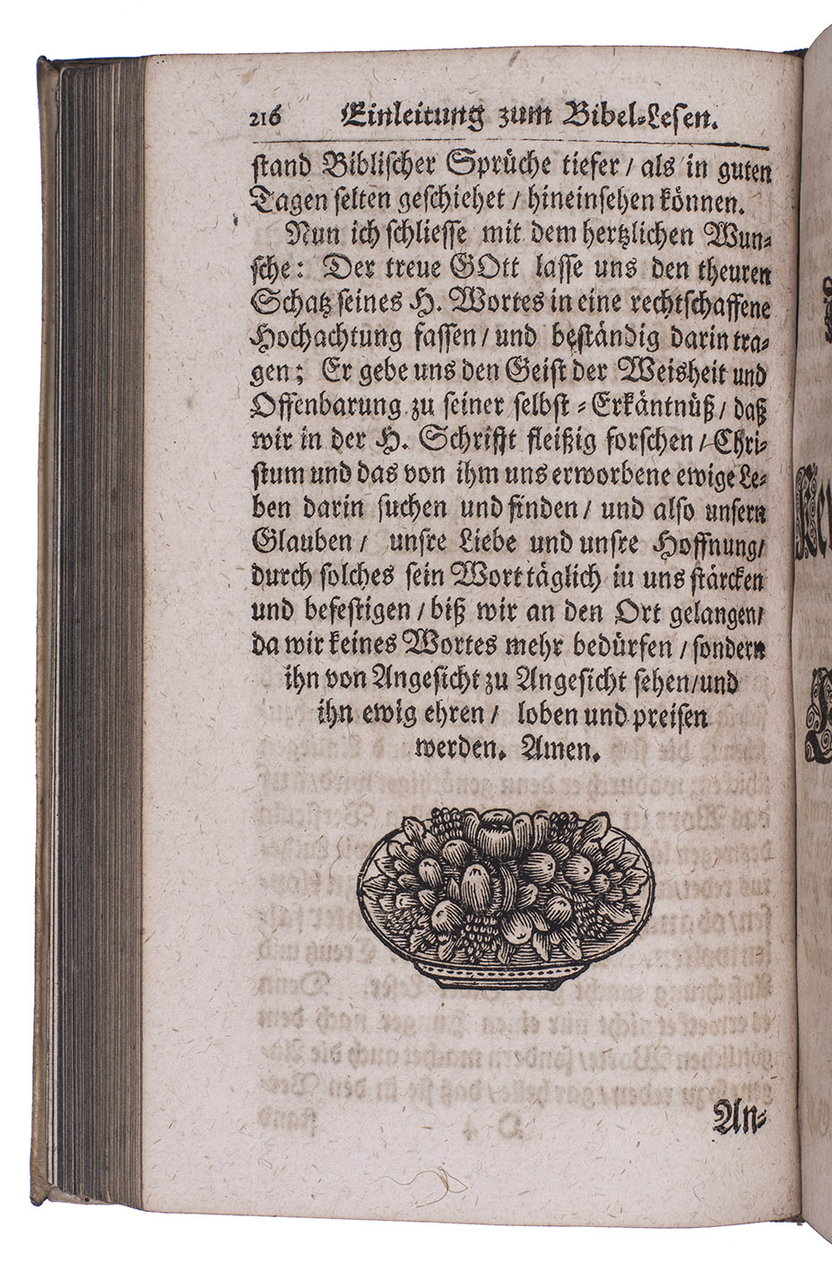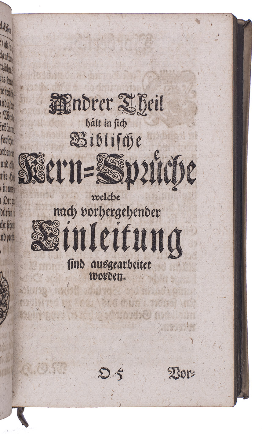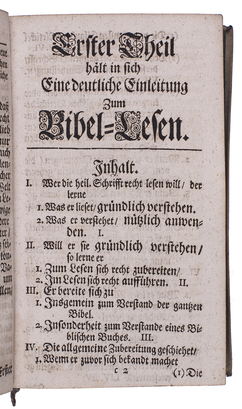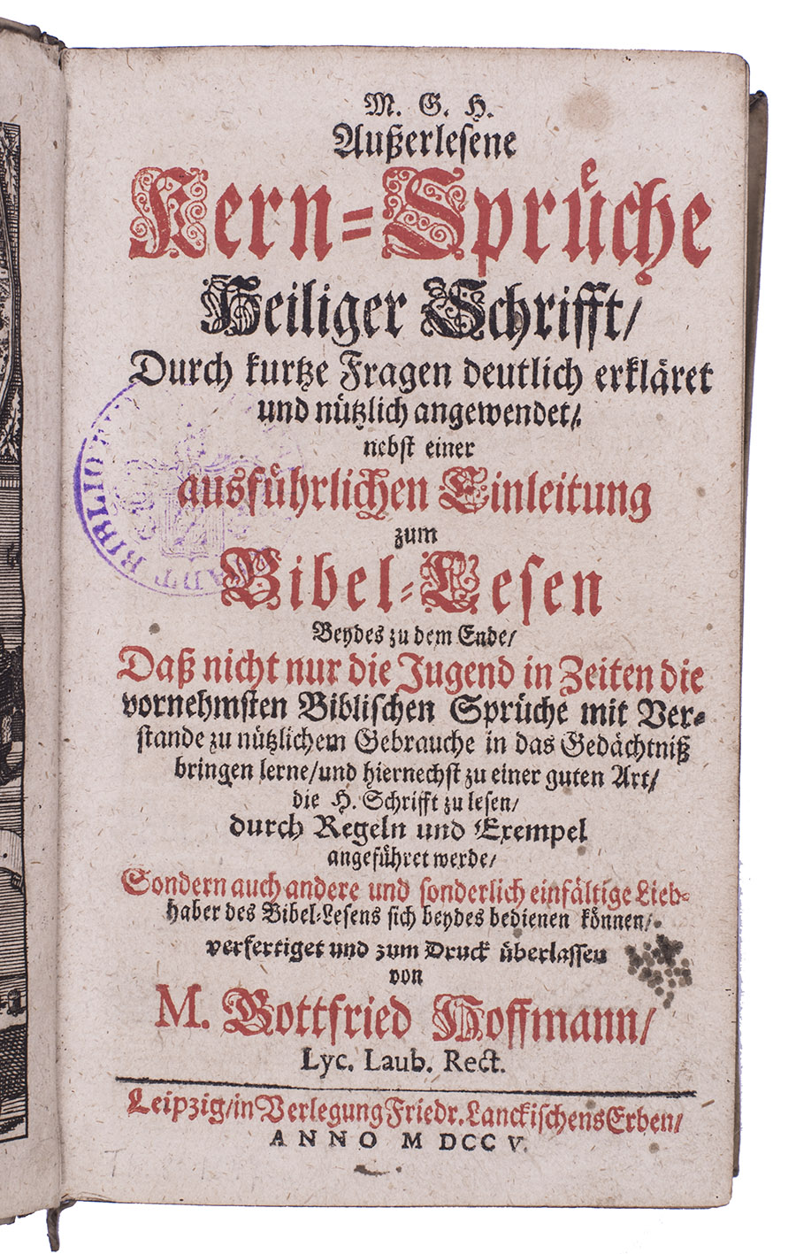 Rare first and only edition of a theological work by the German Protestant pedagogue and composer Gottfried Hoffmann (1658-1712). The work was intended for young people, teaching them how to read and understand the Bible. It opens with a dedication to Lady Catharina Magdalena of Büntherin and a preface. The main text is divided into two parts. The first is an introduction to reading the Bible: how to read, understand, interpret, live by and act on the Bible. The second contains forty Biblical "Kern-Sprüche", the most important Biblical passages, each followed by an explanation and application of the text and a relevant prayer.