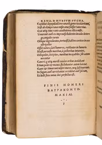With multiple ownership inscriptions, one on the first endpaper ("ex libris Joan B. des Manette no. 27 1814"), one on the recto of the first flyleaf, an inscription by an Aaron from Antwerp in 1815, underneath a further inscription dated 8 September 1880, on the title page, the number 2,25 and a name (possibly Ruffus?). The title page also bears an oval blind stamp of the American Antiquarian Society, Worcester, Massachusetts. On the final endpaper, an ownership inscription ("A. White, alumnus Universitatis Harvardini"). The corners of the binding are rubbed. The first few leaves are reinforced at the inner margin, the work is damp stained throughout and some minor underlining on several pages. Otherwise in good condition. Nijhoff & Kronenberg 1110; Piasere, "Raffaele Maffeis Anthropologia (1506): the birth and diffusion of a (quasi)-neologism", DADA, 1, (2019) pp. 55-89; Sánchez, La recepción de Homero en el Humanismo y el Renacimiento: de Francesco Petrarca a Gonzalo Pérez. Artifara, 14, (2014), pp. 89-117; Ad 1: STCV 12922176; USTC 443242; Ad 2: USTC 403786.