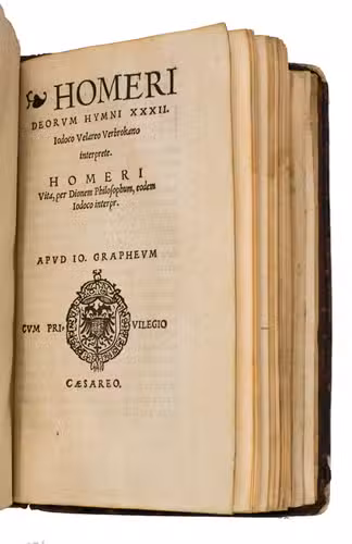 Rare first Antwerp edition, and the earliest truly complete Latin Homer to be printed in the city, from the press of Joannes Grapheus (1502-1571). Conceived as a two-volume "opera omnia", it gathered together all the major Latin translations of Homer available in the early 16th century, creating what was, in effect, the earliest attempt to present Homers entire surviving corpus in a unified Latin form.