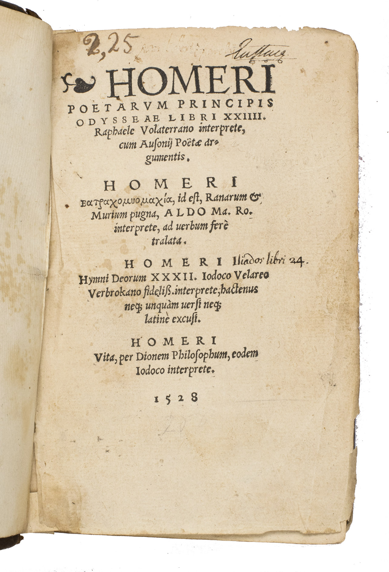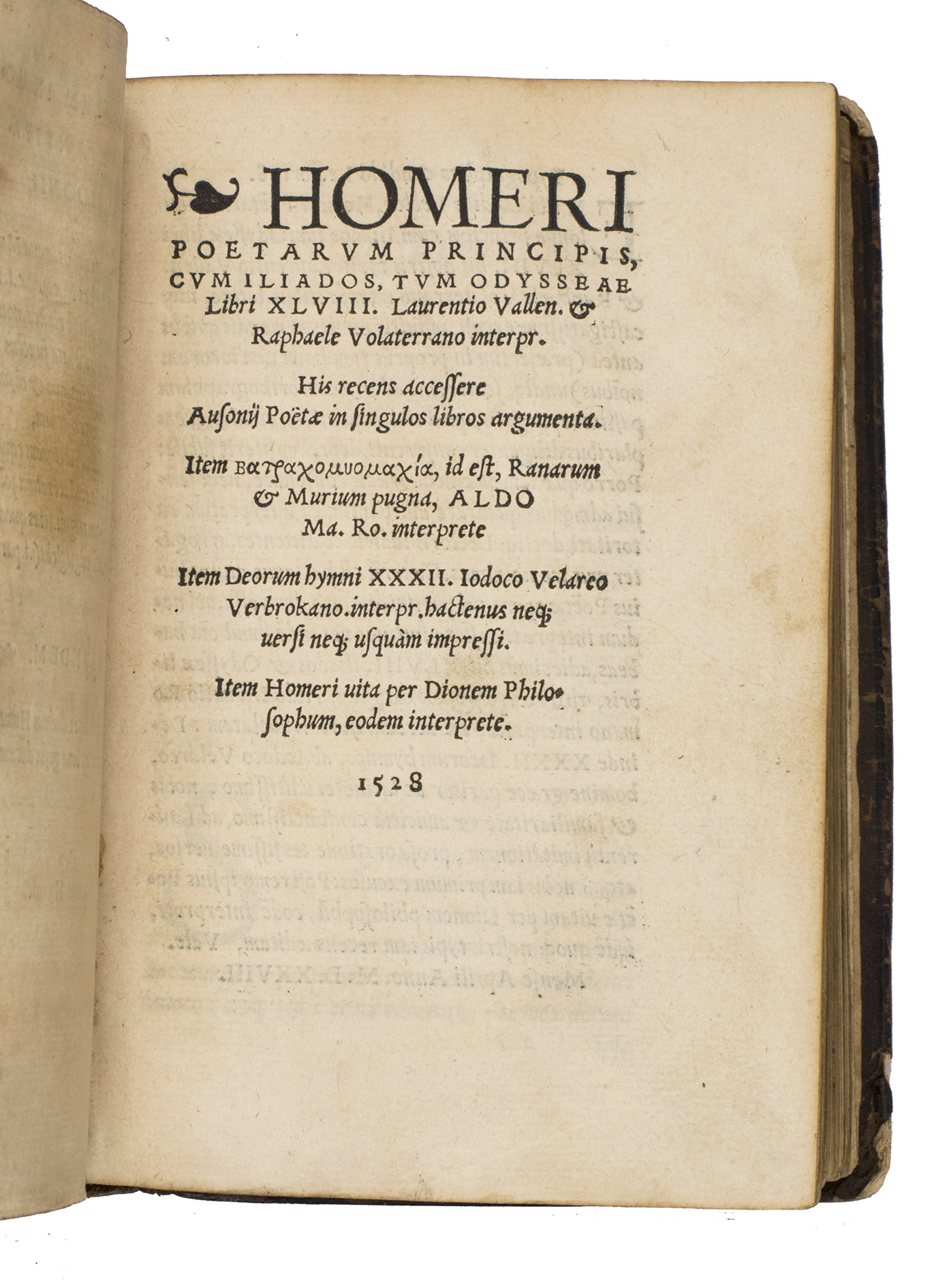 Ad 2 combines the Iliad and the Odyssey into a single, integrated edition together with all the associated texts. Here the Iliados libri XXIIII, translated by Valla and completed by later humanists, stand beside Maffeis Odyssey. As in ad 1, Ausonius arguments introduce each book, and the epics are followed by Aldus Manutius (1449-1515) Latin version of the Batrachomyomachia, Velareus Homeric Hymns, and the Vita Homeri. In this form, the work realises Grapheus most ambitious aim: to provide scholars and readers with a complete Renaissance "opera omnia" of the Homeric tradition. With its own title pages inserted for some of the supplementary works, the works functioned effectively as an autonomous publication.