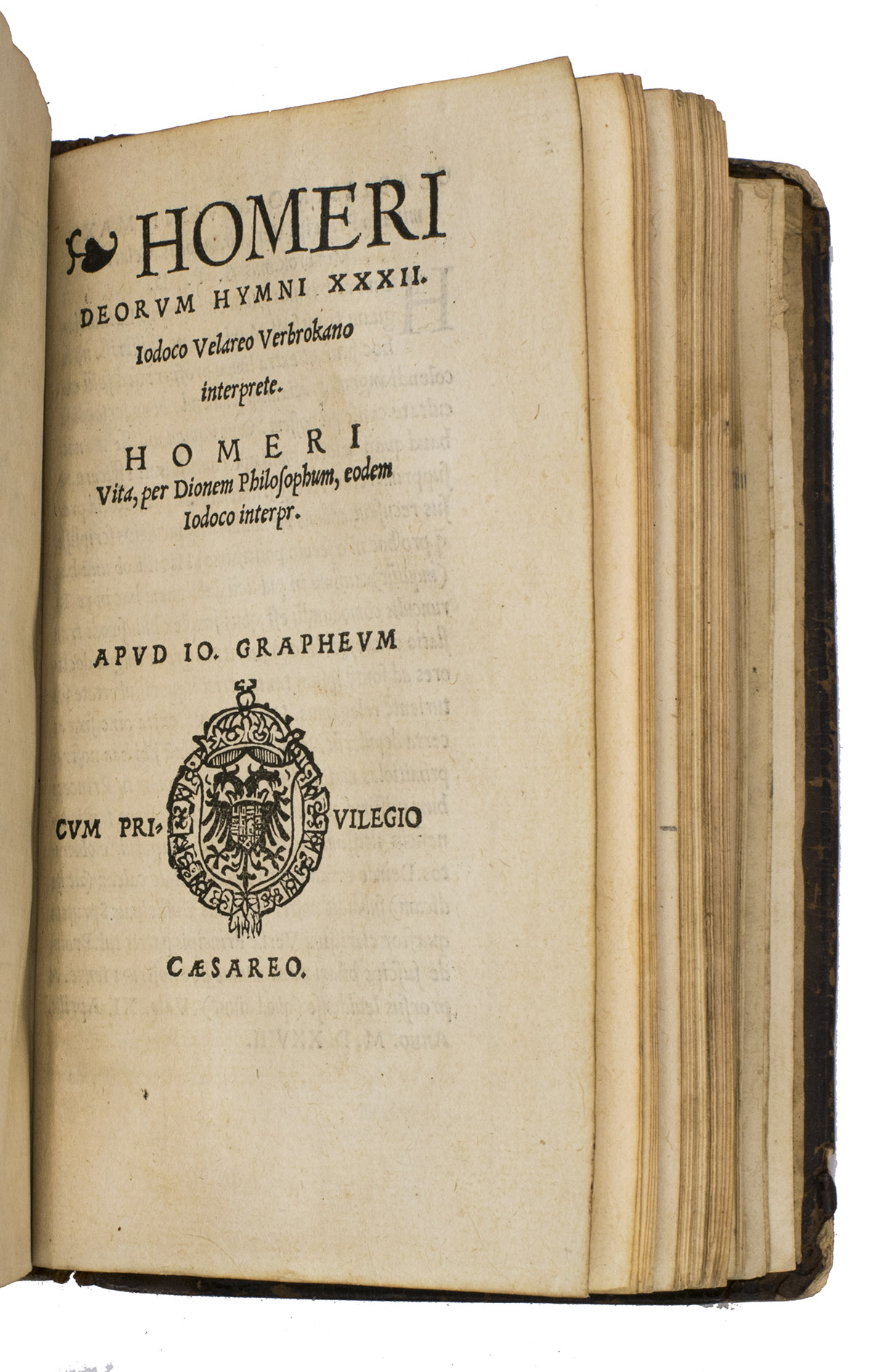 In the Antwerp printing, Maffeis 24-book translation appears with Ausonius poetic summaries, and is followed by 32 (of the 33 hymns and 1 epigram) Homeric Hymns, translated into Latin for the very first time by Jodocus Velareus Verbrokanus (dates unknown).Verbrokanus included 31 hymns and the epigram to the Hosts, but left out the first hymn to Dionysus and the first hymn to Demeter. It concludes with a Latin Vita Homeri, attributed to Dio Chrysostom and likewise rendered by Velareus.
