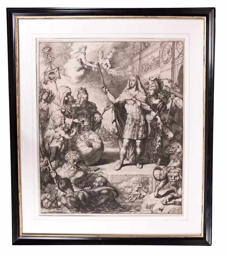 Brussels, Jean Leonard, [ca. 1685]. 60×50 cm. Allegorical portrait of King Charles II of Spainas a Roman Emperor, with a globe showing the Americas, numerous allegorical figures and classical gods, his arms on the wall in the background and his crowned CC II monogram on a staff with a banner. Framed, in a passe partout.