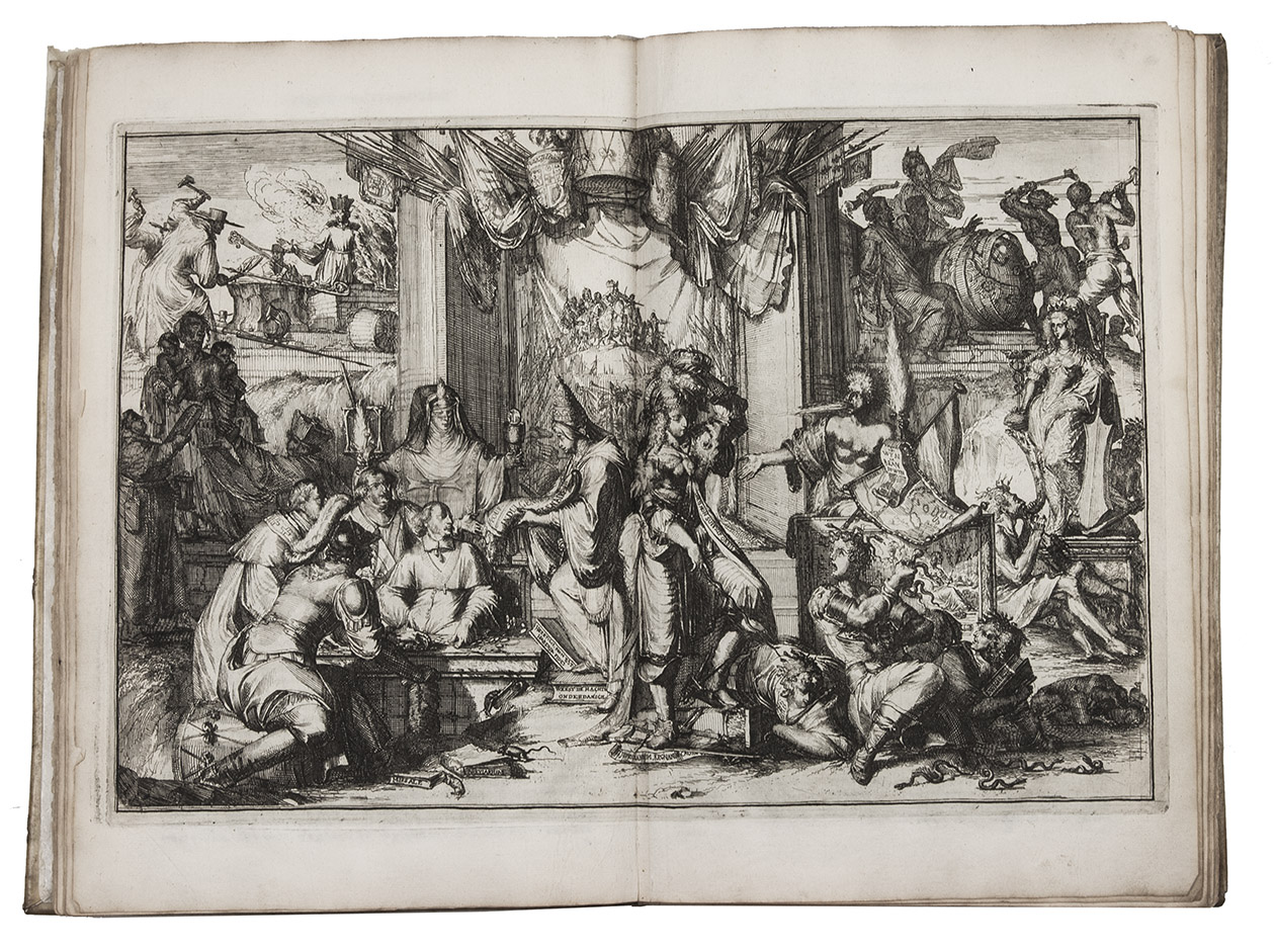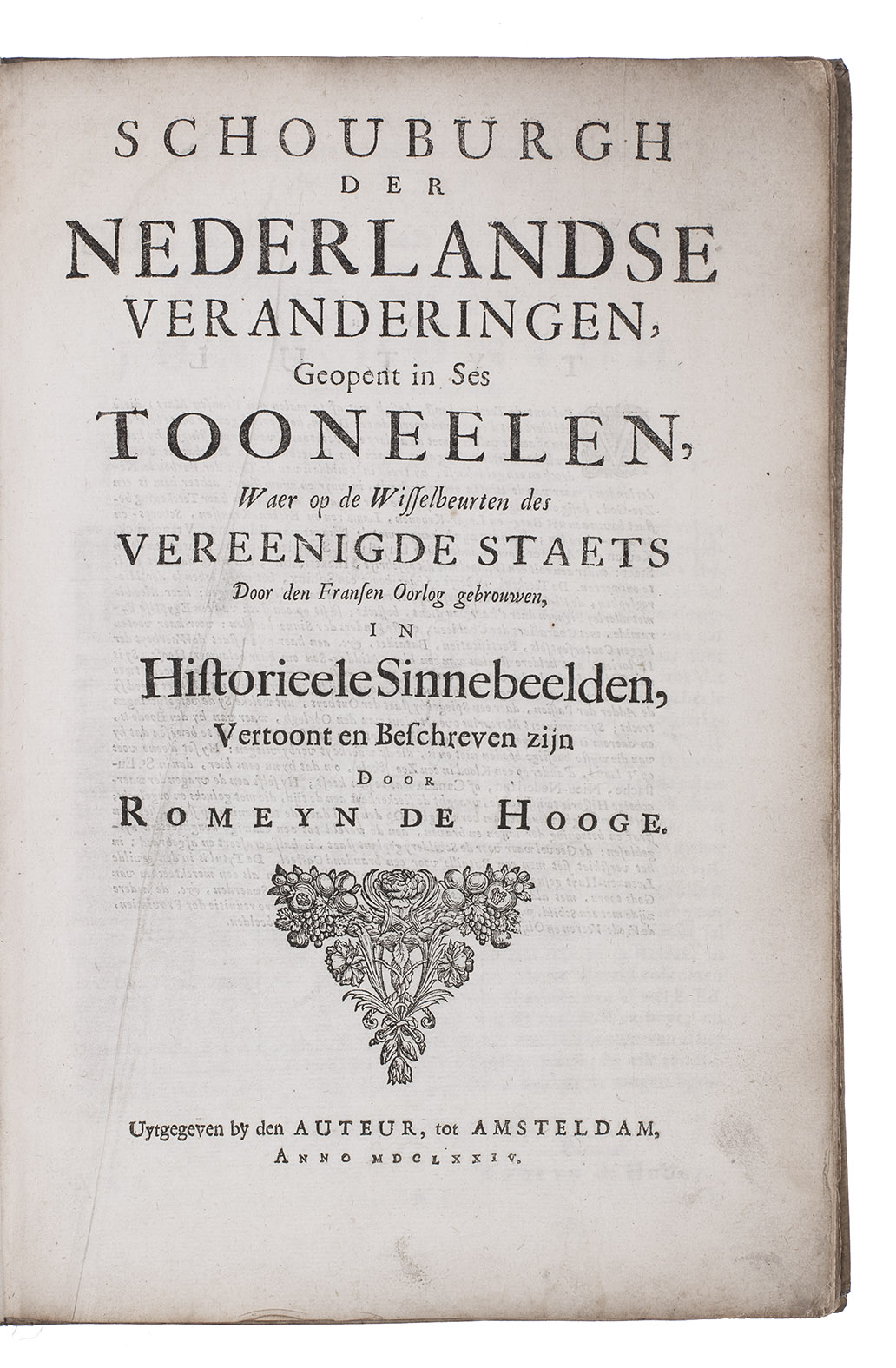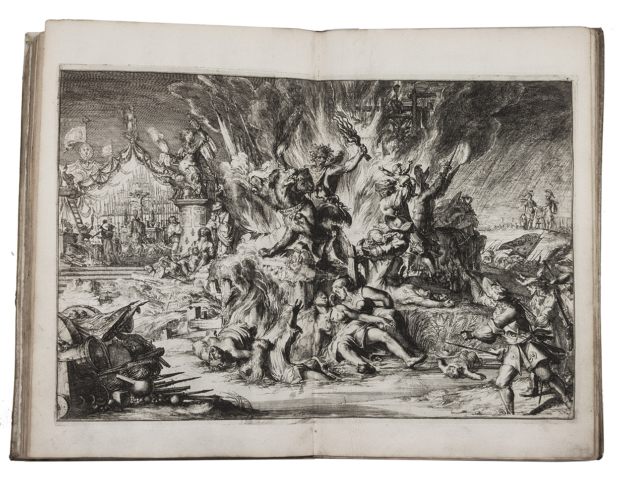Rare first edition, with fine emblematic plates, illustrating the injustice and cruelty of the war waged by Louis XIV of France against the free and independent Dutch Republic. Romeyn de Hooghe (1645-1708) was unquestionably the most gifted and the most prolific Dutch book illustrator of the second half of the 17th century. His work displays the political grandeur and disasters of war in the Dutch Republic, including the disastrous year 1672, depicted dramatically and with great splendour. The large plates are richly designed and full of intricate emblems and allegories, fully explained in the accompanying text; an emblematic poem is added to each plate.