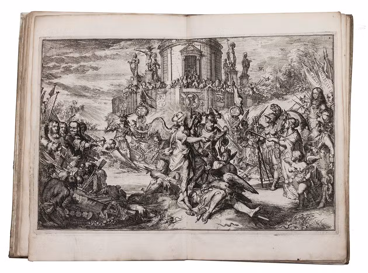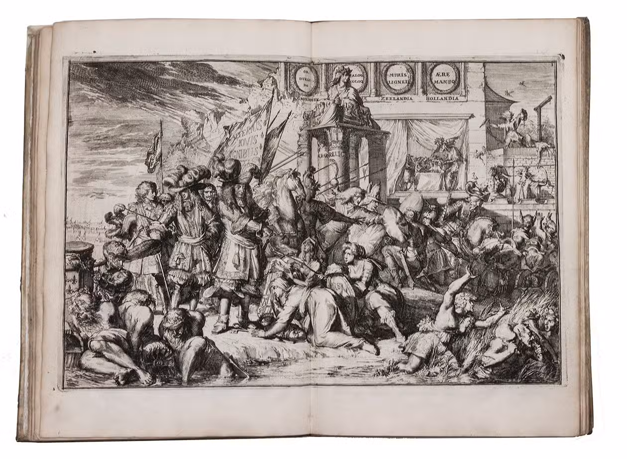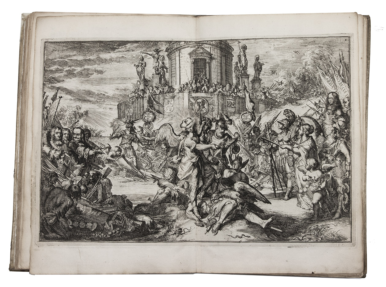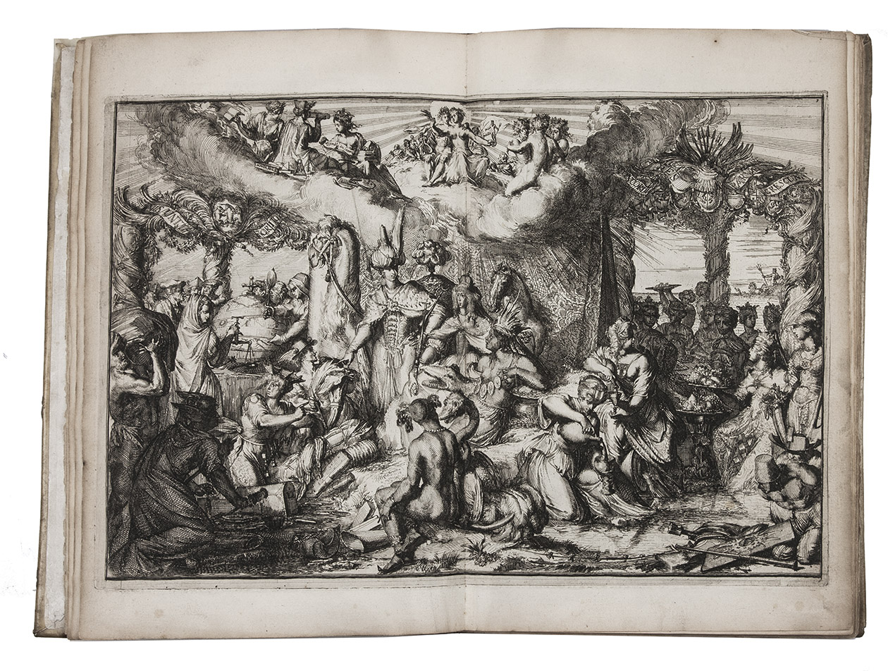 Rare first edition, with fine emblematic plates, illustrating the injustice and cruelty of the war waged by Louis XIV of France against the free and independent Dutch Republic. Romeyn de Hooghe (1645-1708) was unquestionably the most gifted and the most prolific Dutch book illustrator of the second half of the 17th century. His work displays the political grandeur and disasters of war in the Dutch Republic, including the disastrous year 1672, depicted dramatically and with great splendour. The large plates are richly designed and full of intricate emblems and allegories, fully explained in the accompanying text; an emblematic poem is added to each plate.
