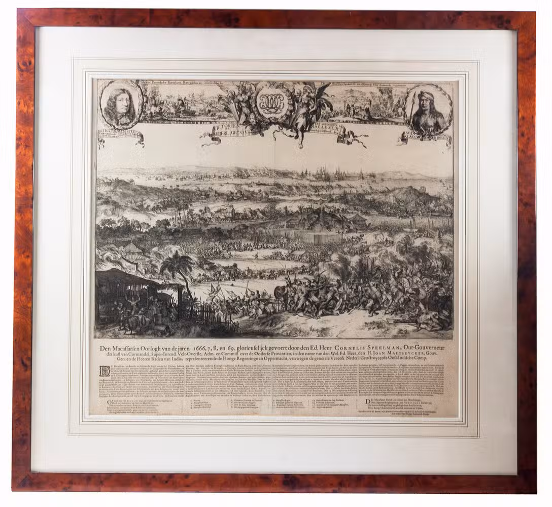 [Amsterdam?, 1669]. Engraved view (40 x 54.5 cm), with two battle scenes on top, flanked by portraits of Speelman and Radjah Palacca, with in the centre a laurel wreath with the monogram of the VOC, surrounded by Mars and Mercury, and a banderole with the title; and with letterpress text below the view (11 x 54.5 cm), including two poems by the famous Dutch poet Joost van den Vondel and numbered keys referring to the plate. Framed (75 x 81 cm).