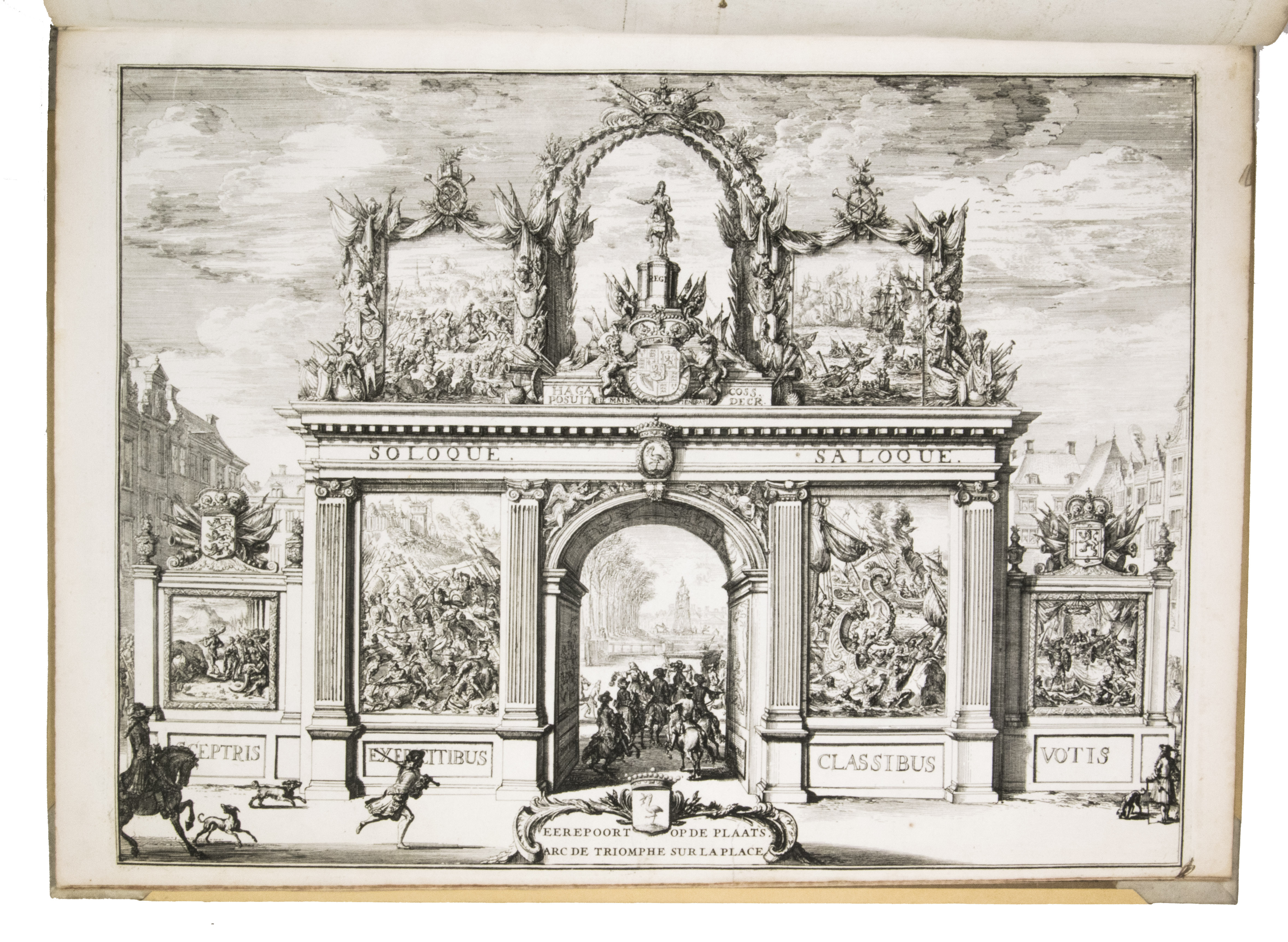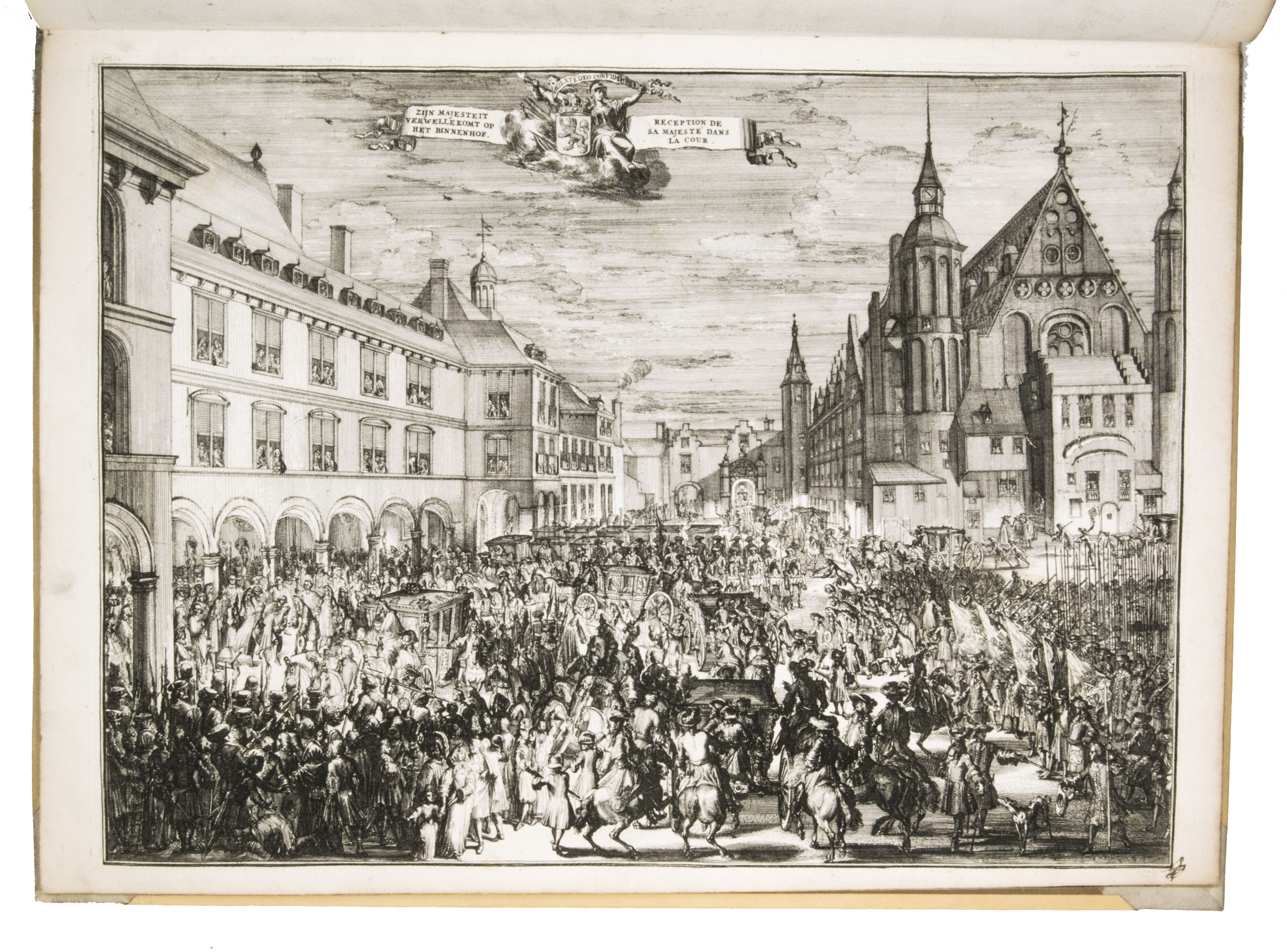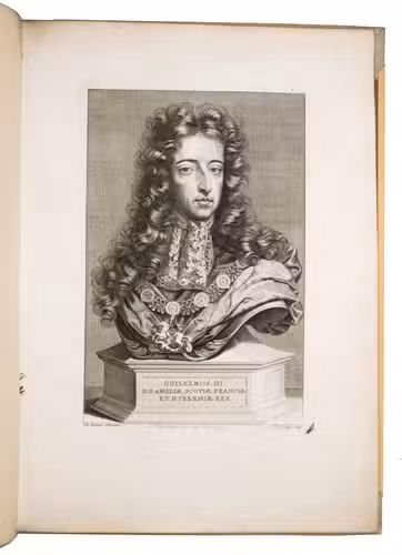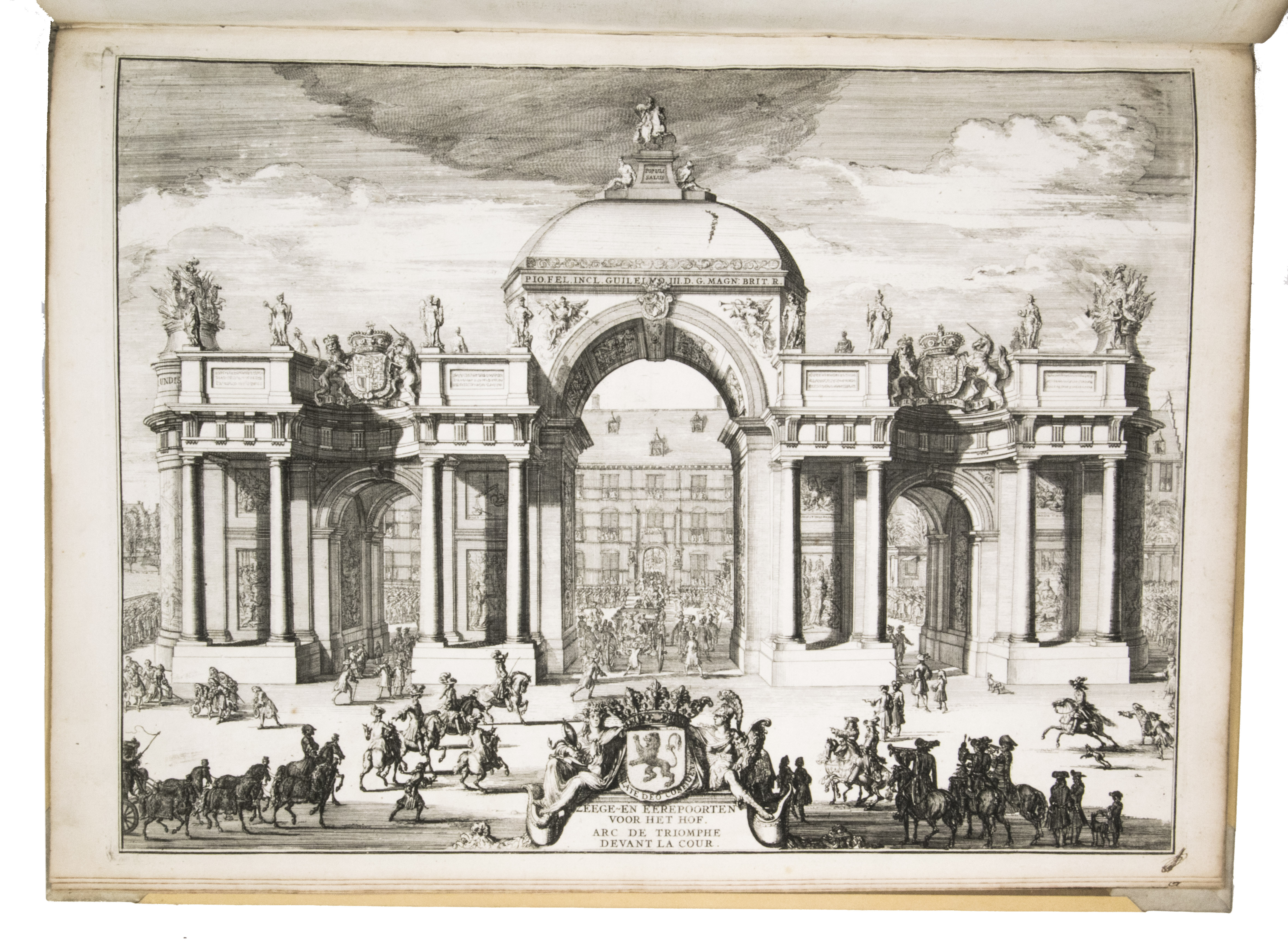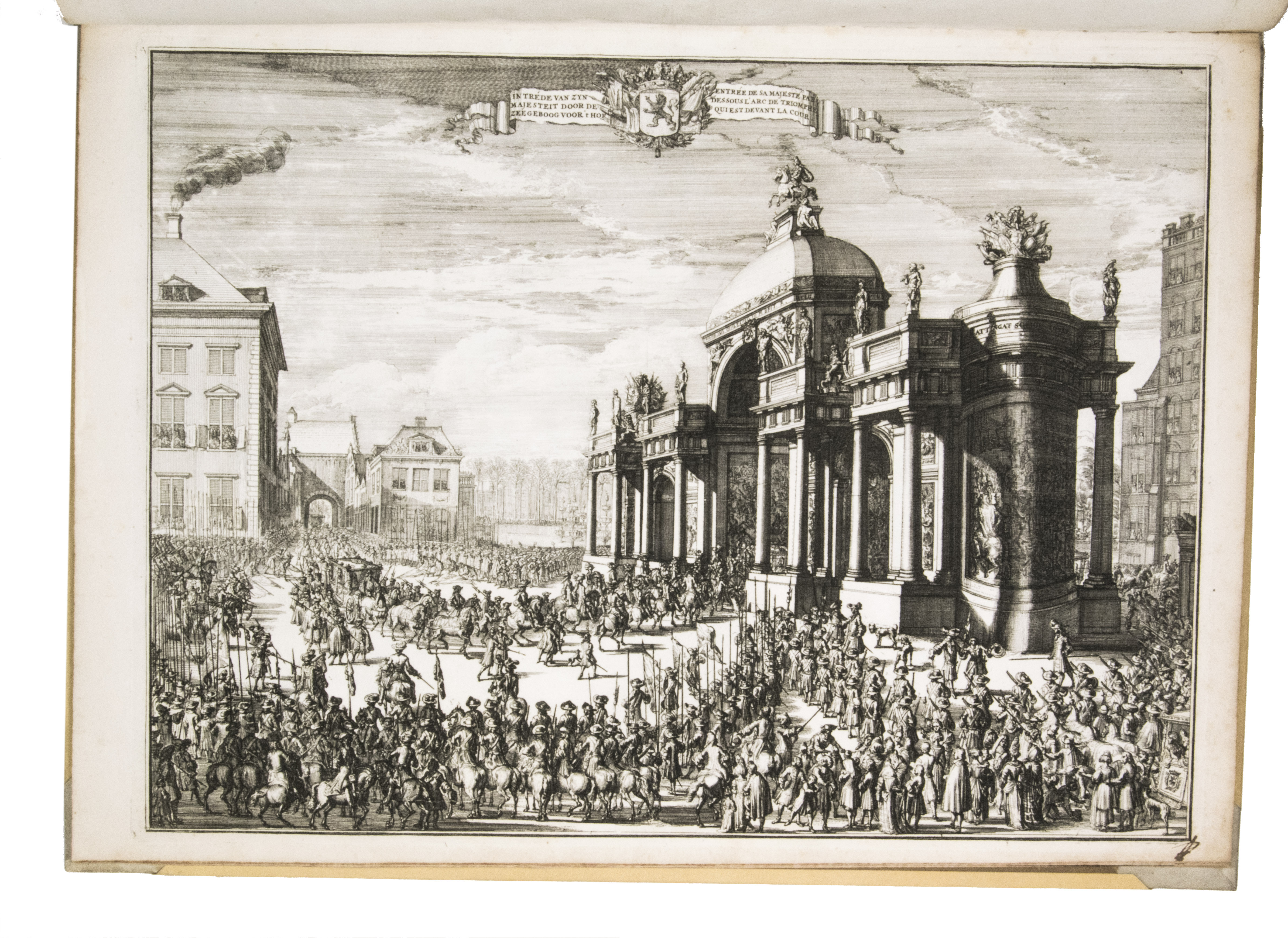 Romeyn de Hooghe participated in the planning of the decorations and recorded the festivities at their height in the present brilliant series of engravings. They show the splendid arrival in The Hague, associated ceremonies, the enormous triumphal arches, their paintings and sculptures, the nightly illumination of the town hall, fireworks, etc., with most of the plates measuring 32.5 x 44 cm. De Hooghe's engravings are accompanied by a portrait of King William III, engraved by Pieter van Gunst after Johan Brandon. The only plate that differs in the French and Dutch editions is the engraved title-page, the captions of the other engravings appearing in both Dutch and French, and that of the portrait in Latin.