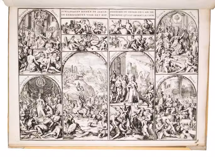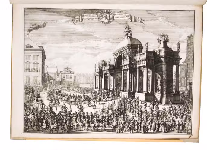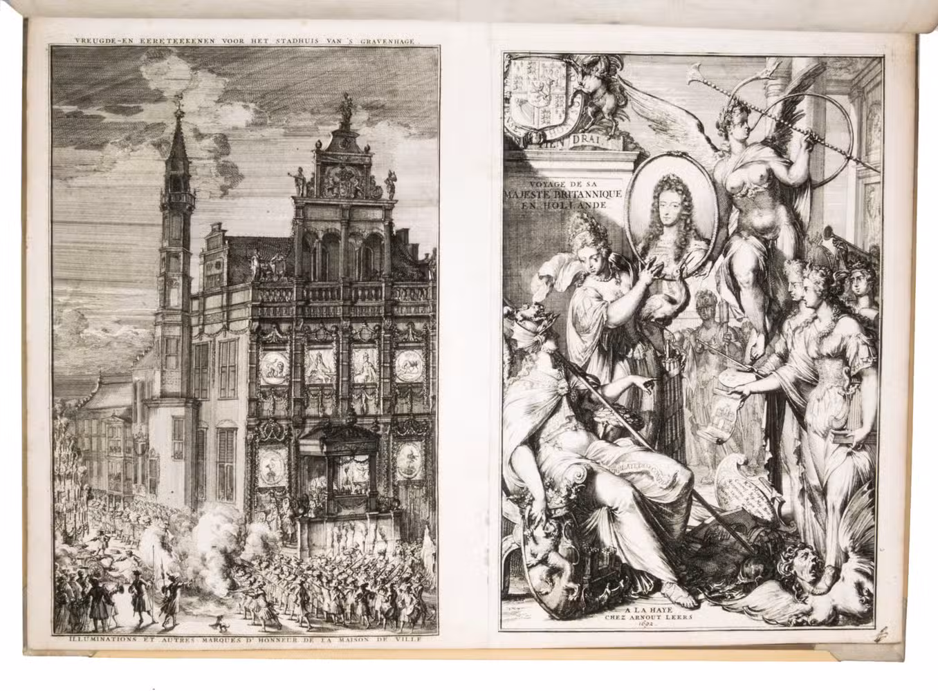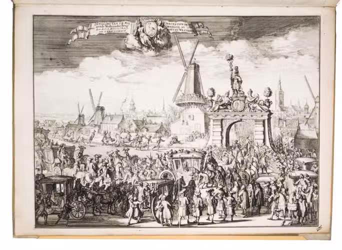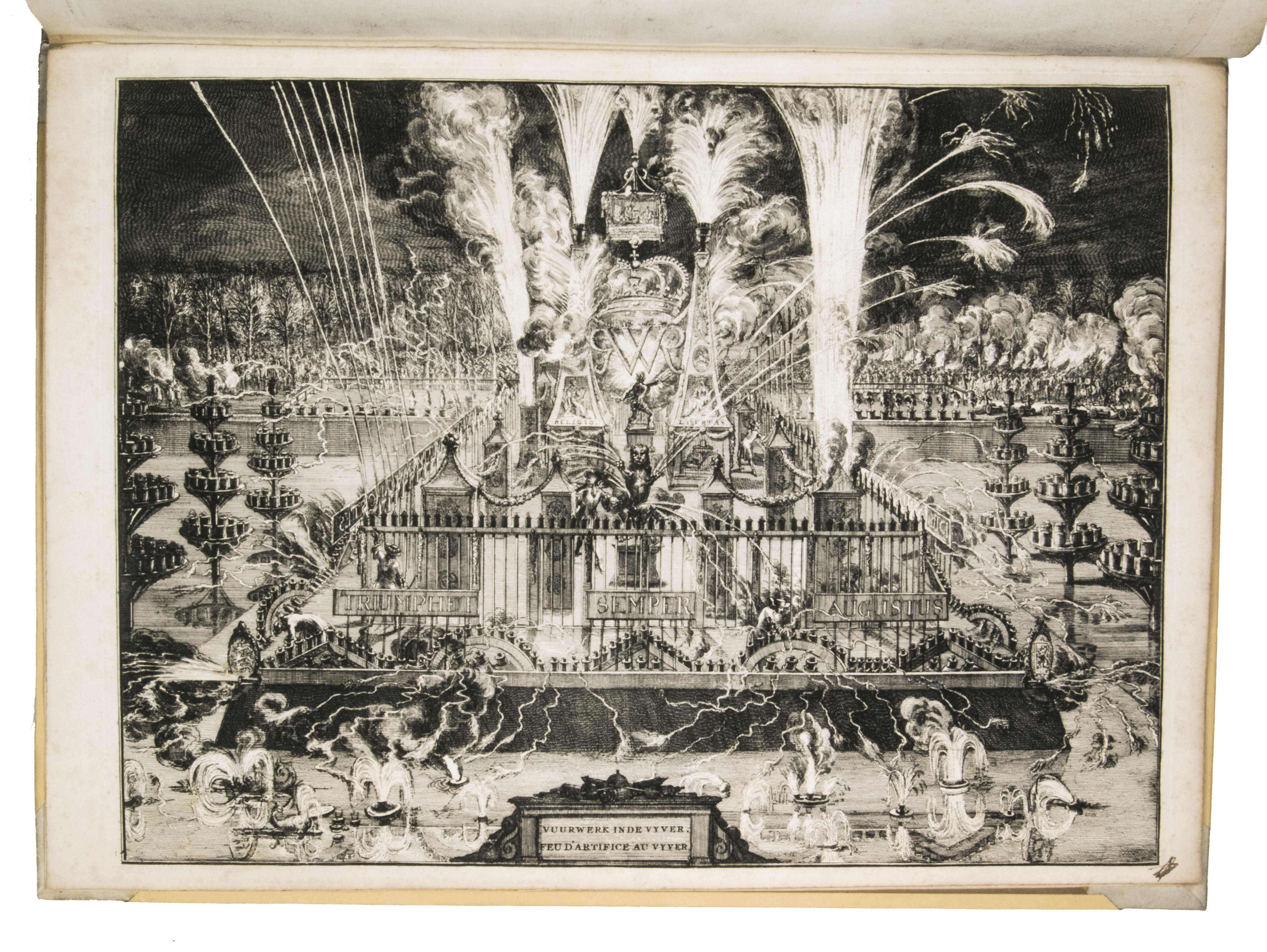 Romeyn de Hooghe participated in the planning of the decorations and recorded the festivities at their height in the present brilliant series of engravings. They show the splendid arrival in The Hague, associated ceremonies, the enormous triumphal arches, their paintings and sculptures, the nightly illumination of the town hall, fireworks, etc., with most of the plates measuring 32.5 x 44 cm. De Hooghe's engravings are accompanied by a portrait of King William III, engraved by Pieter van Gunst after Johan Brandon. The only plate that differs in the French and Dutch editions is the engraved title-page, the captions of the other engravings appearing in both Dutch and French, and that of the portrait in Latin.