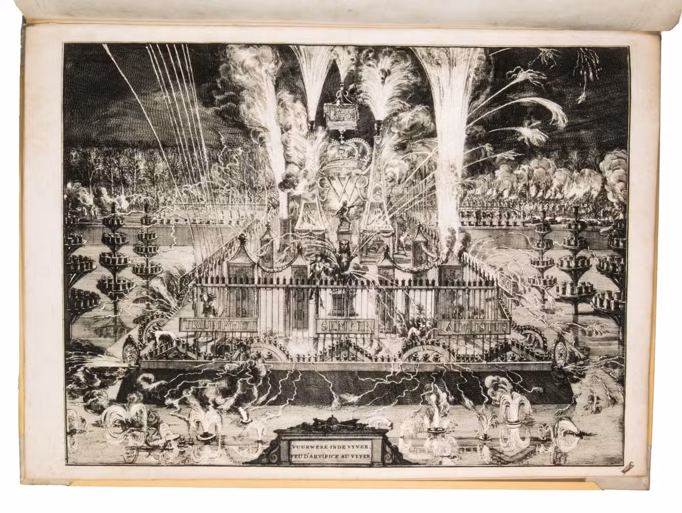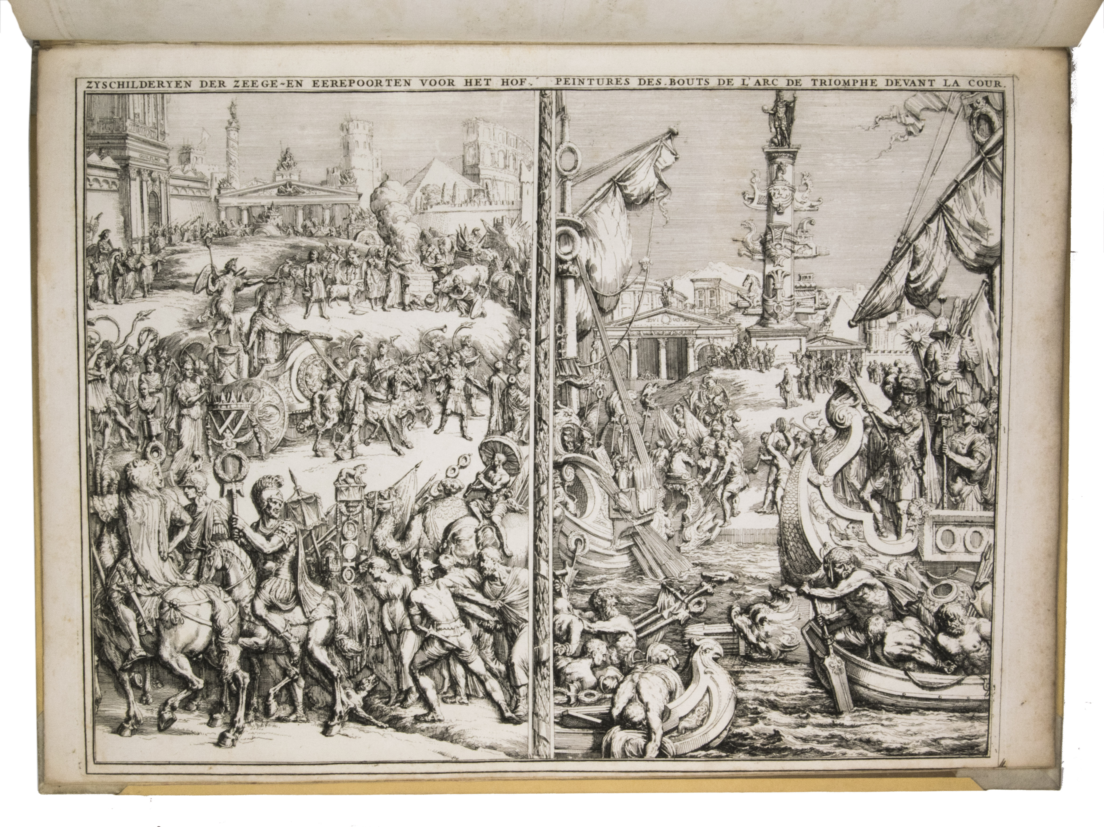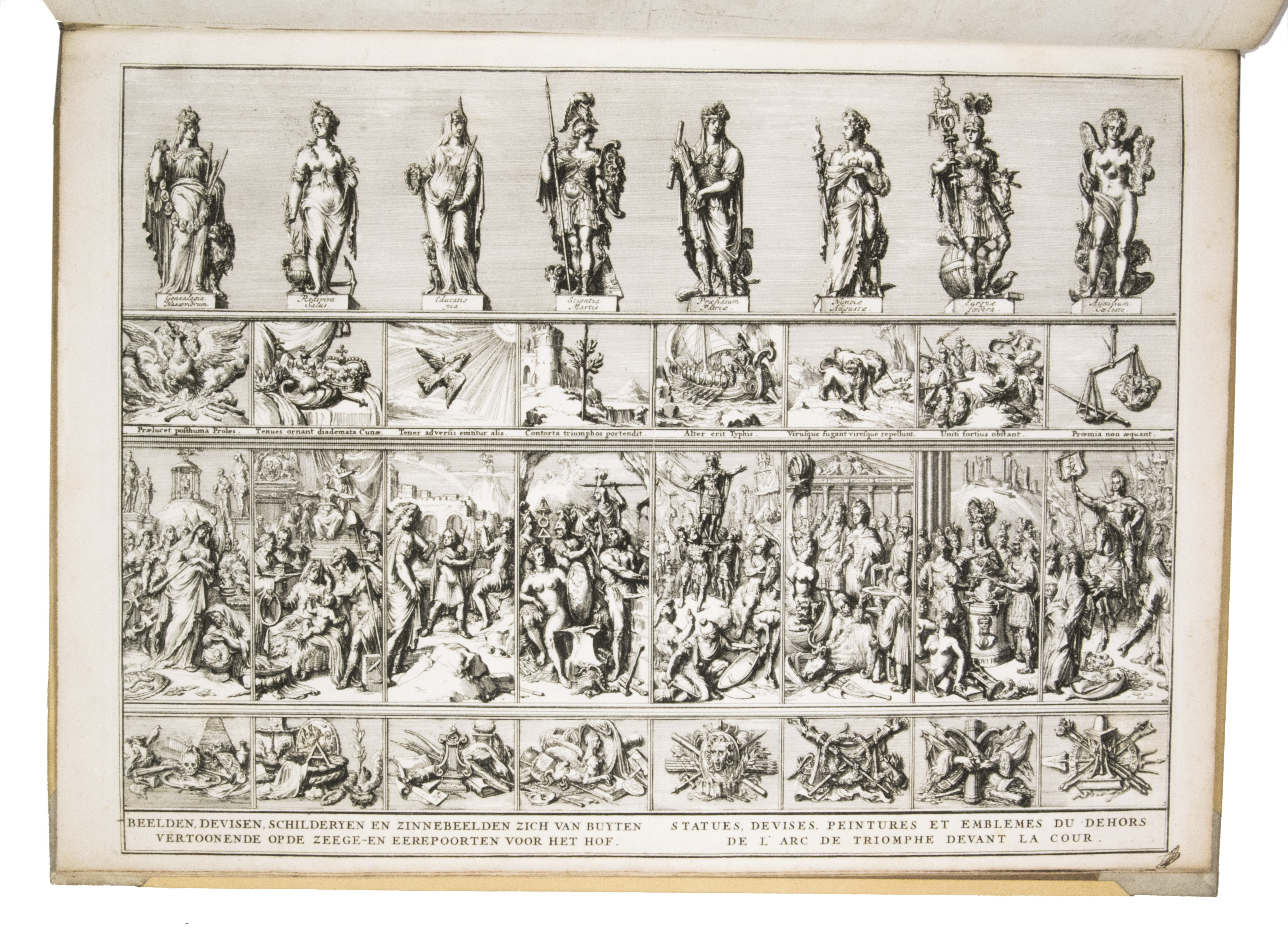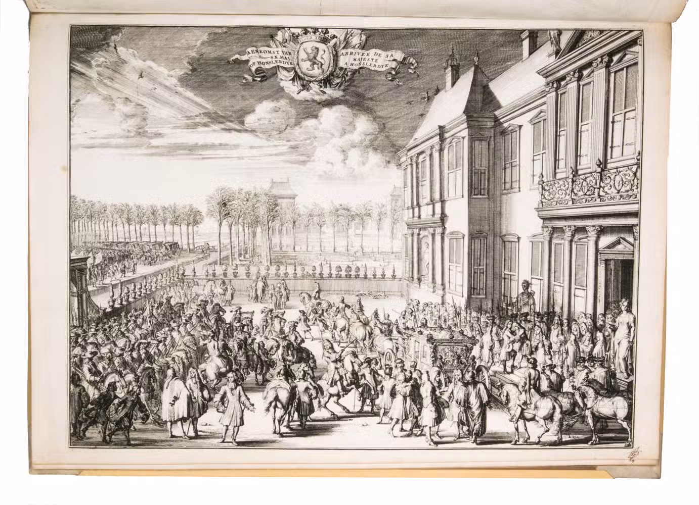 Romeyn de Hooghe participated in the planning of the decorations and recorded the festivities at their height in the present brilliant series of engravings. They show the splendid arrival in The Hague, associated ceremonies, the enormous triumphal arches, their paintings and sculptures, the nightly illumination of the town hall, fireworks, etc., with most of the plates measuring 32.5 x 44 cm. De Hooghe's engravings are accompanied by a portrait of King William III, engraved by Pieter van Gunst after Johan Brandon. The only plate that differs in the French and Dutch editions is the engraved title-page, the captions of the other engravings appearing in both Dutch and French, and that of the portrait in Latin.