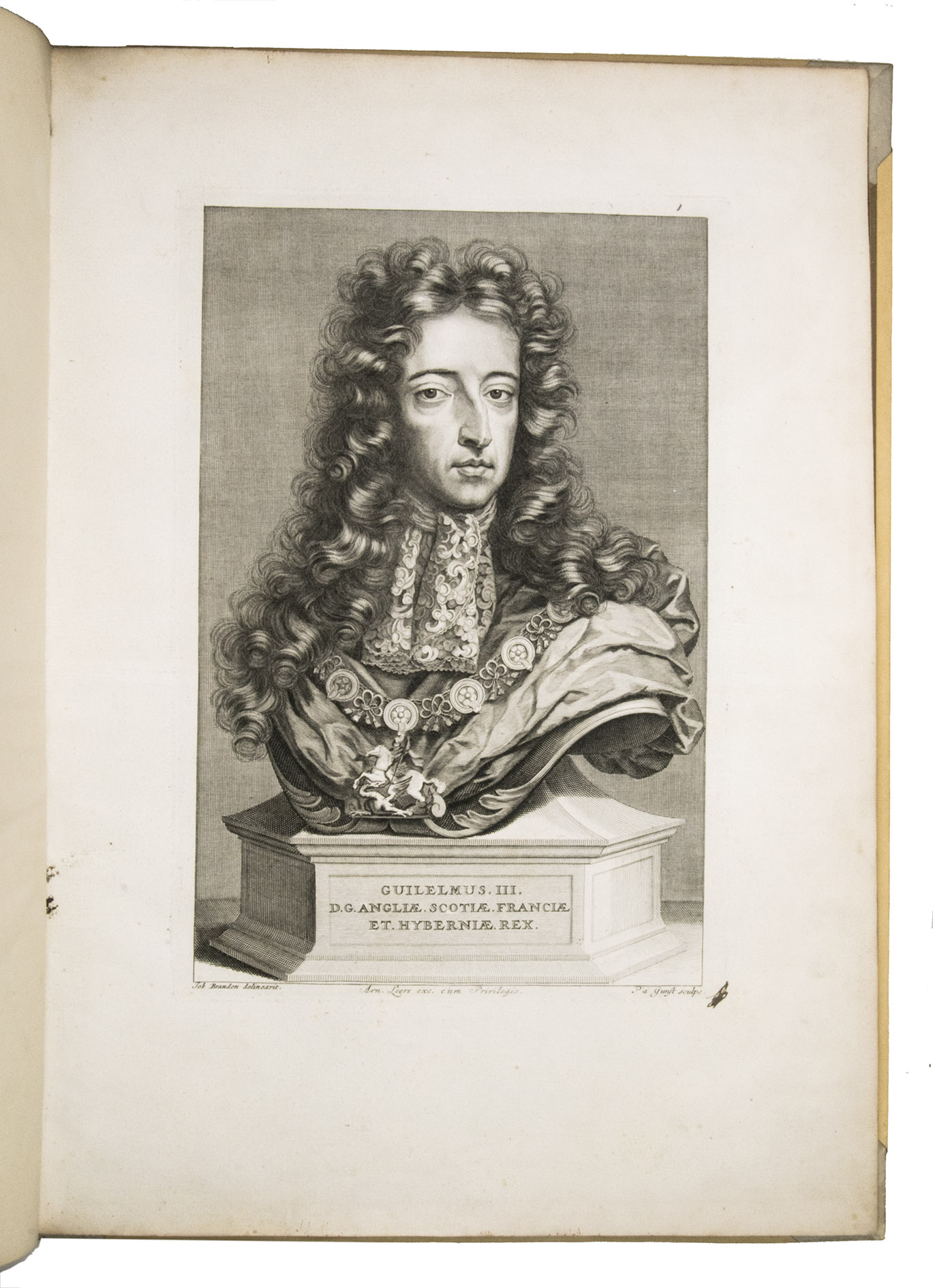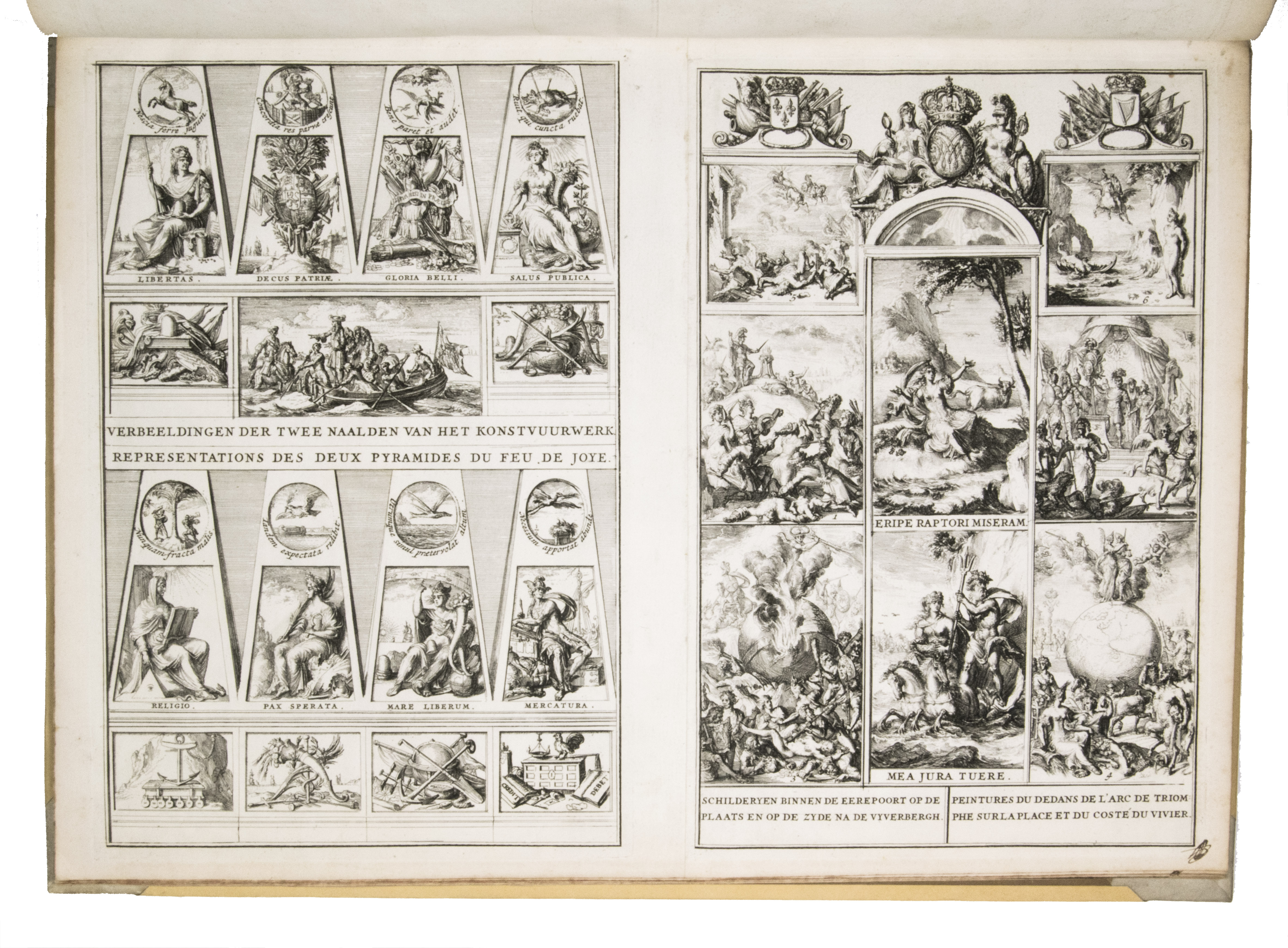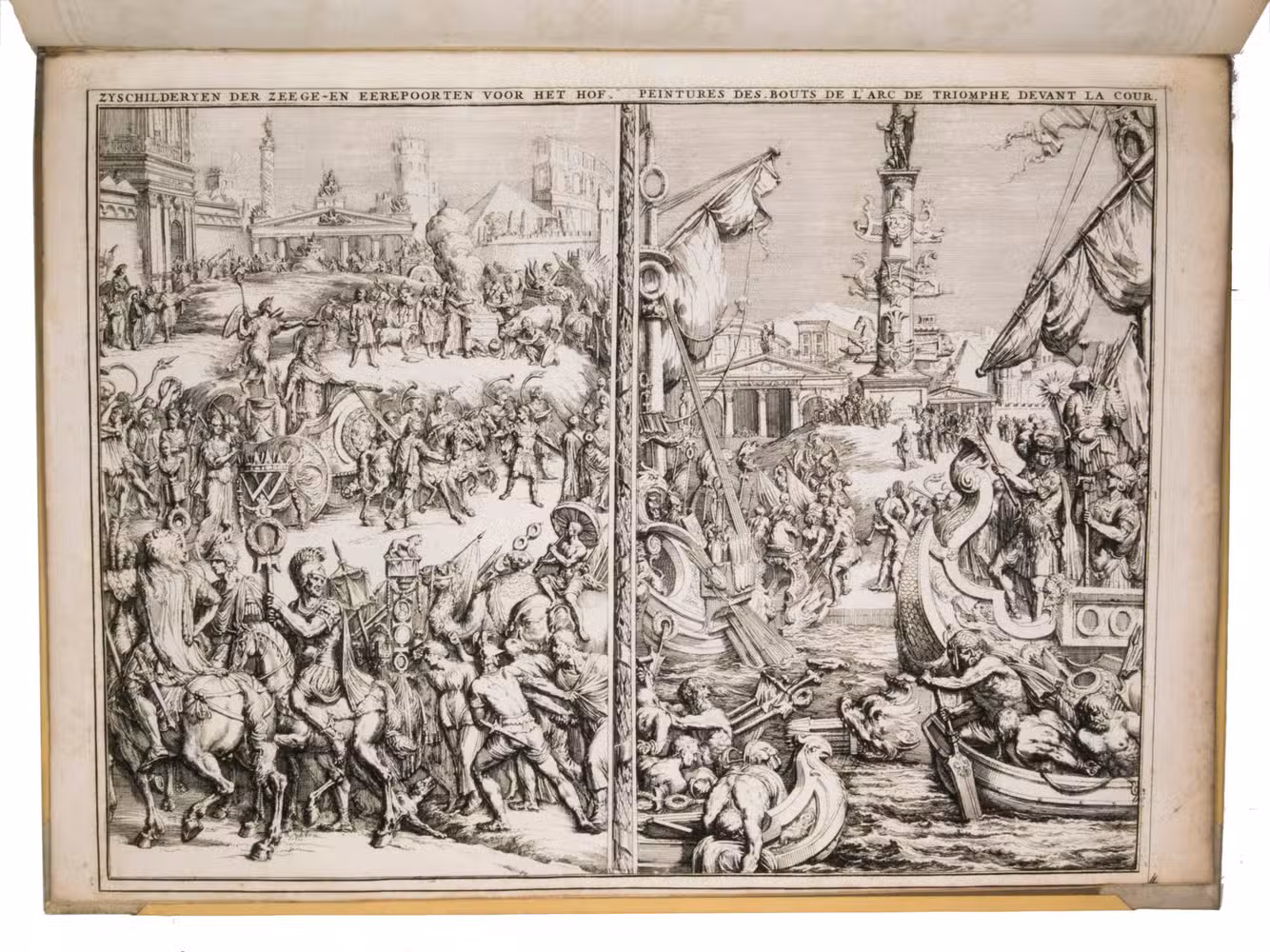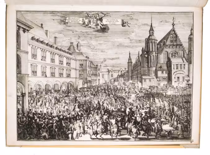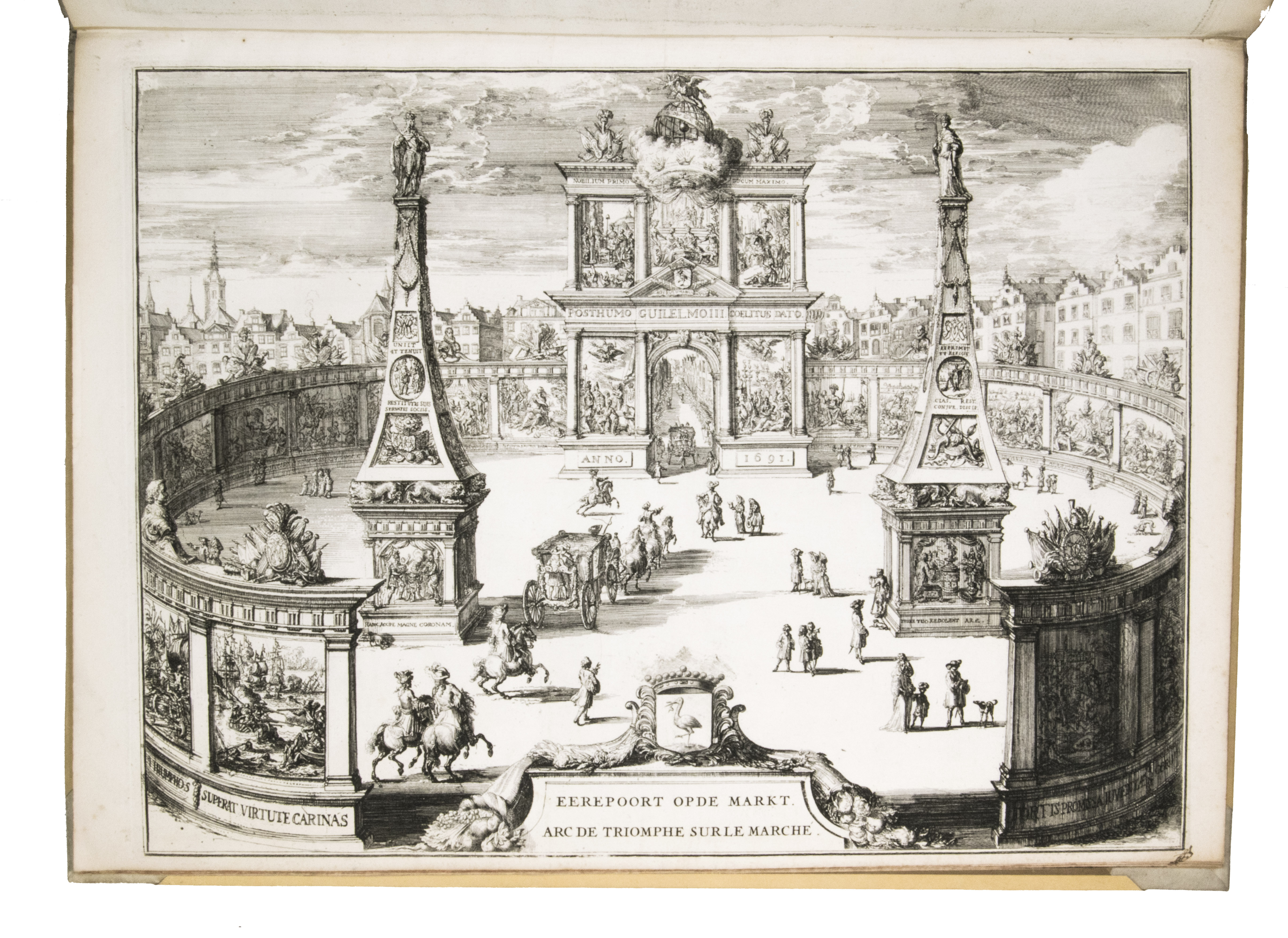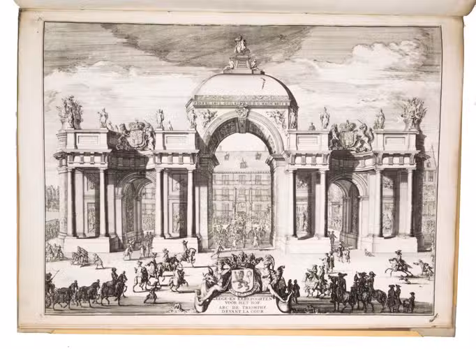 A complete set of the magnificent plates from the first French edition of one of the finest Dutch festival books, produced to commemorate the 1691 visit of the Dutch Stadtholder and English King William III of Orange to The Hague. The work was first published in Dutch in 1691 as Komste van Zyne Majesteit Willem III, comprising a text-volume by Govert Bidloo and an atlas-volume. King William III came to the Netherlands to attend a meeting of the allied forces at war with King Louis XIV of France. The city governors of The Hague made elaborate preparations, building four large triumphal arches covered with allegorical paintings and statues. The arch at the town market was accompanied by two obelisks, and painted walls that encircled the entire square.
