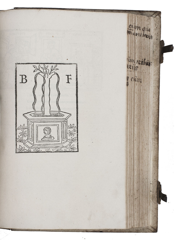 Reggio Emilia, Francesco de Mazalibus, 1503. With fine woodcut at the head of text, and some woodcut initials. 3 works in 1 volume. Folio. Contemporary blind-tooled vellum over wooden boards with 2 brass clasps. [264] ll.