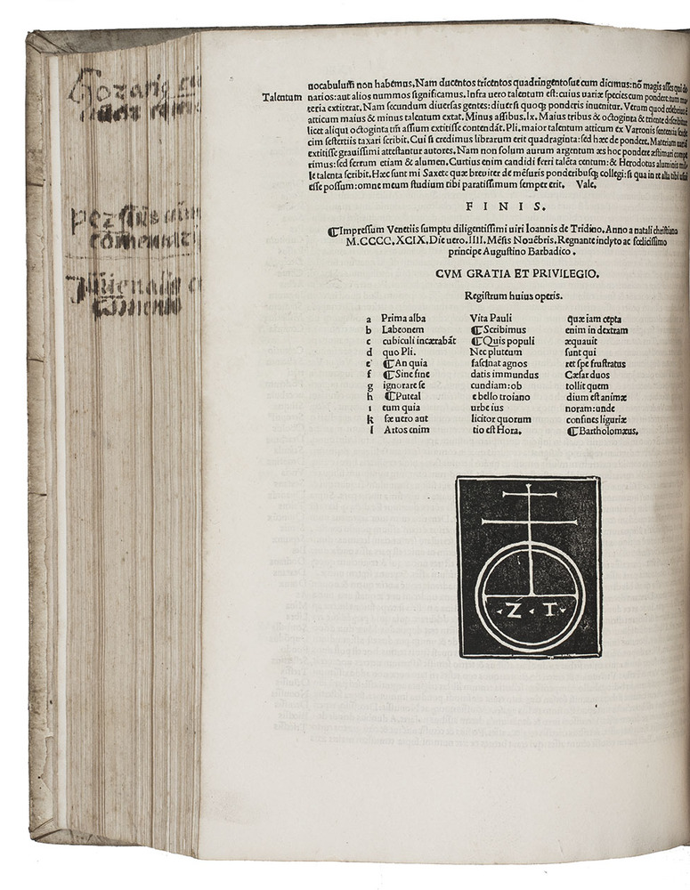 Venice, printed by Philippus Pincius for Benedictus Fontana, 1495-1496. With large woodcut printer's device on last leaf, and numerous woodcut initials.