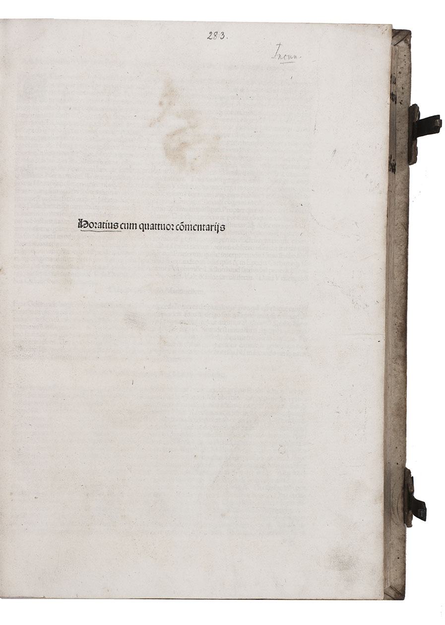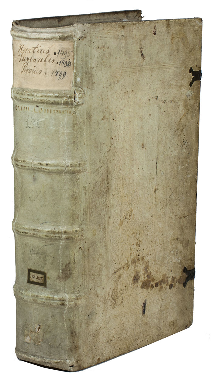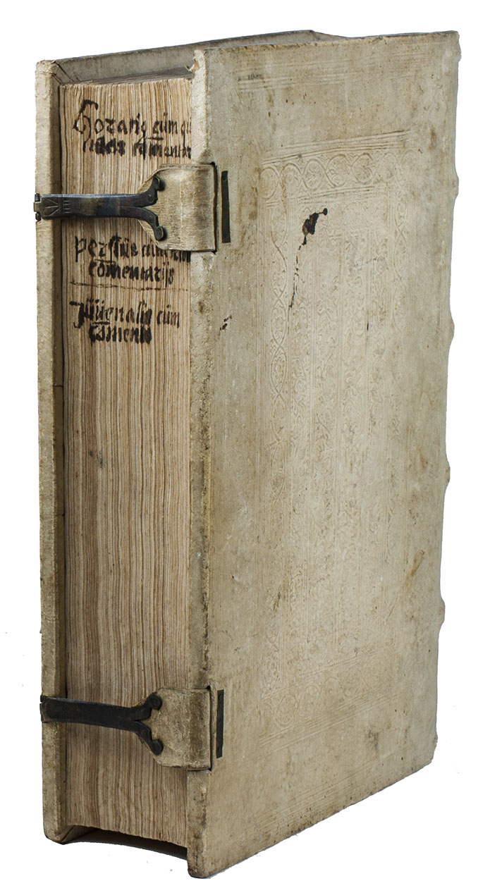 Superb Humanist "Sammelband" with the collected works of three classical authors, in a fine contemporary Strasbourg binding. The first work consists of the fifth-century pseudo-Acron scholia and the commentaries by the third-century scholar Porphyrion, and by two 15th-century humanists, Christophoro Landino and Antonio Mancinelli. The Persius appears here for the first time with the notes by three 15th-century Italians, Giovanni Britannico, Bartelomeo Fonti, and Giovanni Bonardi. The present Reggio Emilia imprint of the Juvenal is the second edition of Britannico's commentary, and is so rare that it was unknown to Schweiger.
