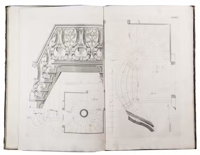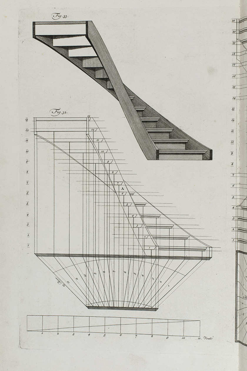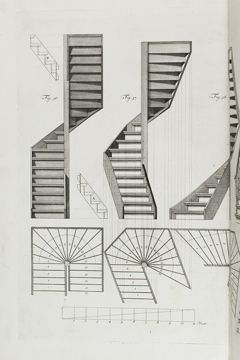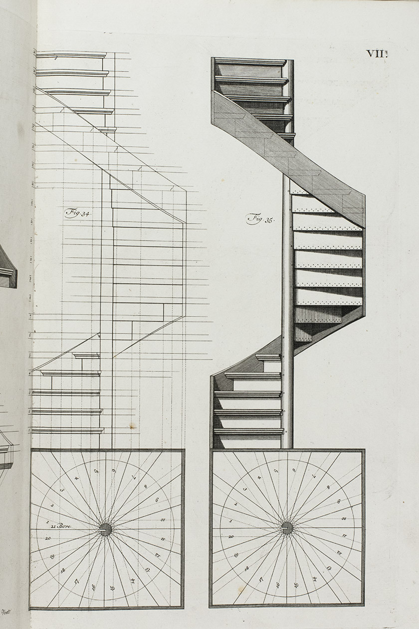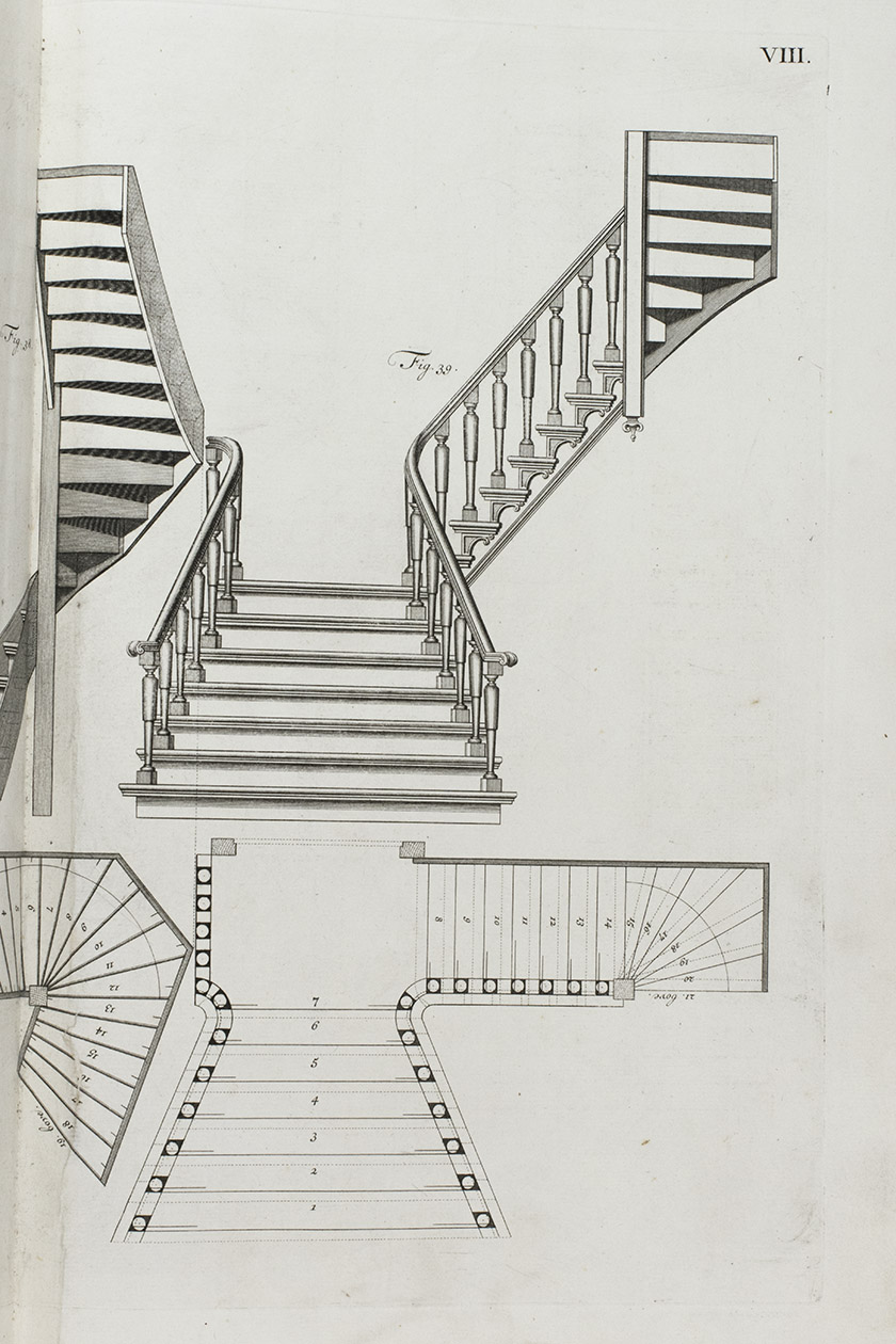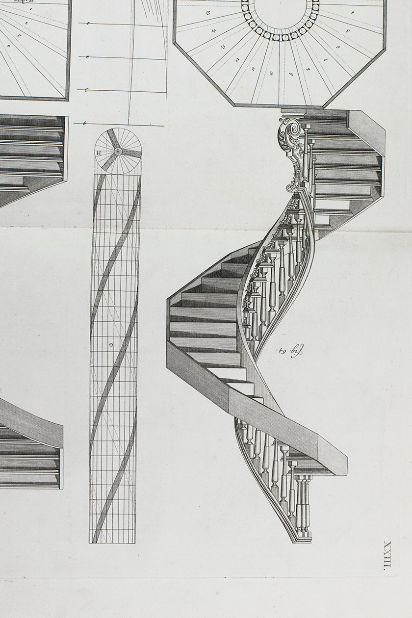 First edition of a classic set of architectural construction drawings in 30 large double-page plates primarily showing staircases and their decoration, but with the last five plates covering skylights intended for stairwells, some in the form of elaborate cupolas. With the rare text-volume, providing explanation to the illustrations in the plates-volume. The plates show straight, spiral and more complicated staircases, with their geometrical constructions, as well as many elaborate decorative forms for the posts, railings, skylights, etc.