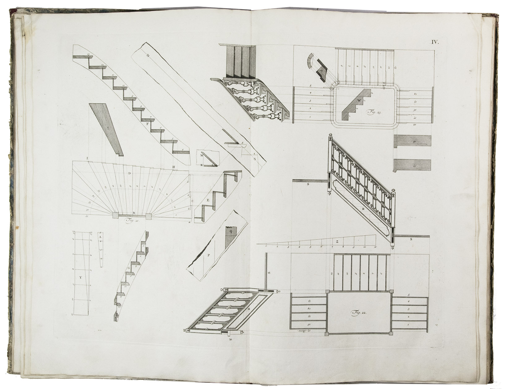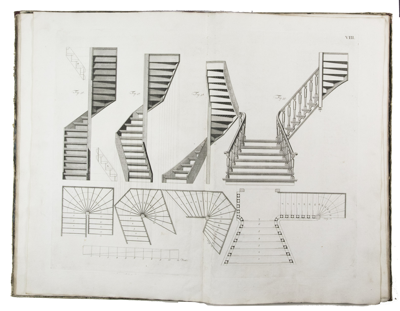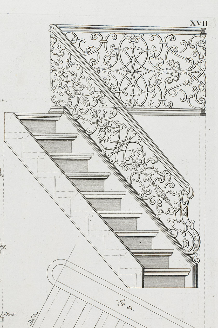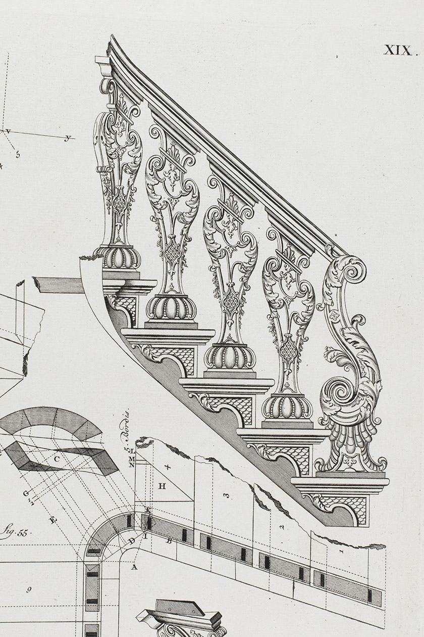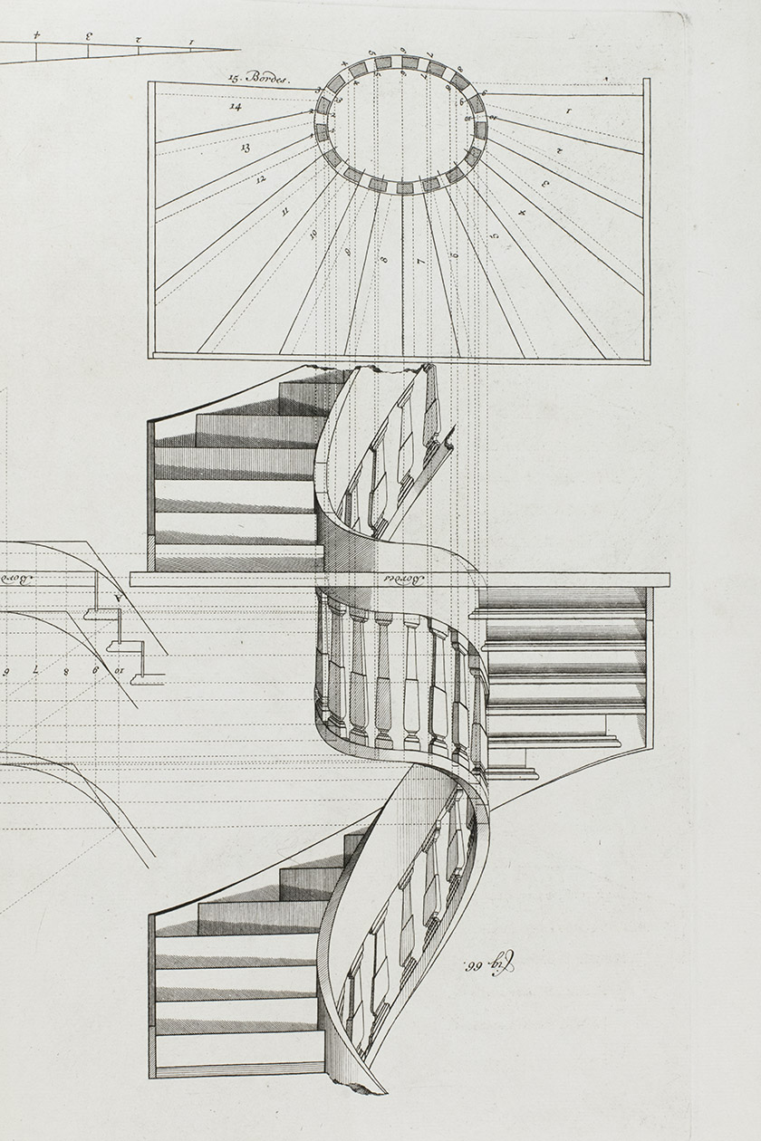 First edition of a classic set of architectural construction drawings in 30 large double-page plates primarily showing staircases and their decoration, but with the last five plates covering skylights intended for stairwells, some in the form of elaborate cupolas. With the rare text-volume, providing explanation to the illustrations in the plates-volume. The plates show straight, spiral and more complicated staircases, with their geometrical constructions, as well as many elaborate decorative forms for the posts, railings, skylights, etc.