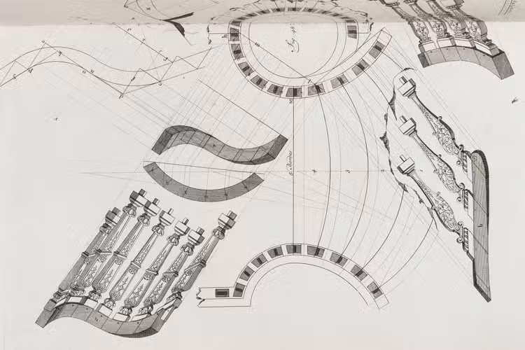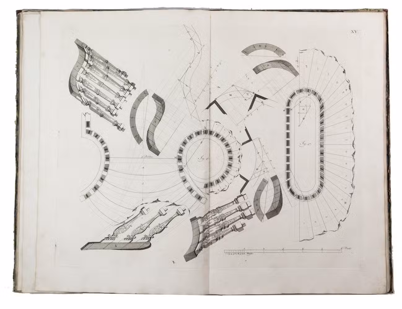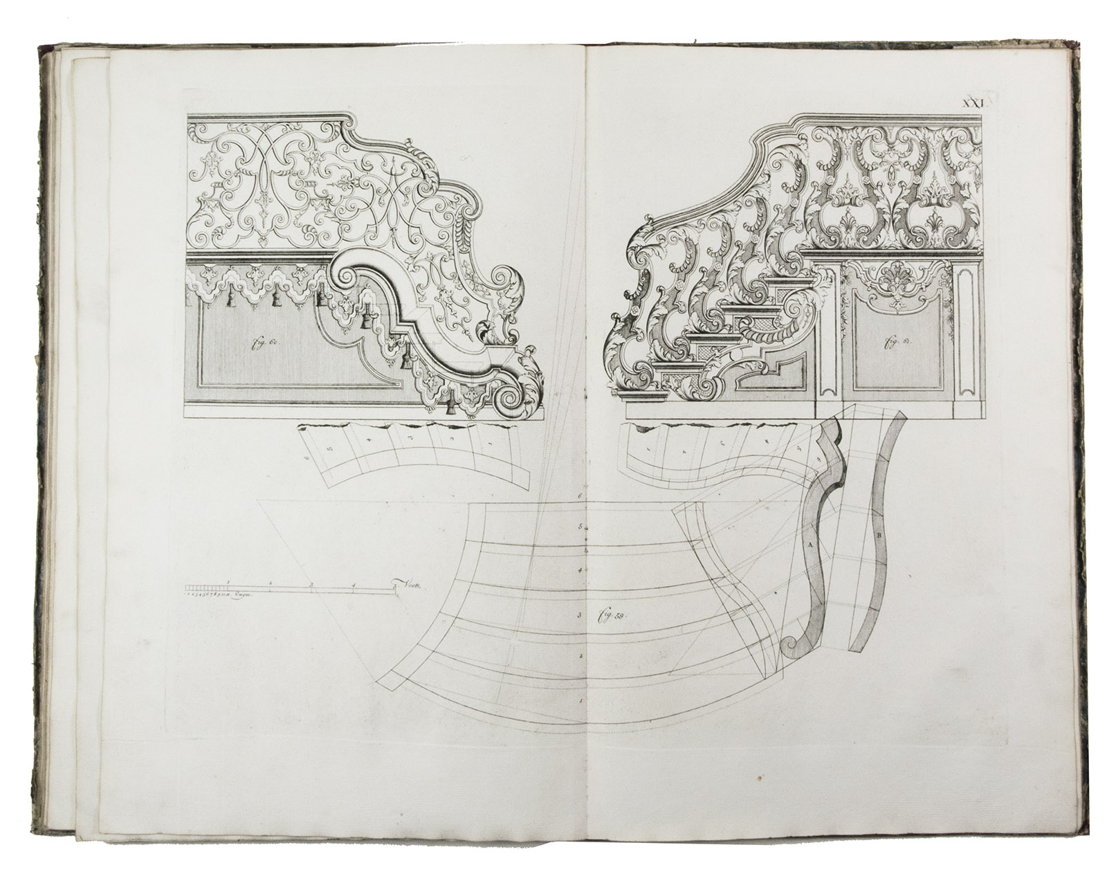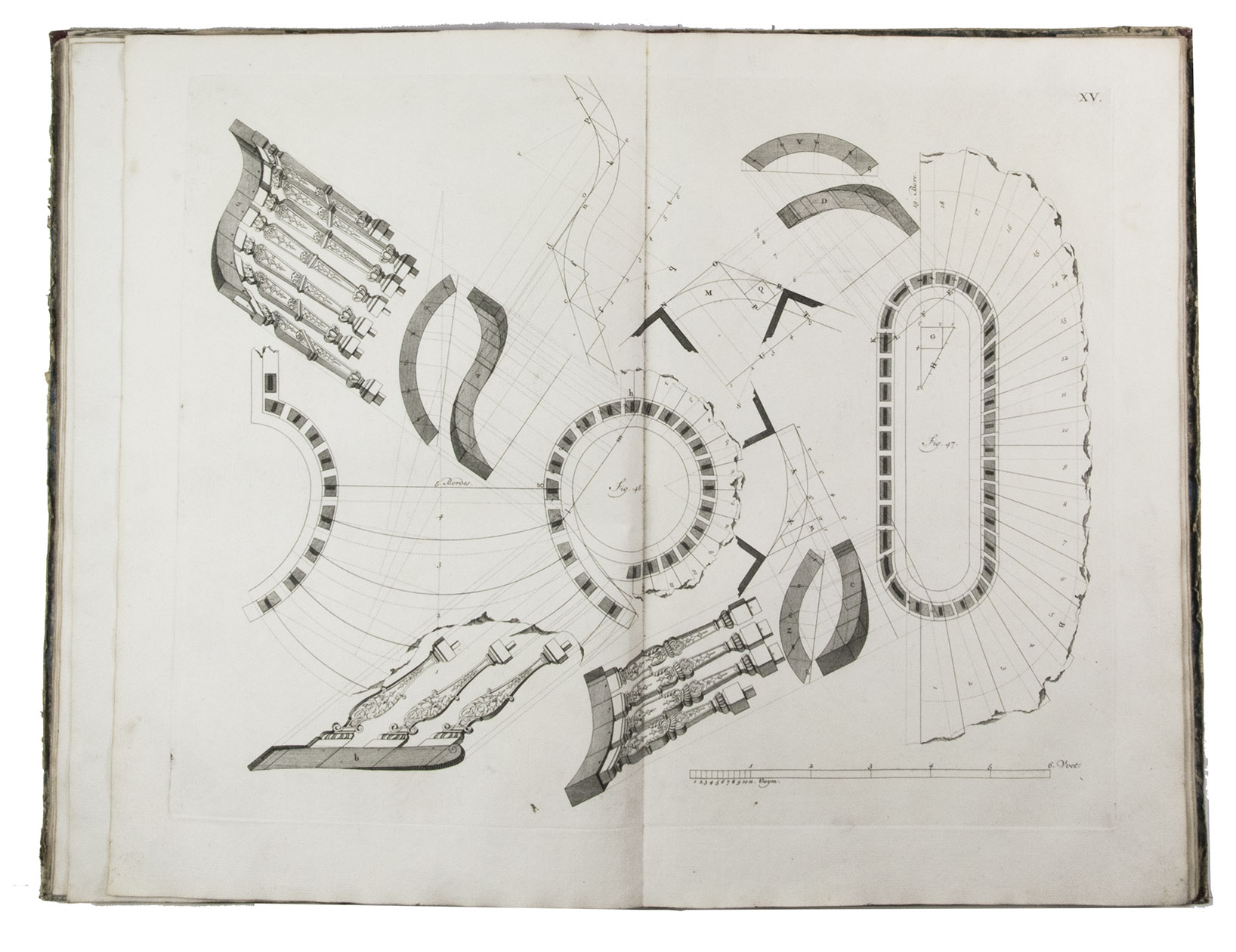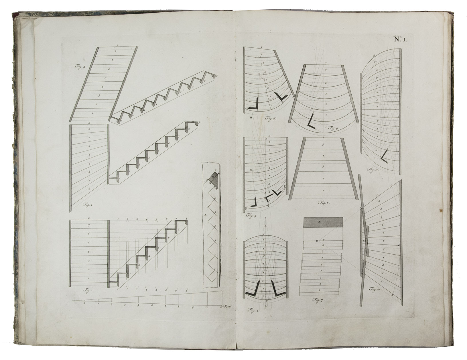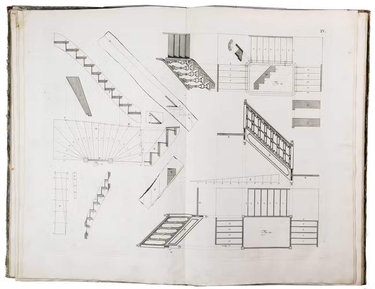 First edition of a classic set of architectural construction drawings in 30 large double-page plates primarily showing staircases and their decoration, but with the last five plates covering skylights intended for stairwells, some in the form of elaborate cupolas. With the rare text-volume, providing explanation to the illustrations in the plates-volume. The plates show straight, spiral and more complicated staircases, with their geometrical constructions, as well as many elaborate decorative forms for the posts, railings, skylights, etc.