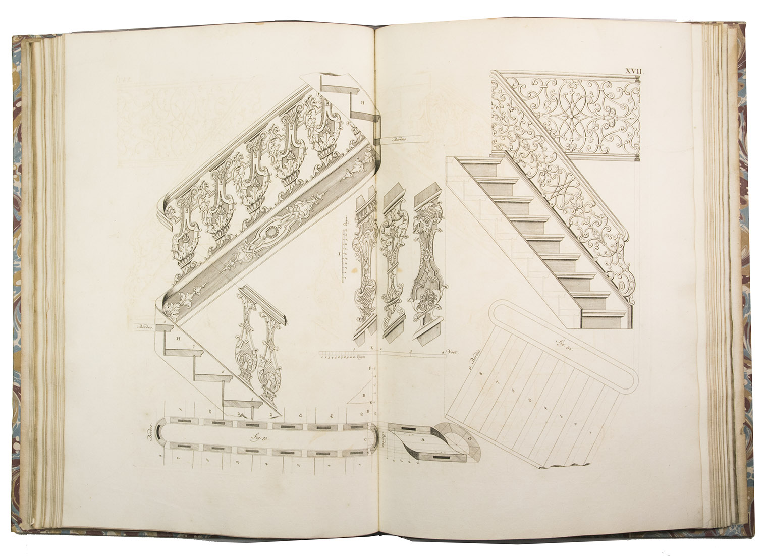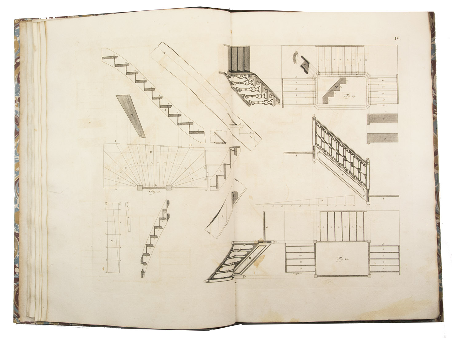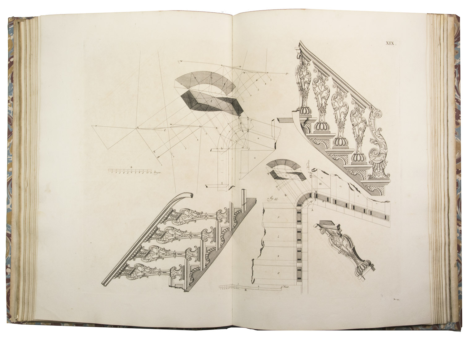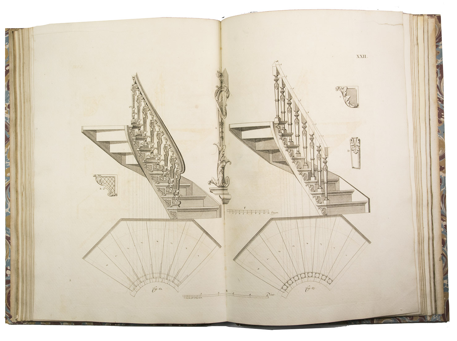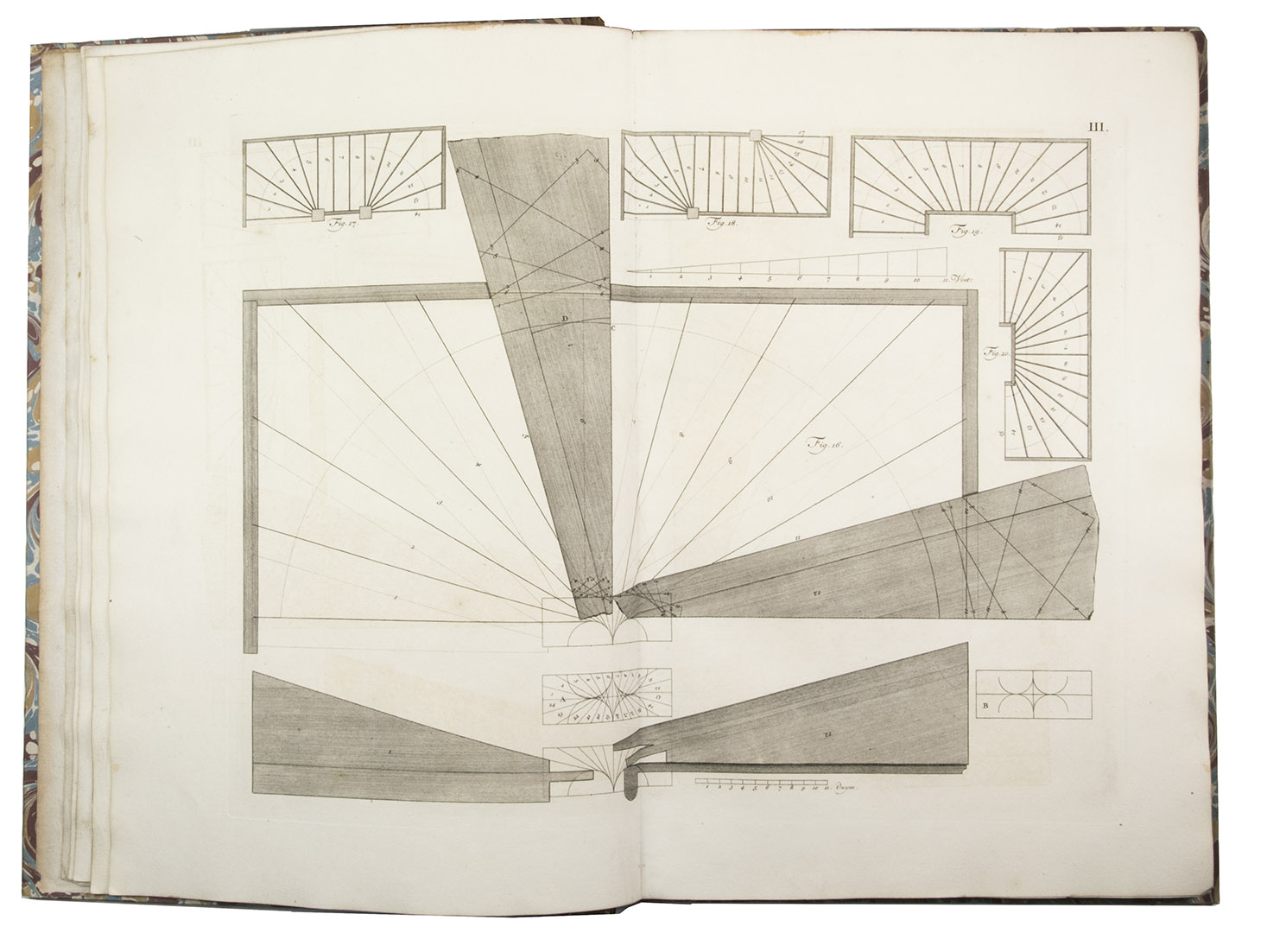 Very rare second edition of this classic set of architectural construction drawings in 30 large double-page plates primarily showing staircases and their decoration, but with the last five plates covering skylights intended for stairwells, some in the form of elaborate cupolas. The plates show straight, spiral and more complicated staircases, with their geometrical constructions, as well as many elaborate decorative forms for the posts, railings, skylights, etc.