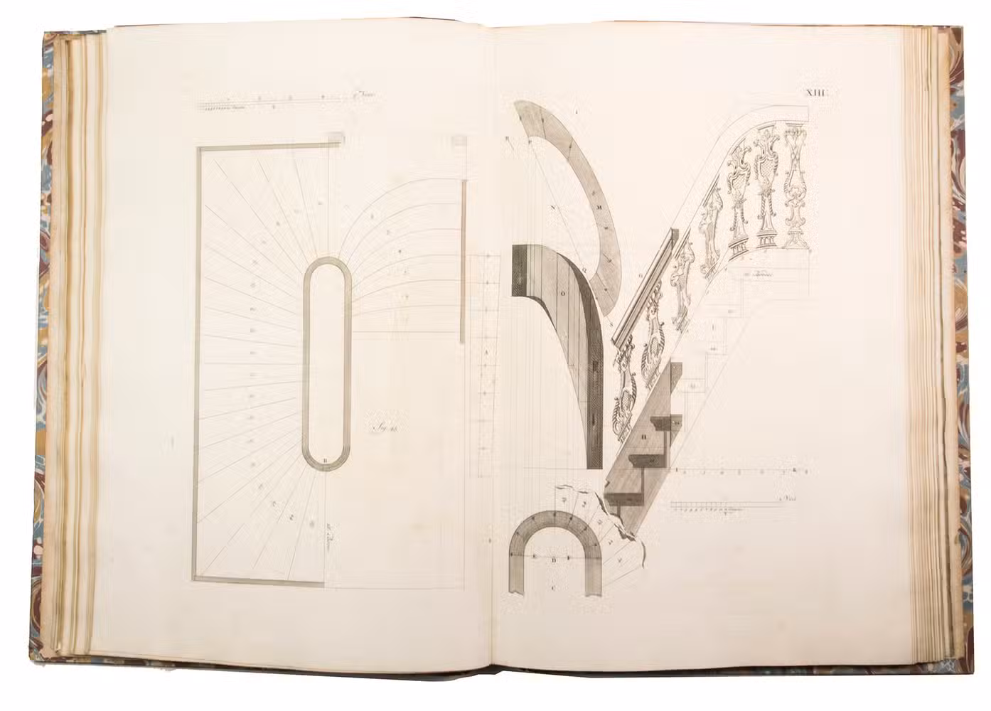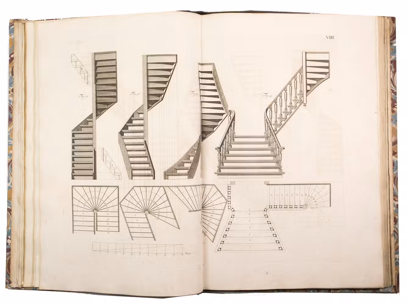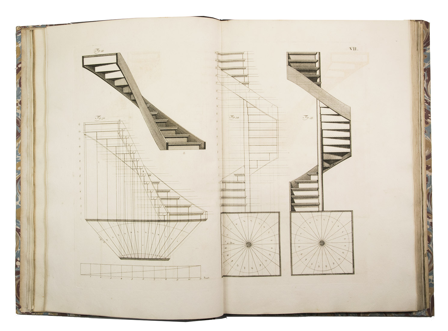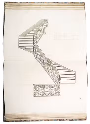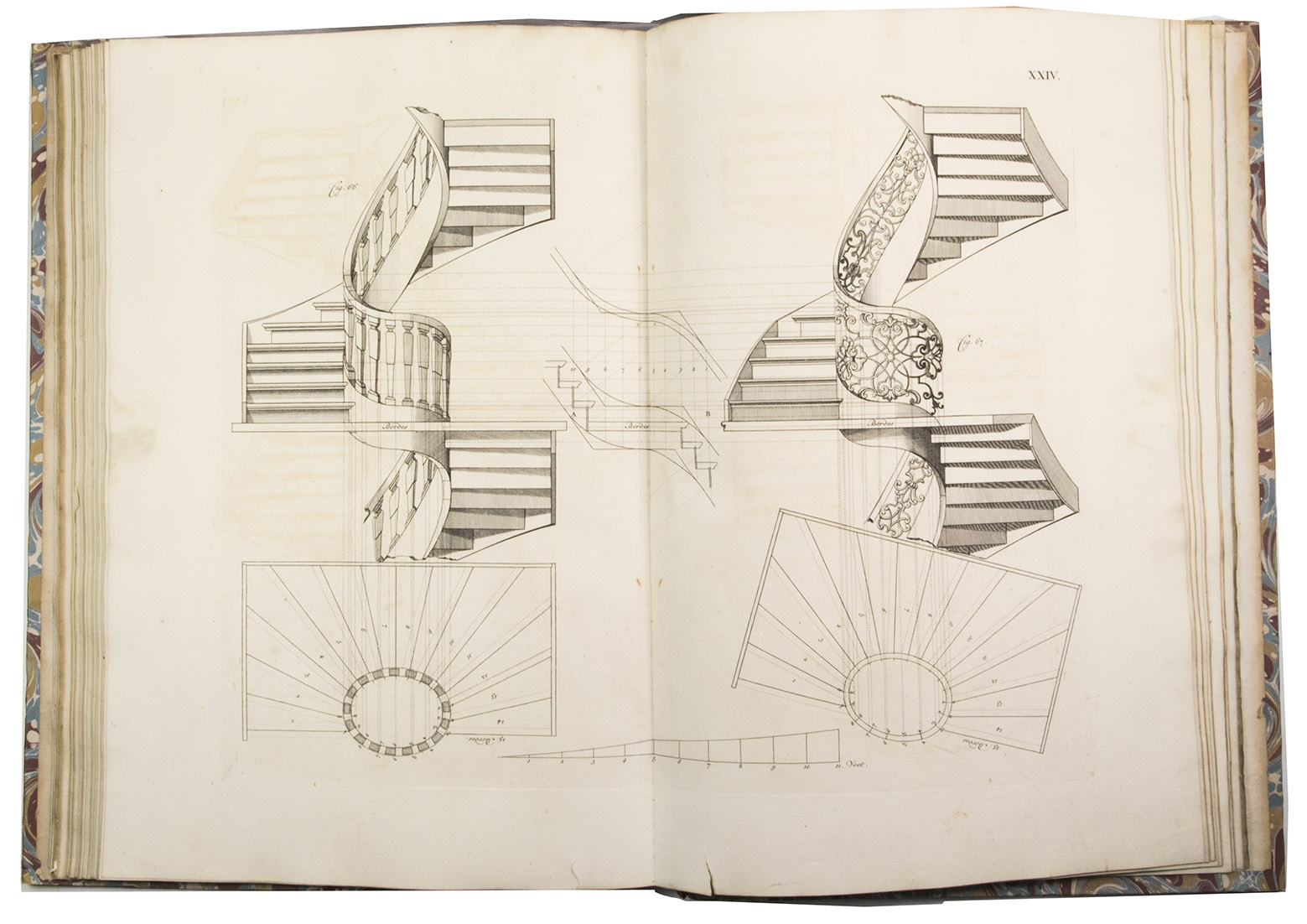 Very rare second edition of this classic set of architectural construction drawings in 30 large double-page plates primarily showing staircases and their decoration, but with the last five plates covering skylights intended for stairwells, some in the form of elaborate cupolas. The plates show straight, spiral and more complicated staircases, with their geometrical constructions, as well as many elaborate decorative forms for the posts, railings, skylights, etc.