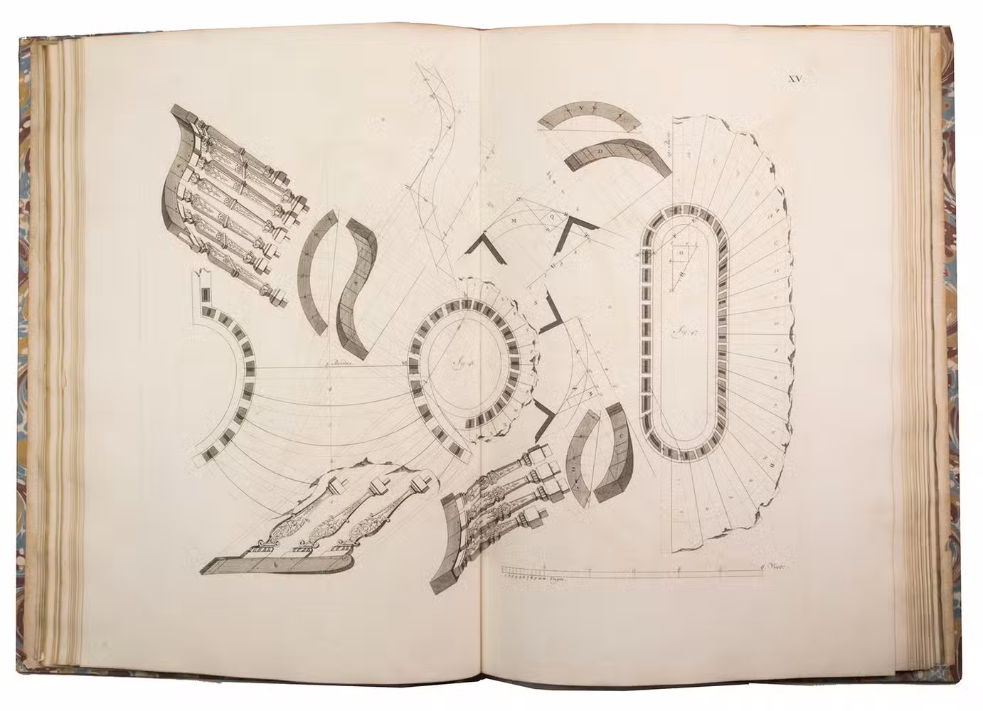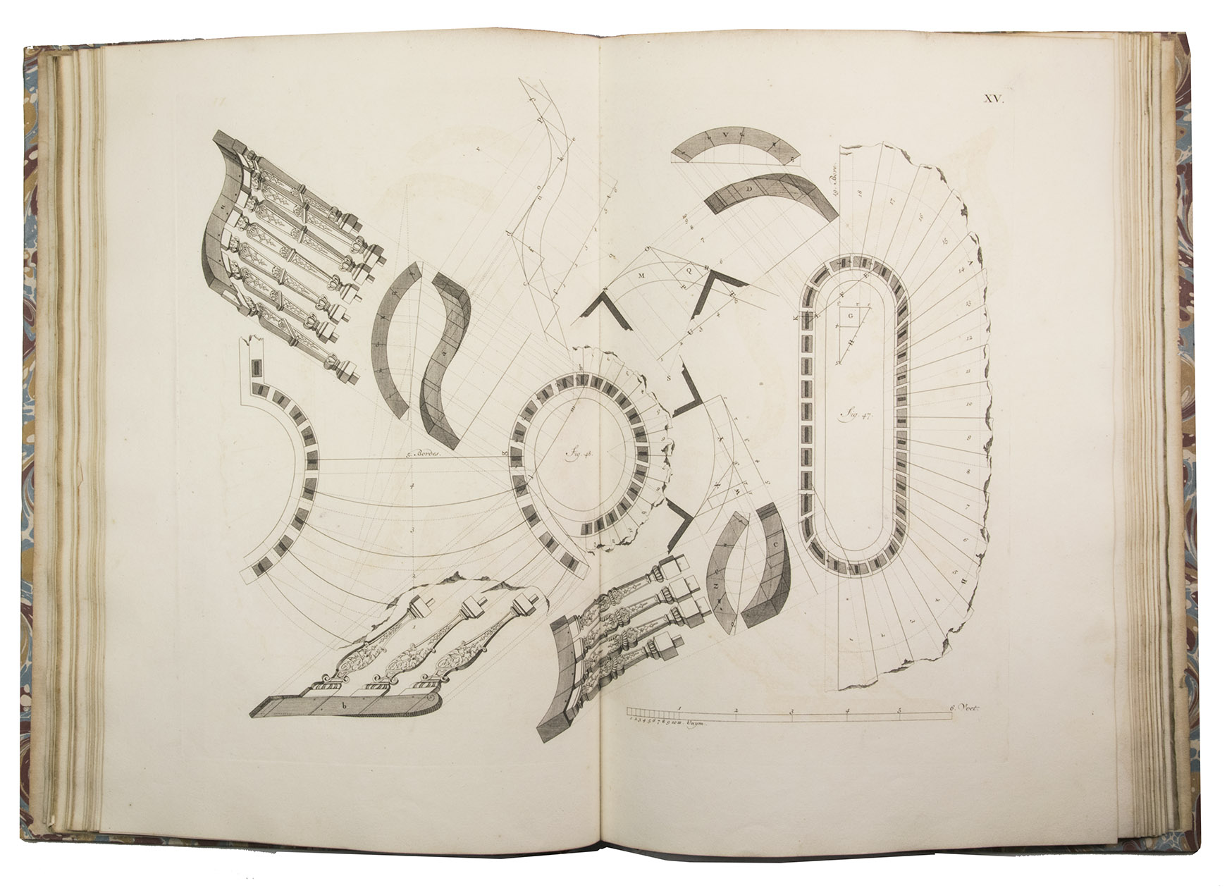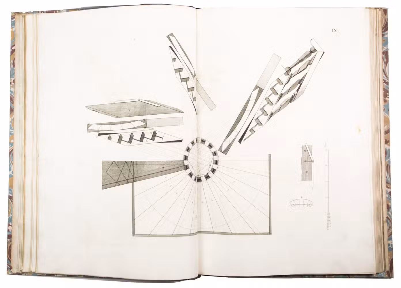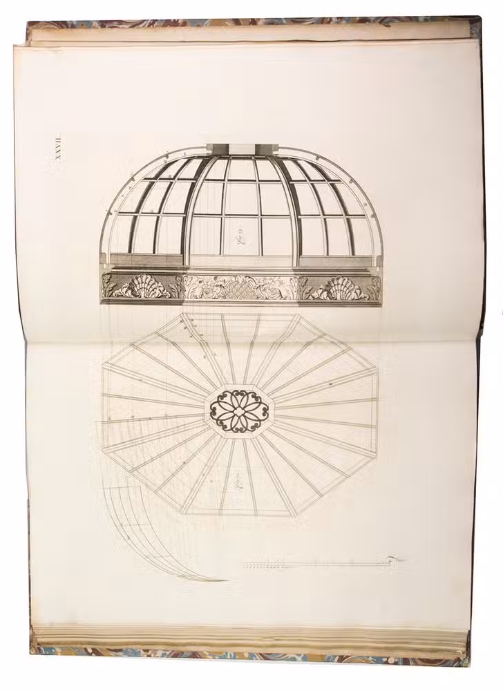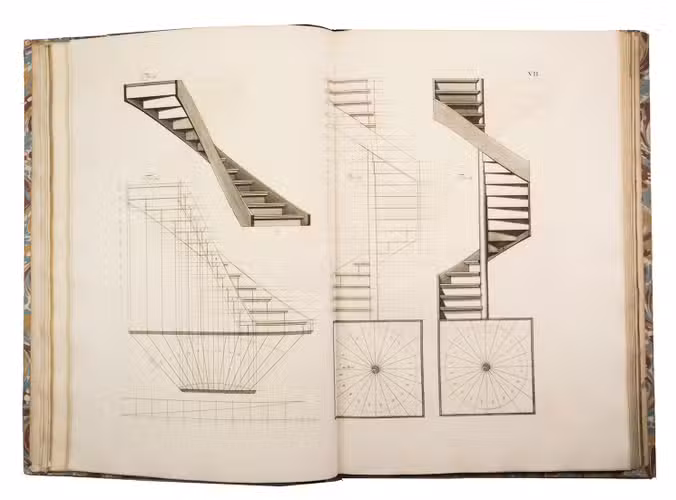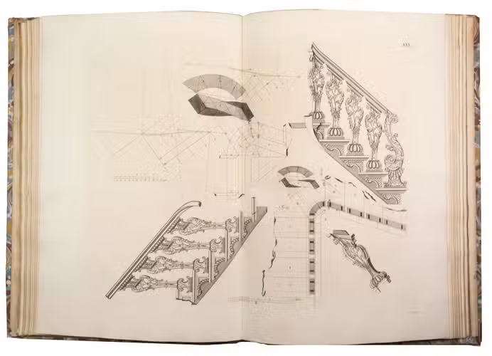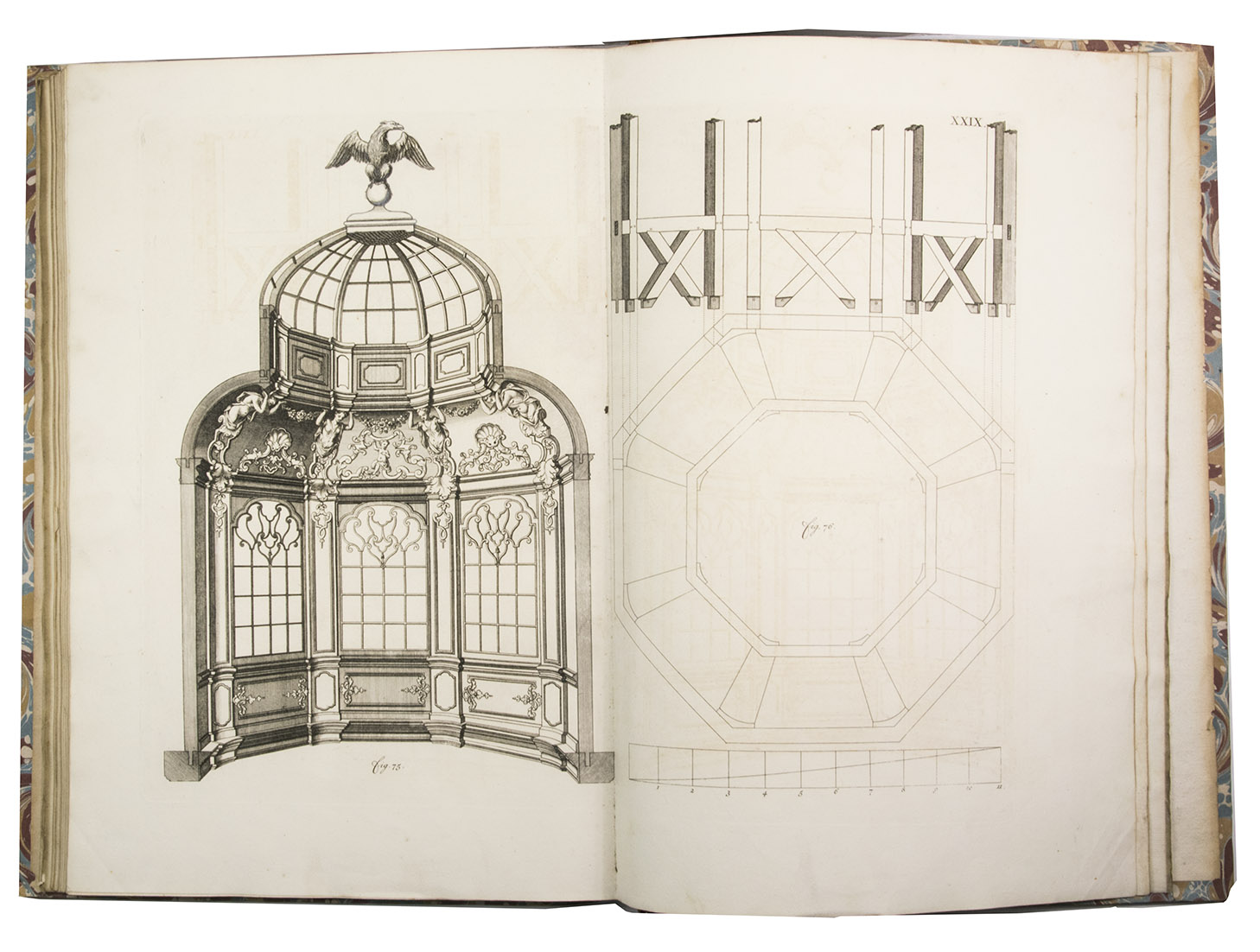 Very rare second edition of this classic set of architectural construction drawings in 30 large double-page plates primarily showing staircases and their decoration, but with the last five plates covering skylights intended for stairwells, some in the form of elaborate cupolas. The plates show straight, spiral and more complicated staircases, with their geometrical constructions, as well as many elaborate decorative forms for the posts, railings, skylights, etc.