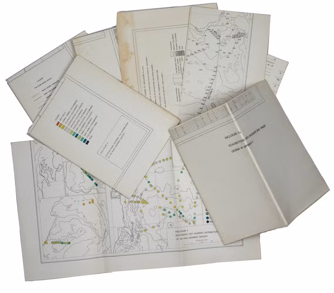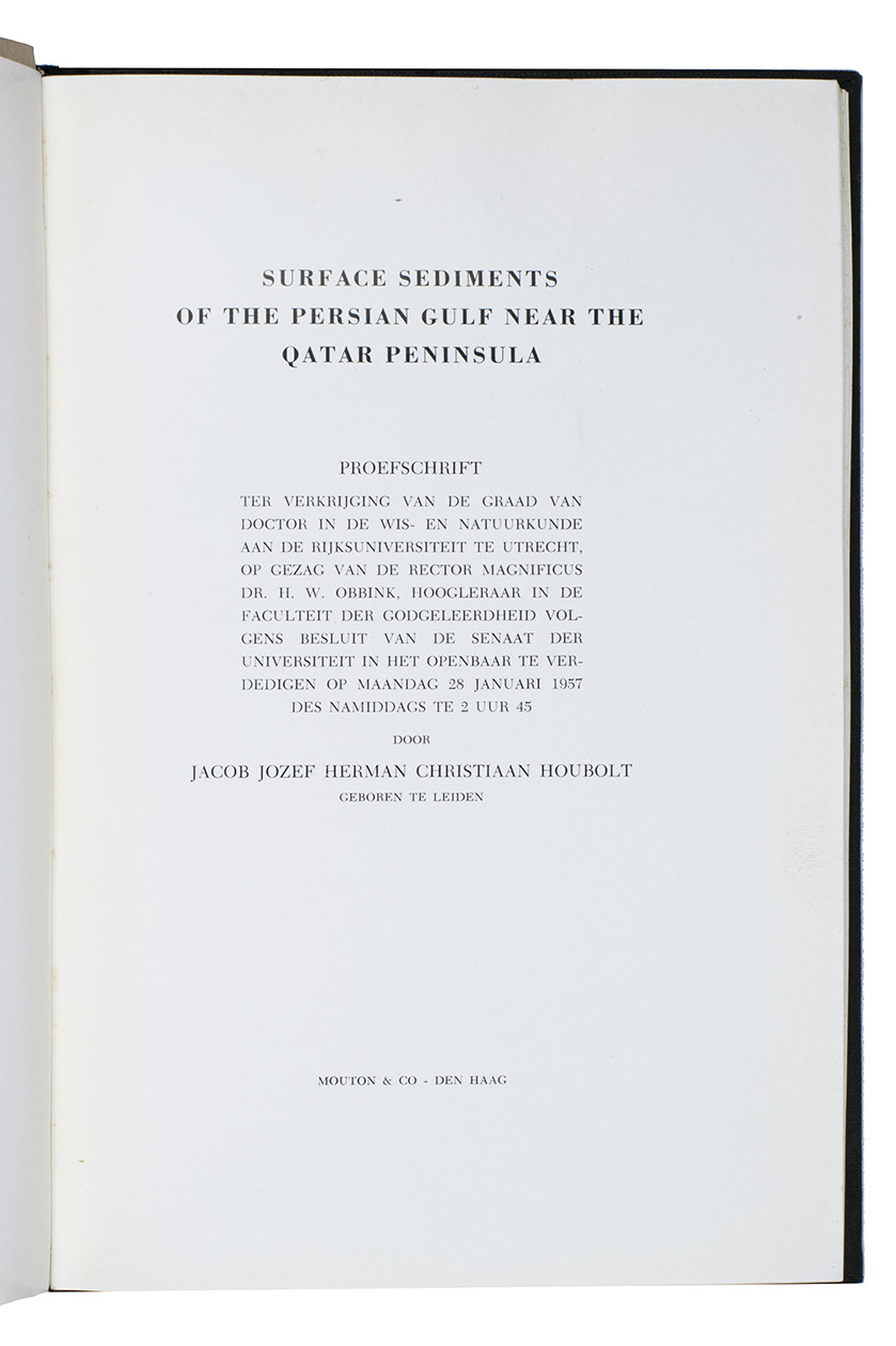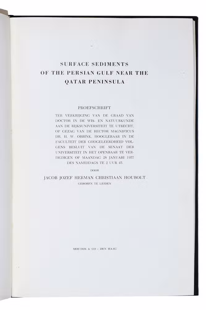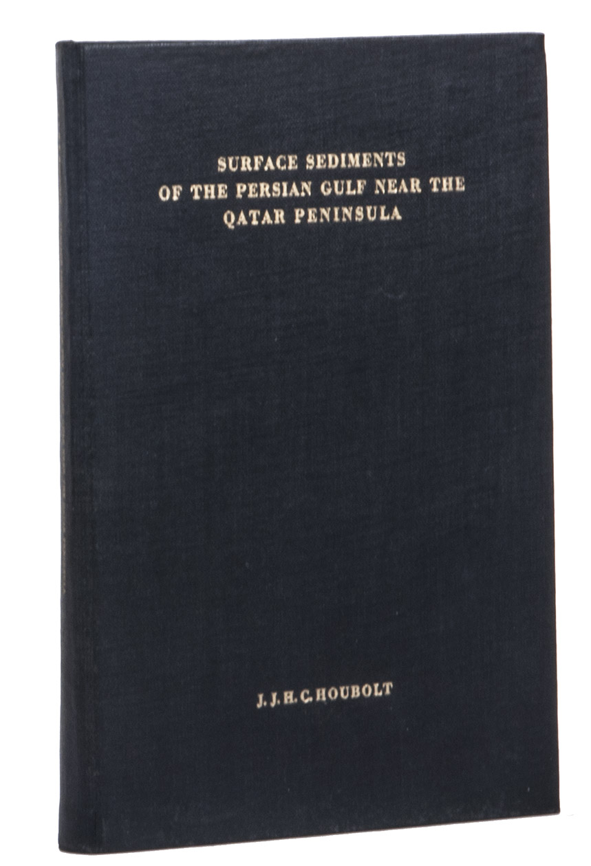 First edition of a thesis on sediment samples of the Arabian Gulf, by the Dutch Jacob Jozef Herman Christiaan Houbolt. He mentions in his preface that the samples were "collected as a sideline of operational activities in the marine concession of Shell Company of Qatar". Houbolt describes the climate and topography of the Arabian Gulf, the relief sea bottom in the Arabian Gulf, his methods of investigation, the composition of the sediment, and his results.