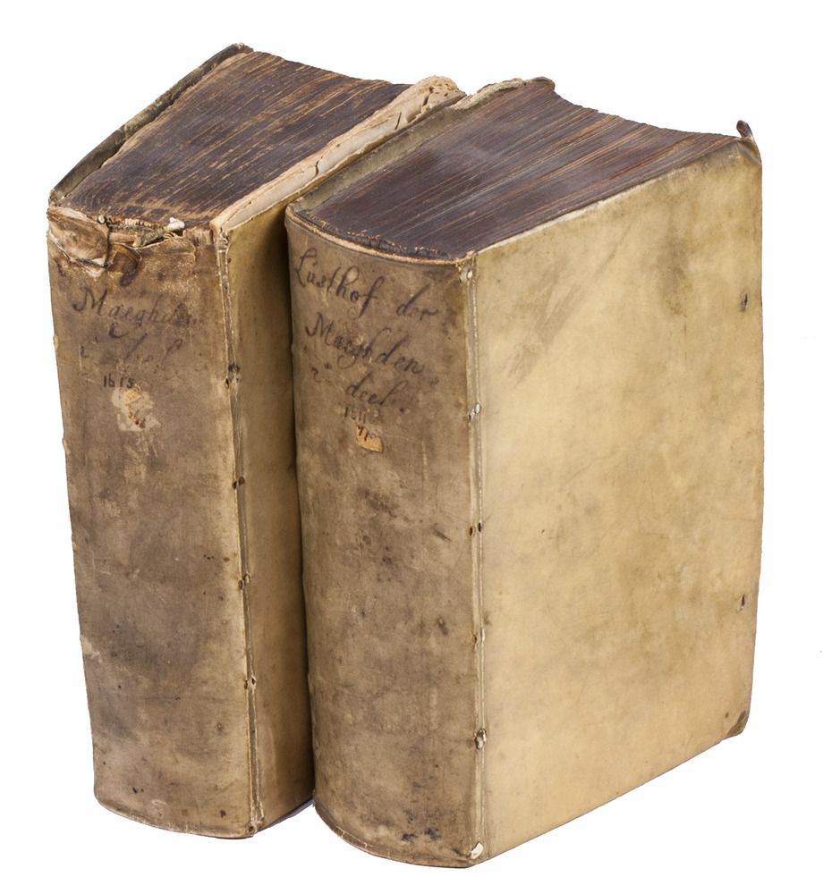 Mixed set. Title-page of the second volume slightly stained, only occasionally a few small spots. Spine of volume 1 slightly damaged at the head. Overall in very good condition. Volume 1: Bibl. Belg. III, H17; STCN 832699144 (6 copies); volume 2: Bibl. Belg. III, H16; Carter-Vervliet 328; STCN 833702424 (3 copies).